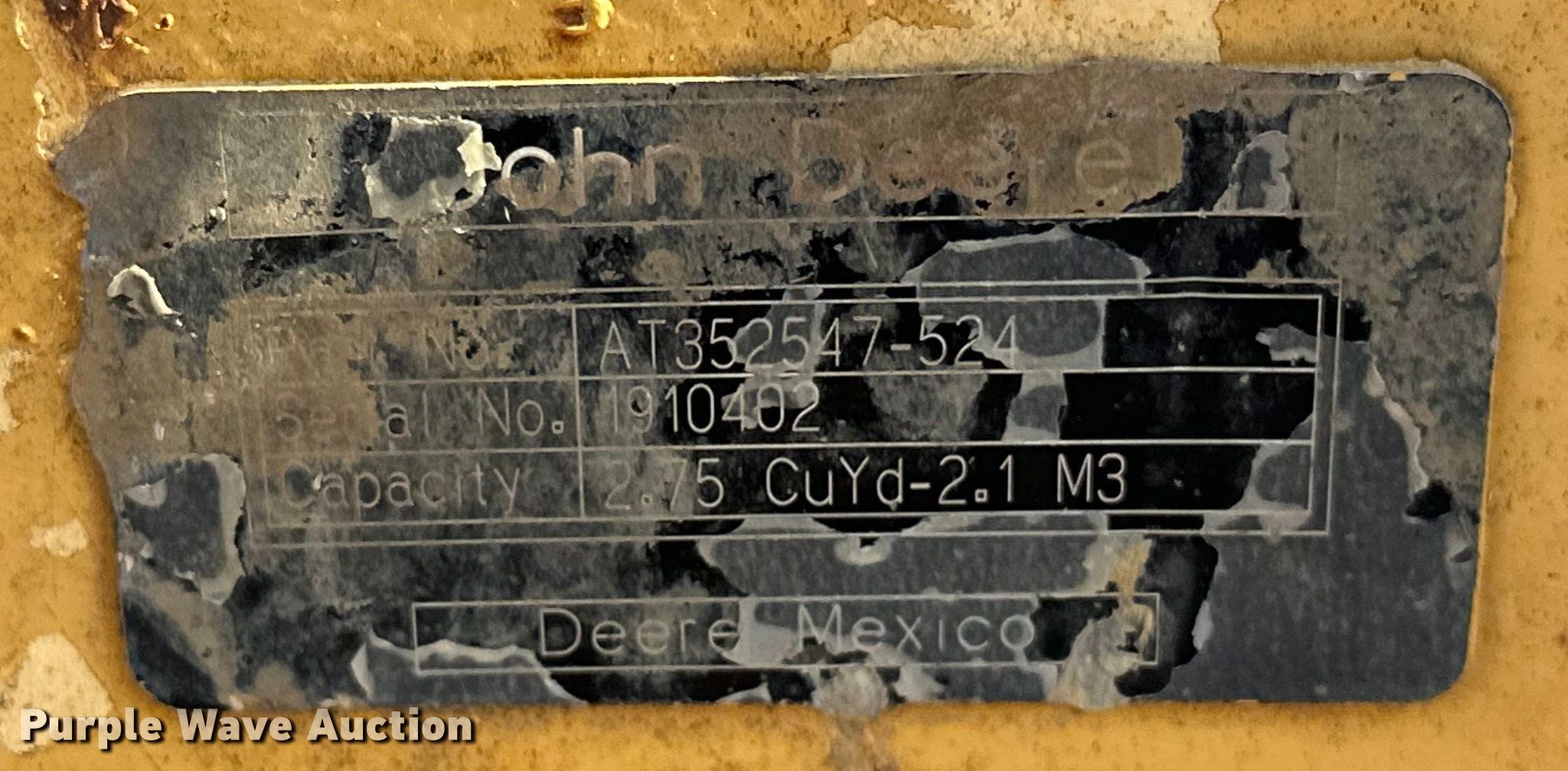 2009 John Deere 524K wheel loader. Hours: 11,327 on meter, Miles or hours may vary, unit still in use, Serial: DW524KZ625199. Engine Cylinders: 6, Fuel type: Diesel. Transmission Powershift, 4F - 3R, Differential lock. Operators station Enclosed cab, AC, Heat, Bucket controls: Joystick. Features Quick coupler: Hydraulic, Counter weights, Bucket John Deere, Capacity: 2.75 cu.yd., Width: 100", Cutting edge: Bolt-on, Forks Length: 60". Tires Size: 10.5R25. Notes Unknown operating condition of AC, Glass cracked. Cherokee Builders Inc. Tulsa, OK 74116