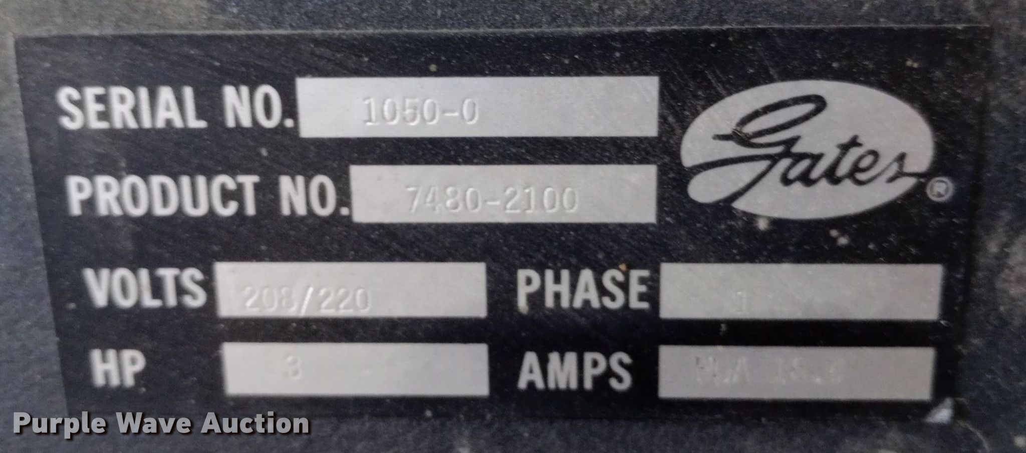 Gates Omni Crimp 21 hydraulic hose crimping machine. Serial: 1050-0. Electric Motor HP: 3, Volts: 208/220, Phase: Single. Source HDD, LLC. Hutchinson, KS 67501