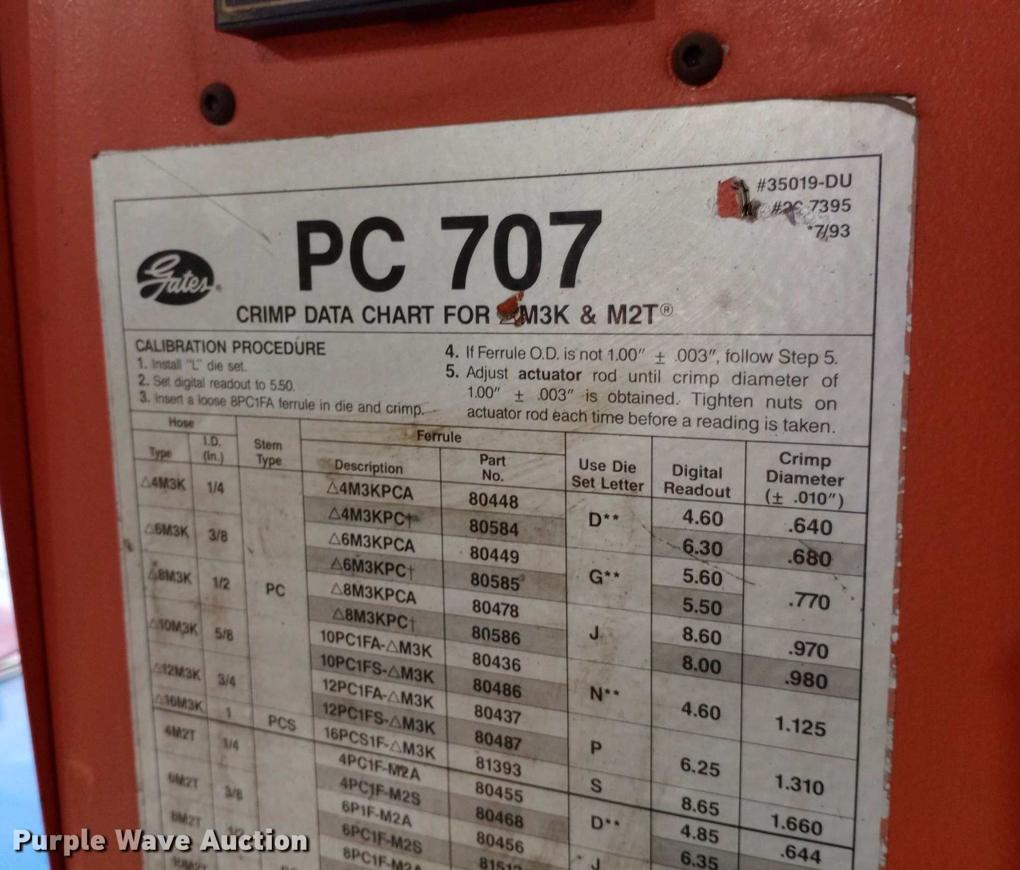 Gates PC 707 hose crimper has sold in Hutchinson, Kansas for $2365. Item DP1208 sold on August 8th, 2024.