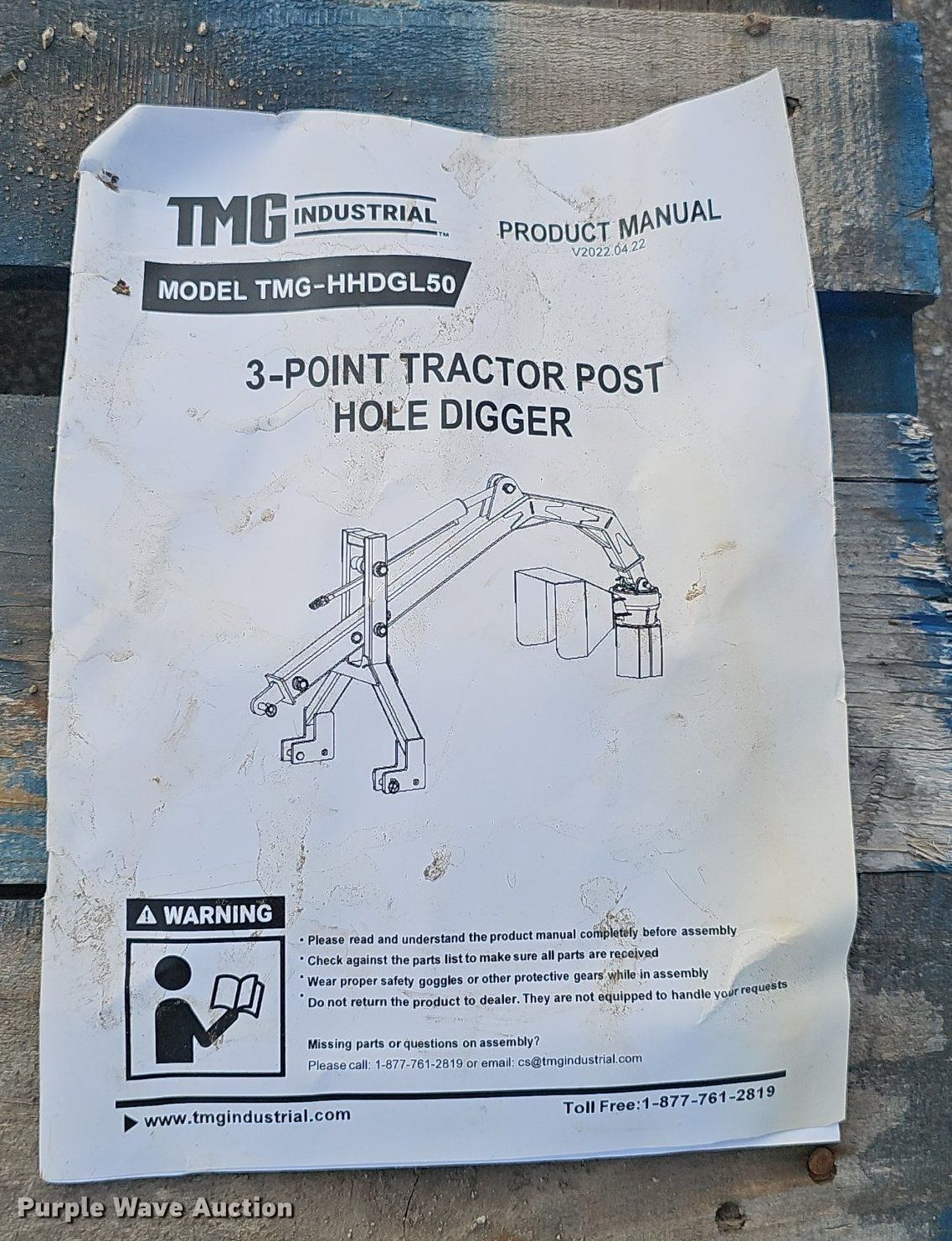 TMG Industrial TPD12 post hole auger. Serial: U230811048. Features Auger Diameter: 12", Length: 48", Hitch: Three point, PTO shaft. Notes Unused, Owners manual. Jordan Machinery/ S & N Auto Sales. 25050 US Hwy 275. Waterloo, NE 68069