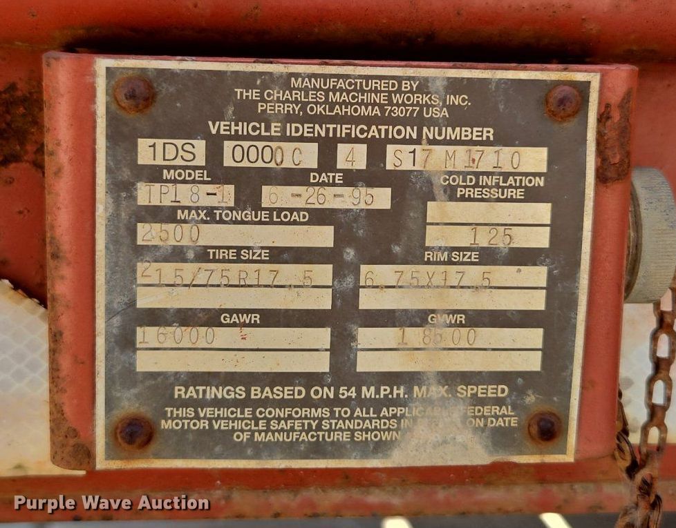 Purple Wave is selling a used Equip. Trailer in Kansas. This item is a 1995 Charles Machine Works TP18-1 equipment trailer with the following: VIN: 1DS0000C4S17M1710