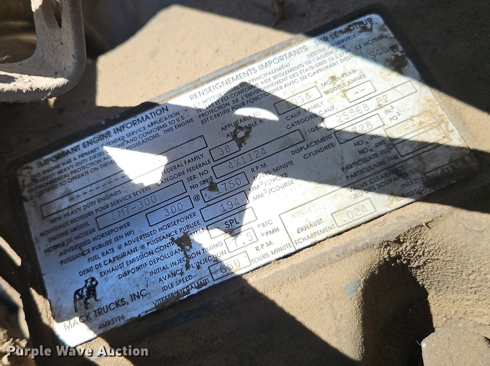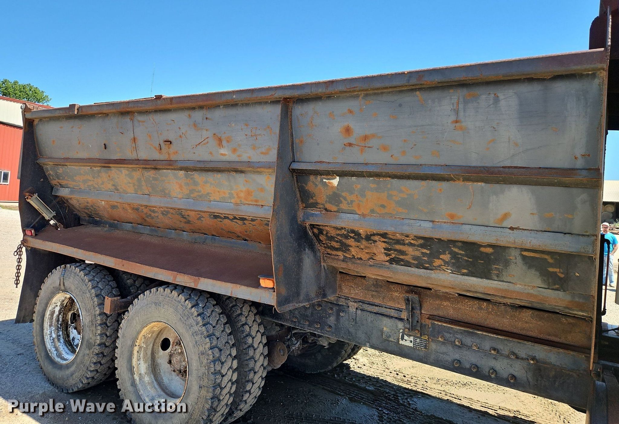 1990 Mack CH613 dump truck. Miles: 544,326 on odometer, VIN: 1M2AA12YXLW007562. Engine Mack EM7-300, Displacement: 12.0L, Cylinders: 6, Fuel type: Diesel. Transmission Mack, Manual, Speed: 7. Chassis Axles: Tandem, Suspension: Camelback, Brakes: Air, PTO. Interior AC, Heat. Features Dump bed 15' L x 102" W, Side height: 49", Bed type: Barrel, Roll tarp, Ram: Single, End gate: Air operated. Tires Front: 275/80R22.5, Rear: 11R22.5. Notes Windshield chipped or cracked, AC compressor belt missing. Kansas title. Title distribution may be delayed up to 14 days from verification of funds. Segebartt Farms. Hepler, KS 66746