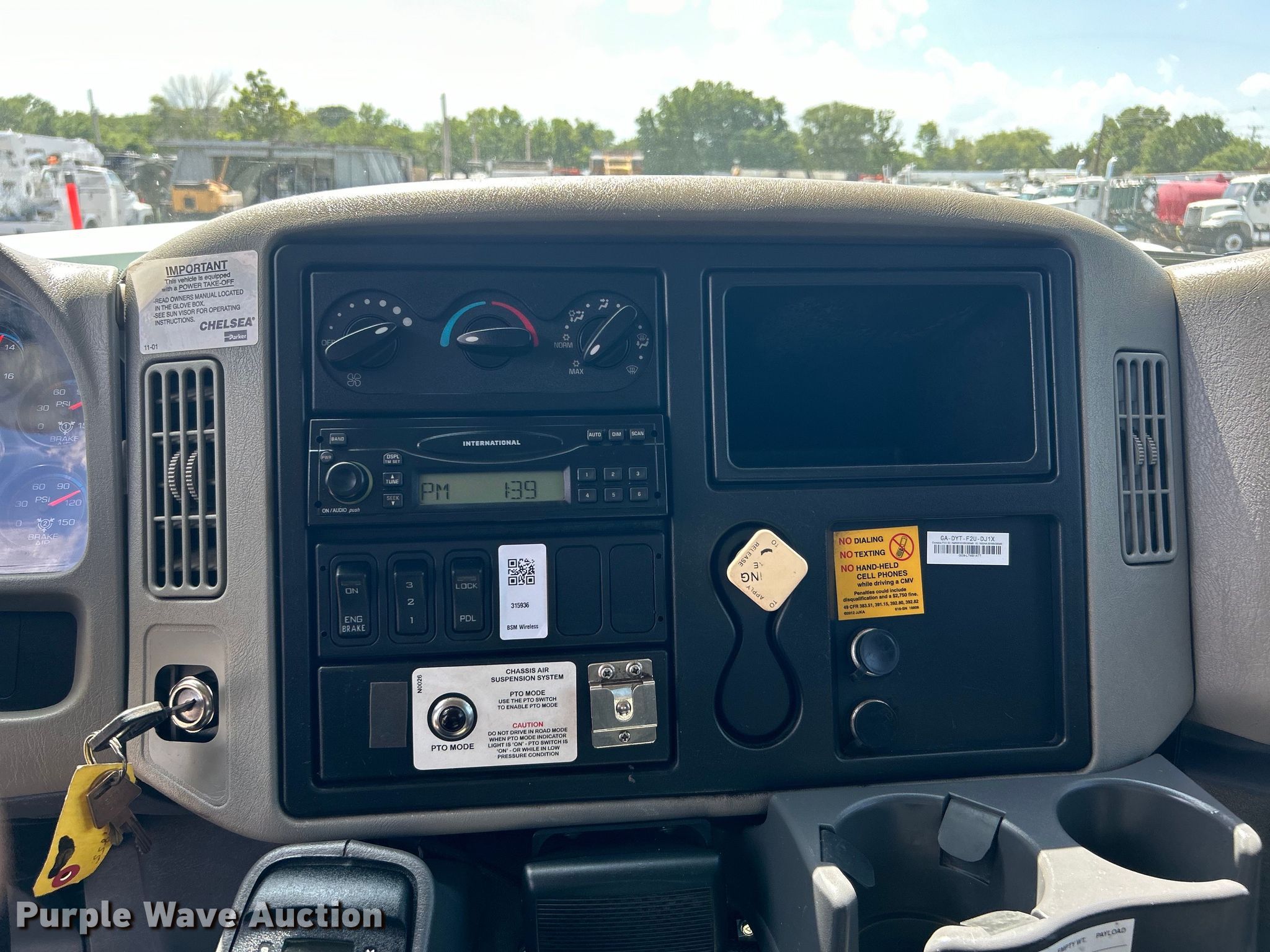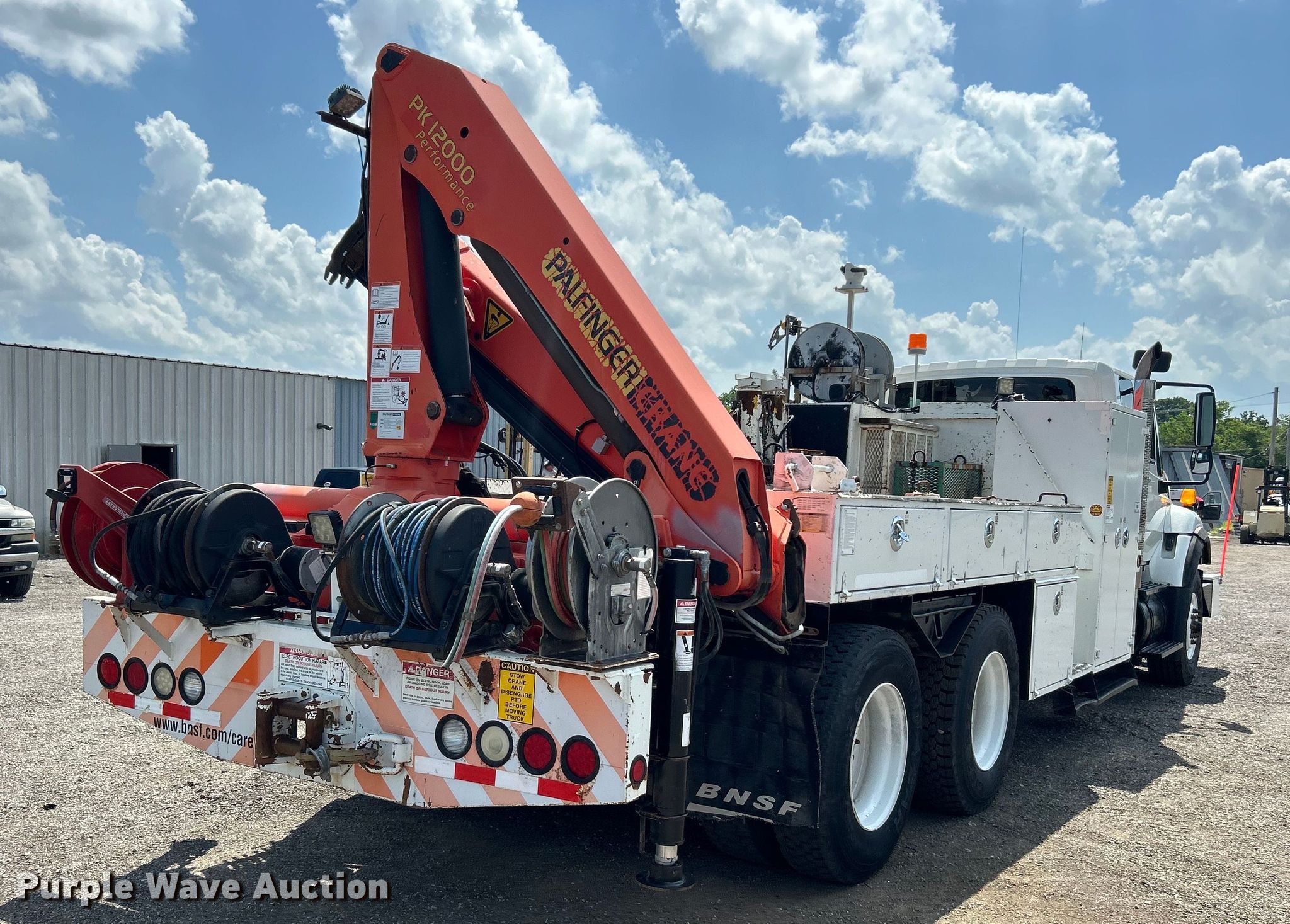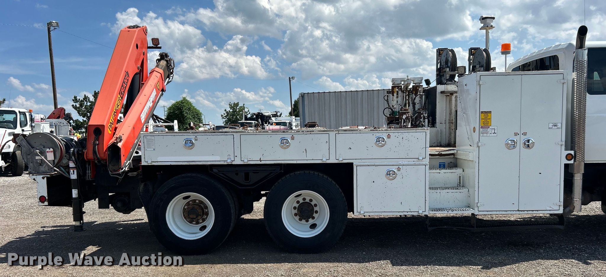 2009 International WorkStar 7400 Crew Cab utility / service truck. Miles: 93,269 on odometer, Hours: 7,232 on meter, VIN: 1HTWGAAT99J046537. Engine International MaxxForce DT, Displacement: 7.6L, Cylinders: 6, Fuel type: Diesel. Transmission Automatic. Chassis Axles: Tandem, Suspension: Air, Brakes: Air, PTO, GVWR: 66,000 lbs. Interior AC, Heat, Cruise control, Auxiliary controls. Features Bed 16' 10" L x 96" W, Welder type: Leads, Oil/lube system Hose reels, Crane Palfinger PK12000, Maximum boom length: 46' Maximum lift capacity: 14,970 lbs.. Tires Front: 315/80R22.5, Rear: 11R22.5. Oklahoma title. 15107 North 137th East Avenue. Collinsville, OK 74021