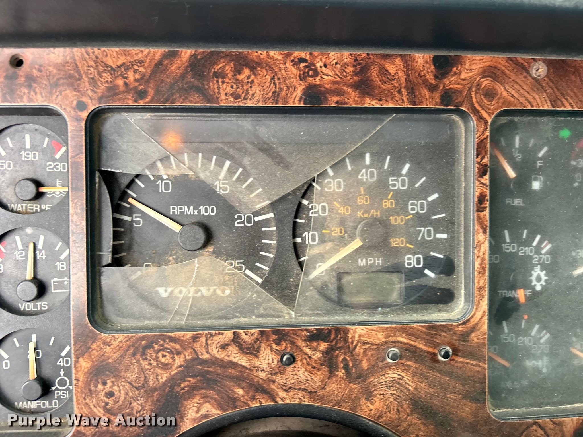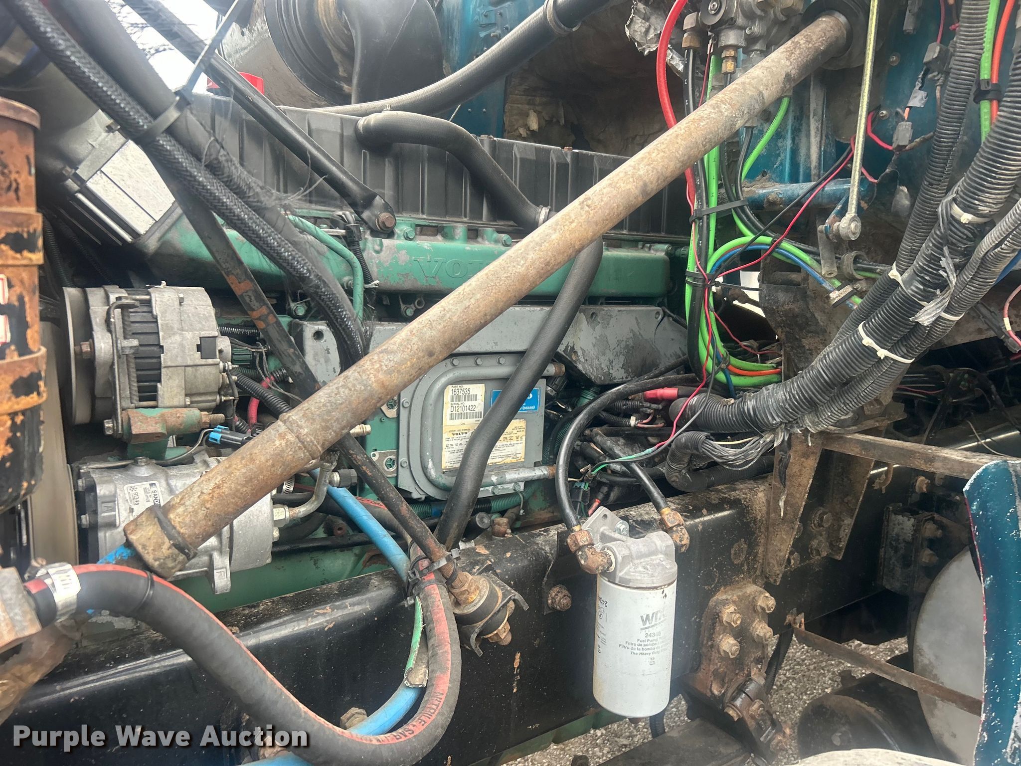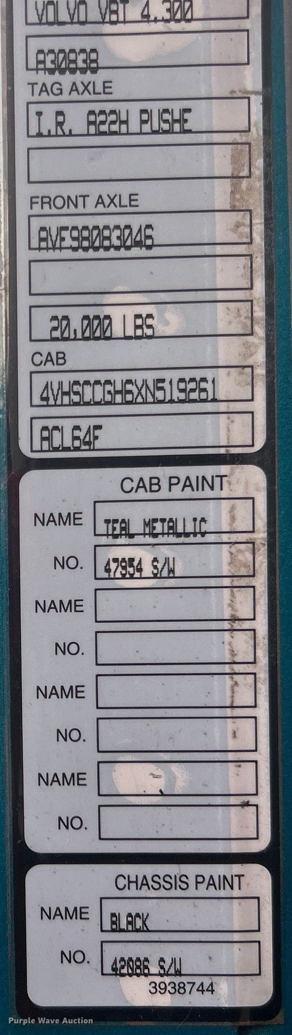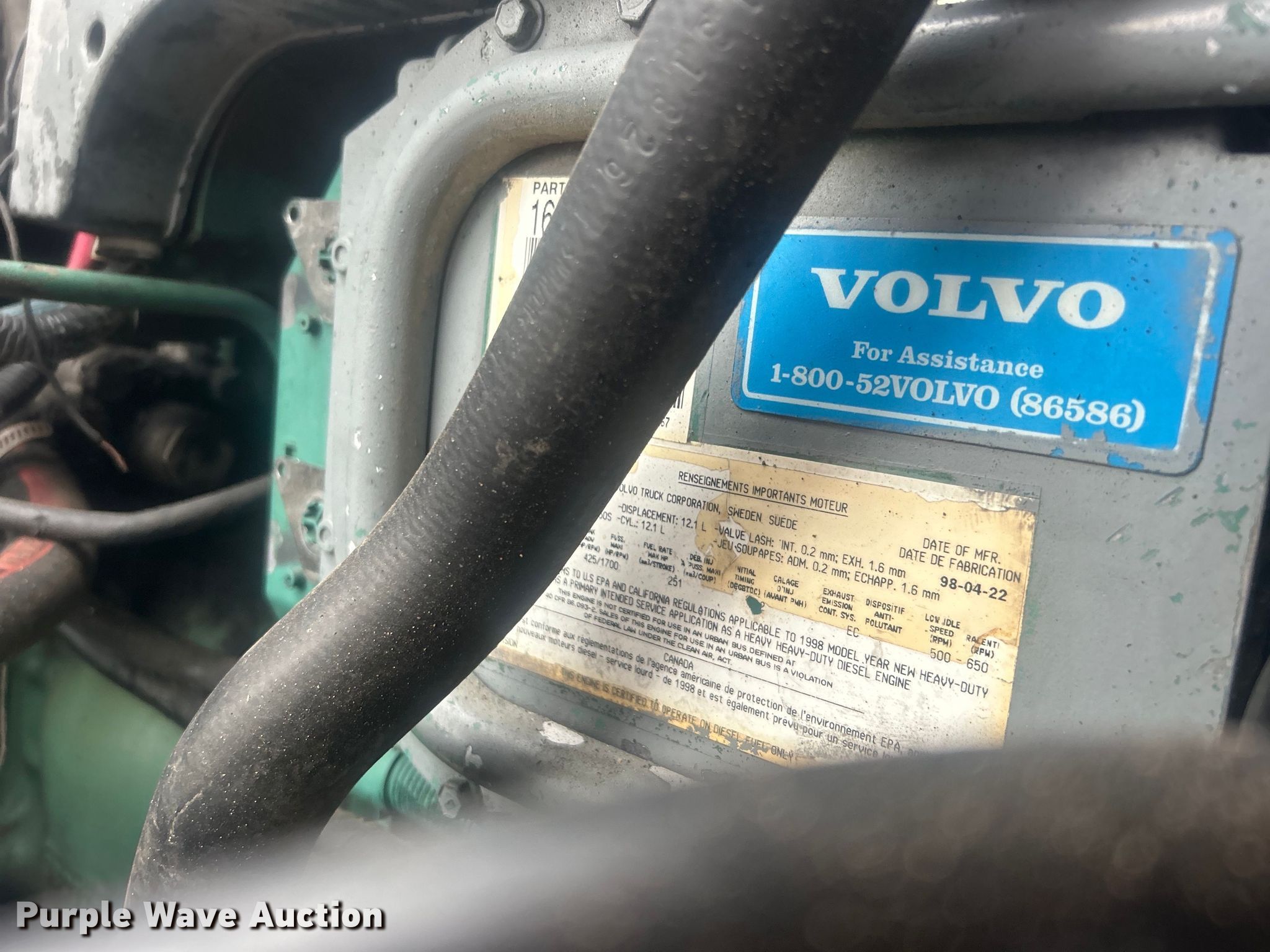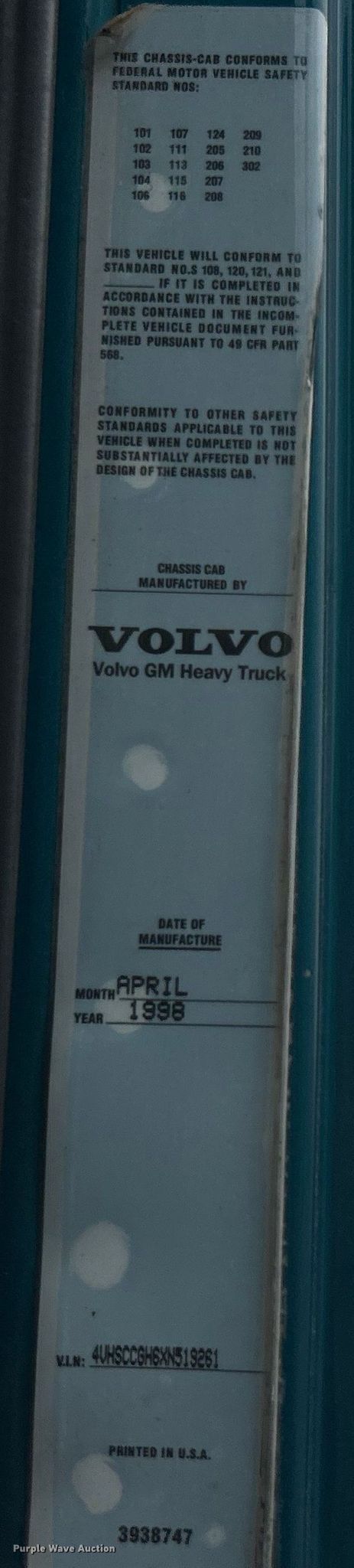 1999 Volvo ACL dump truck. Miles: Unknown, VIN: 4VHSCCGH6XN519261. Engine Volvo VEB12B-425, Displacement: 12.1L, Cylinders: 6, Fuel type: Diesel, HP: 425, Engine brake. Transmission Eaton Fuller 8LL, Manual, Speed: 10. Chassis Axles: Triple, Pusher axle, Differential lock, Suspension: Spring, Brakes: Air, PTO. Interior AC, Heat, Cruise control. Features Dump bed Danco, 17' L x 96" W, Side height: 64", Bed type: Aluminum, Roll tarp, Ram: Single, End gate: Manual. Tires Front: 425/65R22.5, Rear: 375:80R22.5, Lift axle: 295/80R22.5. Notes Dash warning indicator: DEF, Non-operational odometer, Display cover broken. Oklahoma title. Mileage has not been verified. Exempt will be written in the odometer disclosure on the title. 15107 North 137th East Avenue. Collinsville, OK 74021