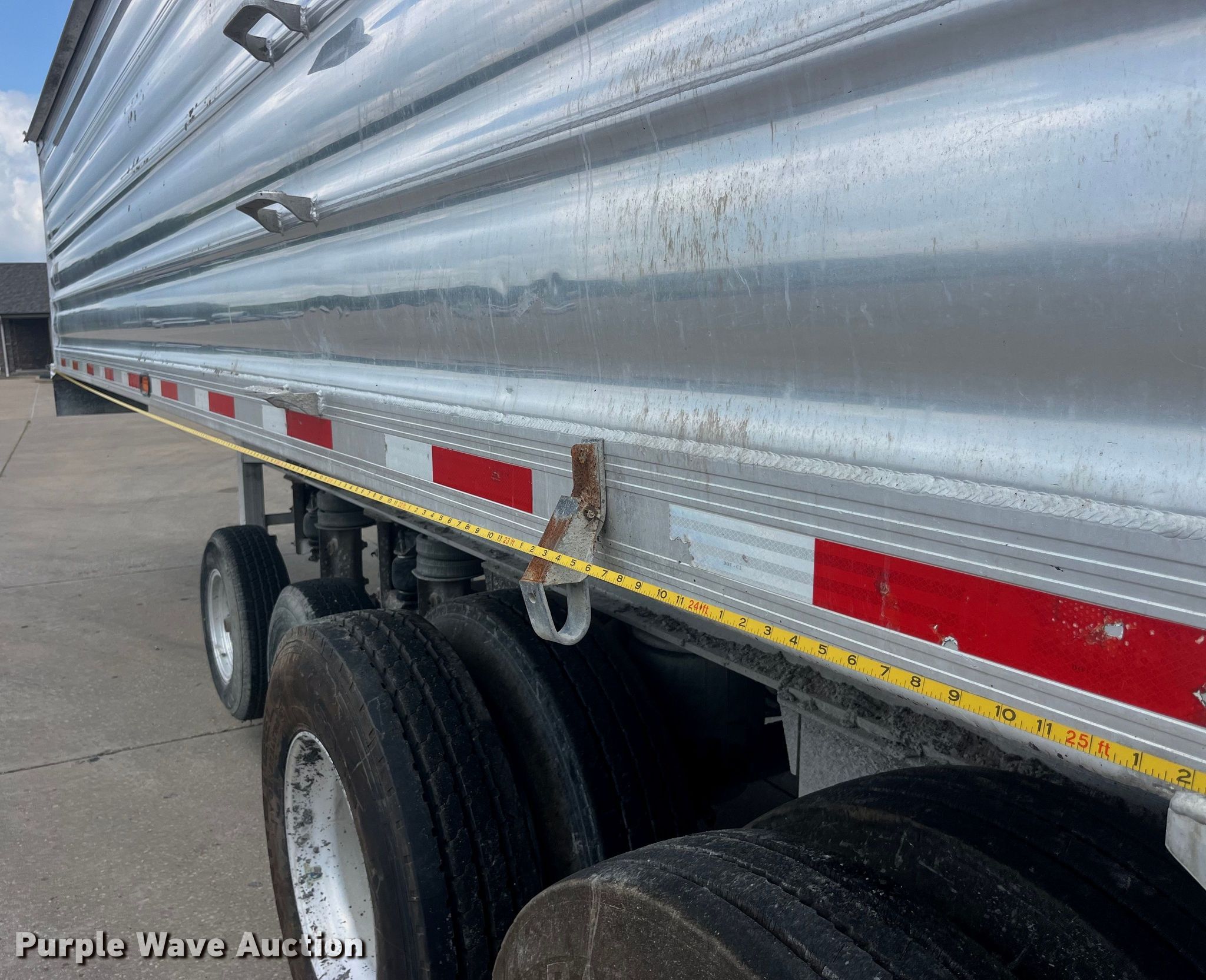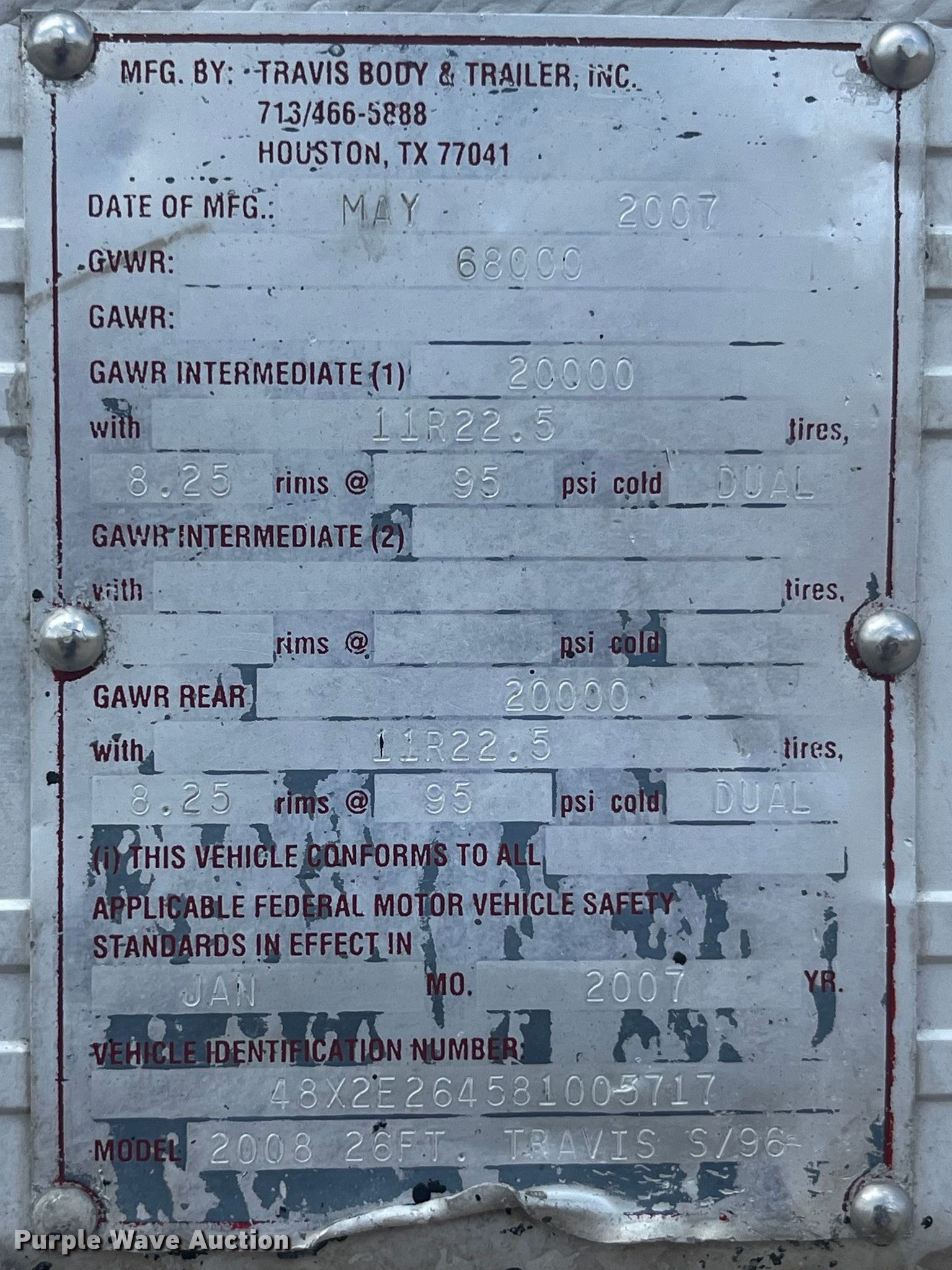 2008 Travis S/96 end dump trailer. VIN: 48X2E264581005717. Dimensions Body: 26' L x 96" W, Side height: 60". Features Body type: Aluminum, Ram: Single, End gate: Air operated, Roll tarp. Chassis Landing gear: Dual, Suspension: Air, Brakes: Air, Axles: Quad, Pusher axle, GVWR: 68,000 lbs, GAWR: 20,000 lbs. Tires Aluminum wheels, Size: 11R22.5, Lift axle: 215/85R16. Missouri title. Title distribution may be delayed up to 30 days from verification of funds. Emery Sapp. Palmyra, MO 63461