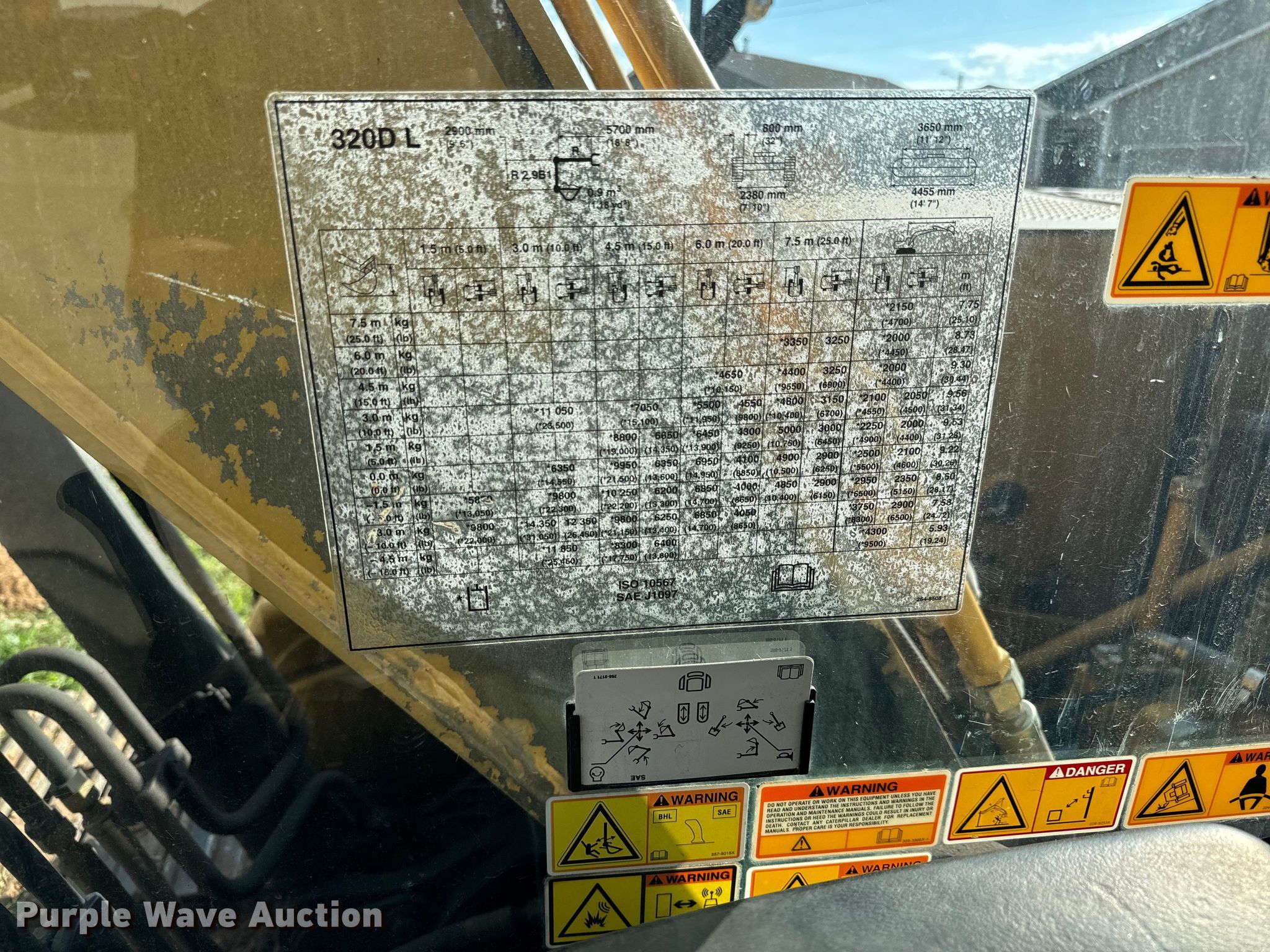 2008 Caterpillar 320D L excavator. Hours: 10,938 on meter, Miles or hours may vary, unit still in use, Serial: CAT0320DTPHX01474. Engine Caterpillar, Serial: G32F0-012, Cylinders: 6, Fuel type: Diesel. Transmission Hydrostatic, Two speed travel. Operators station Enclosed cab, AC, Heat, Pattern changer. Features Auxiliary hydraulics, Stick Stick length: 9' 6", Bucket Caterpillar, Width: 36", Teeth: 5. Tracks Width: 31.5", Steel, Grouser pads: Triple. Notes Cab glass missing, Boom cylinder issues, leaks, Possible starter issues. Dutton Construction. Wichita, KS 67235