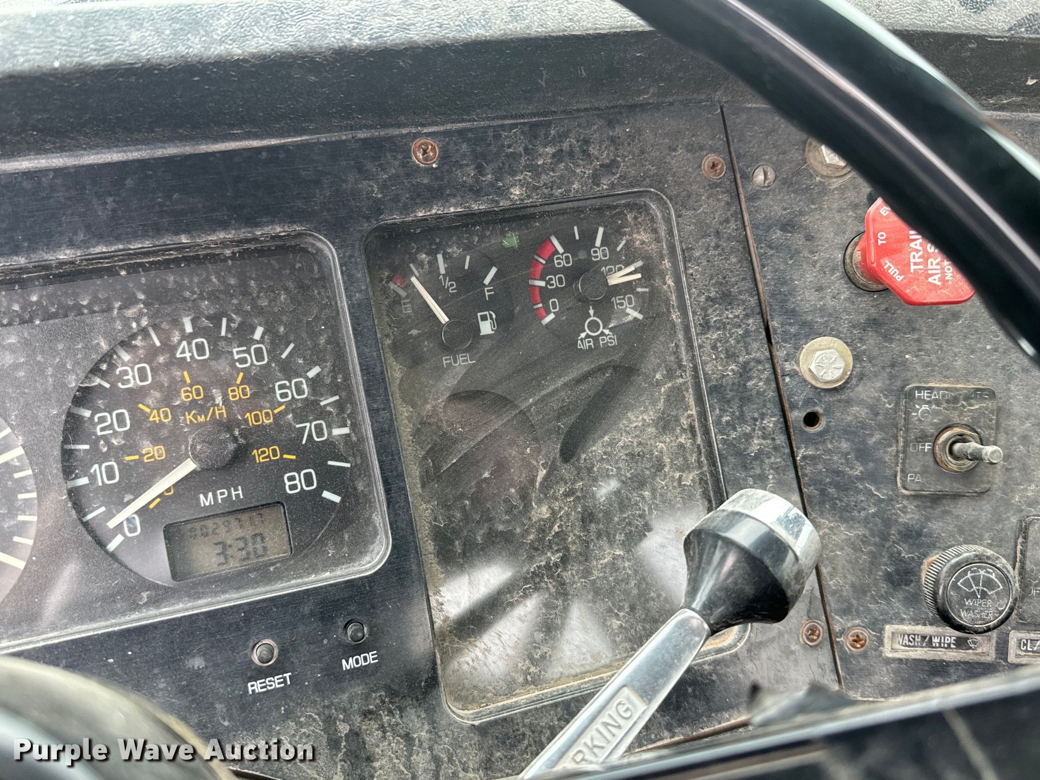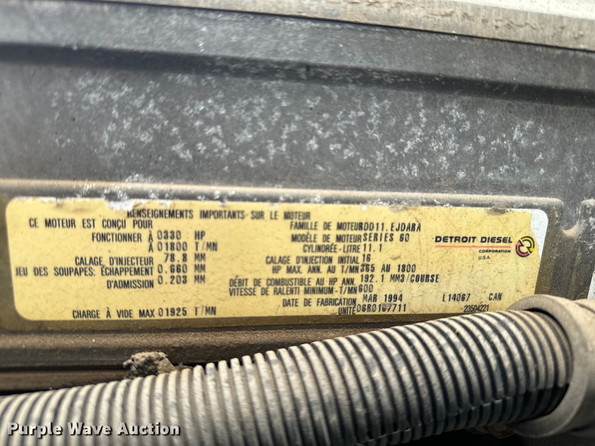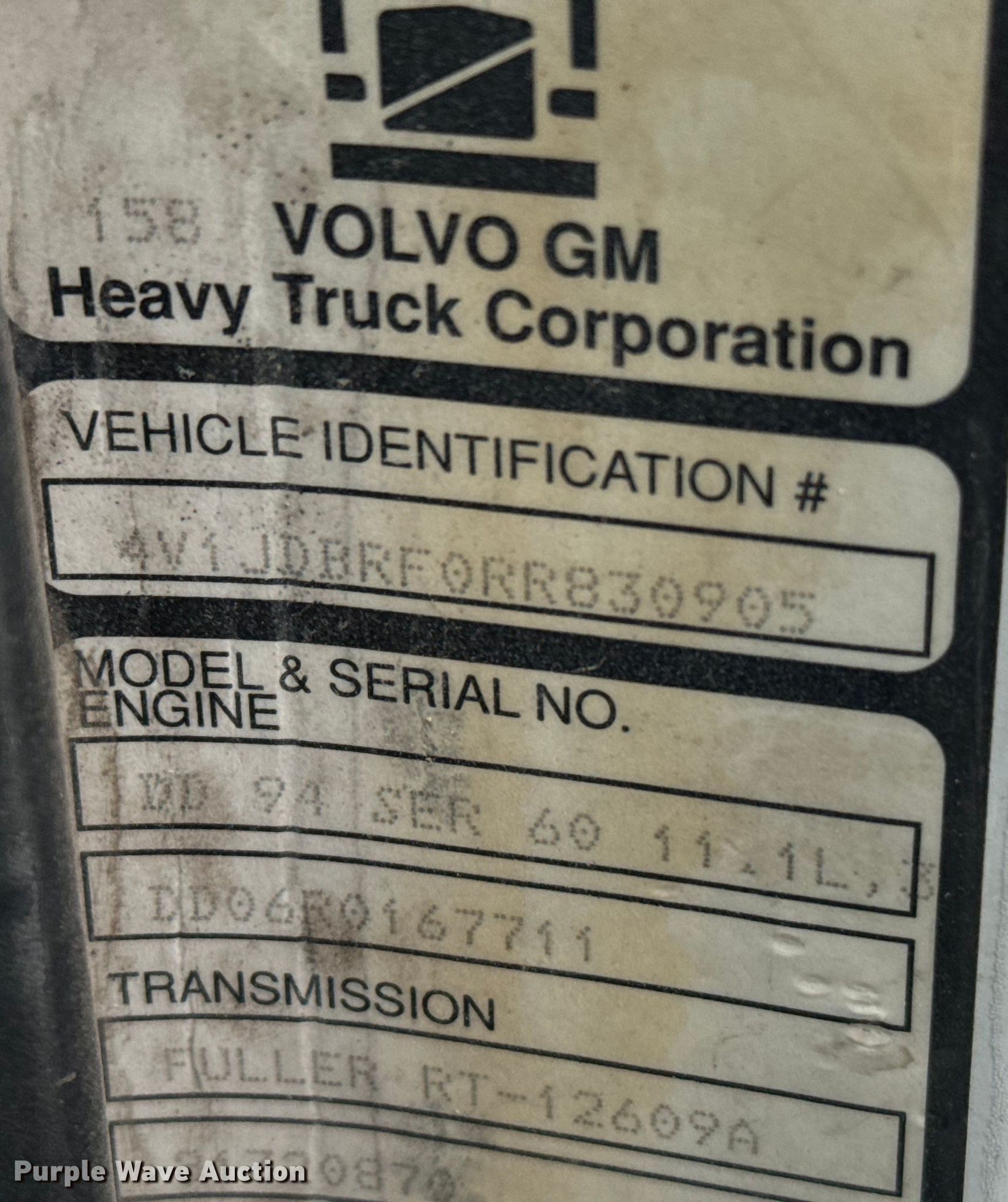 1994 White GMC truck cab and chassis. Miles: 2,972 on odometer Actual mileage unknown, VIN: 4V1JDBRF0RR830905. Engine Detroit Diesel Series 60, Serial: DD06R0167711, Displacement: 11.1L, Cylinders: 6, Fuel type: Diesel. Transmission Eaton Fuller RT-12609A, Manual, Speed: 9. Chassis Axles: Tandem, Differential lock: Inter-axle, Suspension: Spring, Brakes: Air, Truck chassis: 20'. Interior AC, Heat, Heated mirrors, Cruise control. Features Fuel tank: Dual. Tires Size: 11R22.5. Notes Windshield chipped or cracked, Key broken, Unknown operating condition of AC, Unknown operating condition of odometer. Texas title. Mileage has not been verified. Exempt will be written in the odometer disclosure on the title. Title distribution may be delayed up to 30 days from verification of funds. Dustrol Inc.. Towanda, KS 67144
