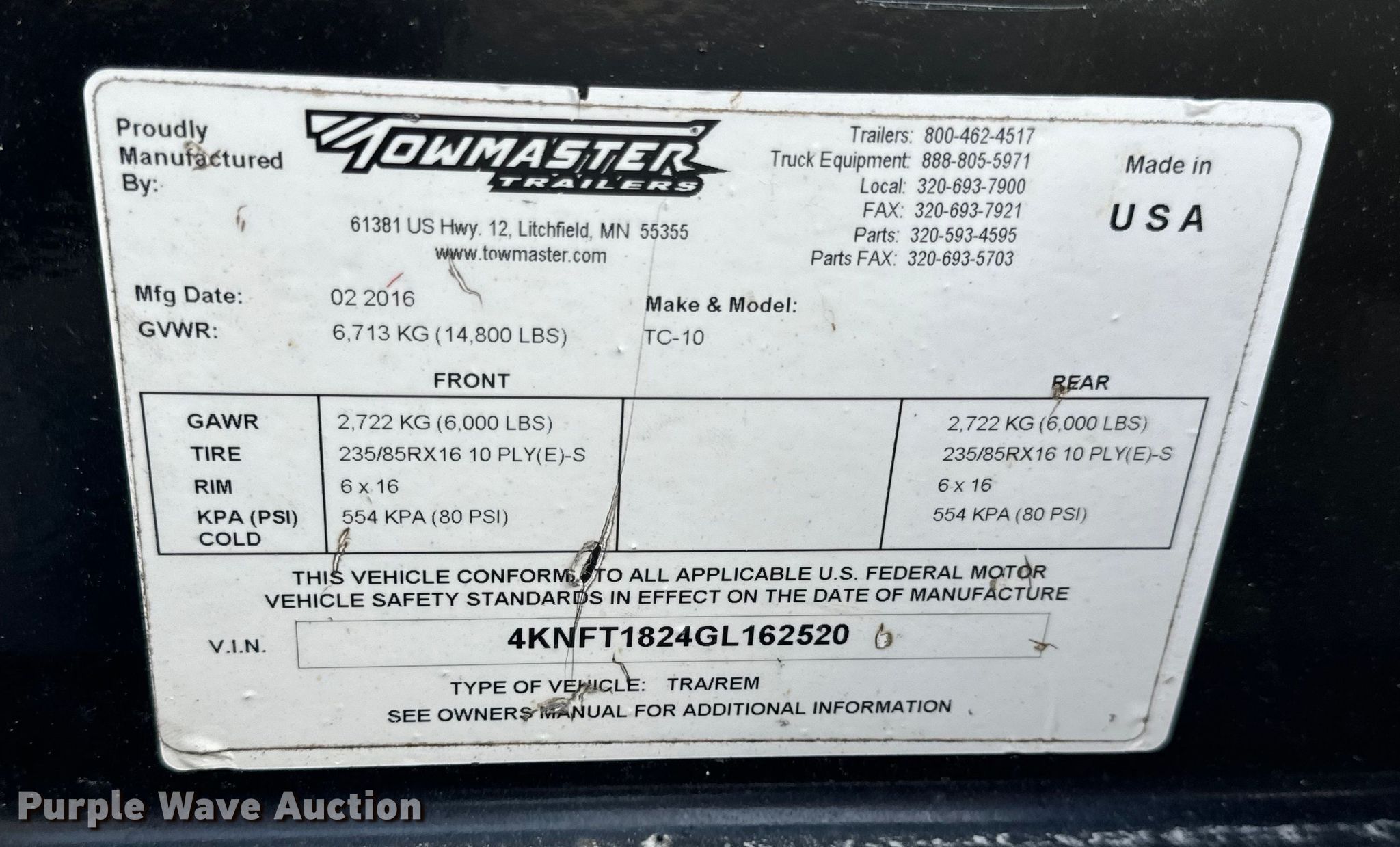 Purple Wave is selling a used Equip. Trailer in Missouri. This item is a 2016 Towmaster TC-10 equipment trailer with the following: VIN: 4KNFT1824GL162520