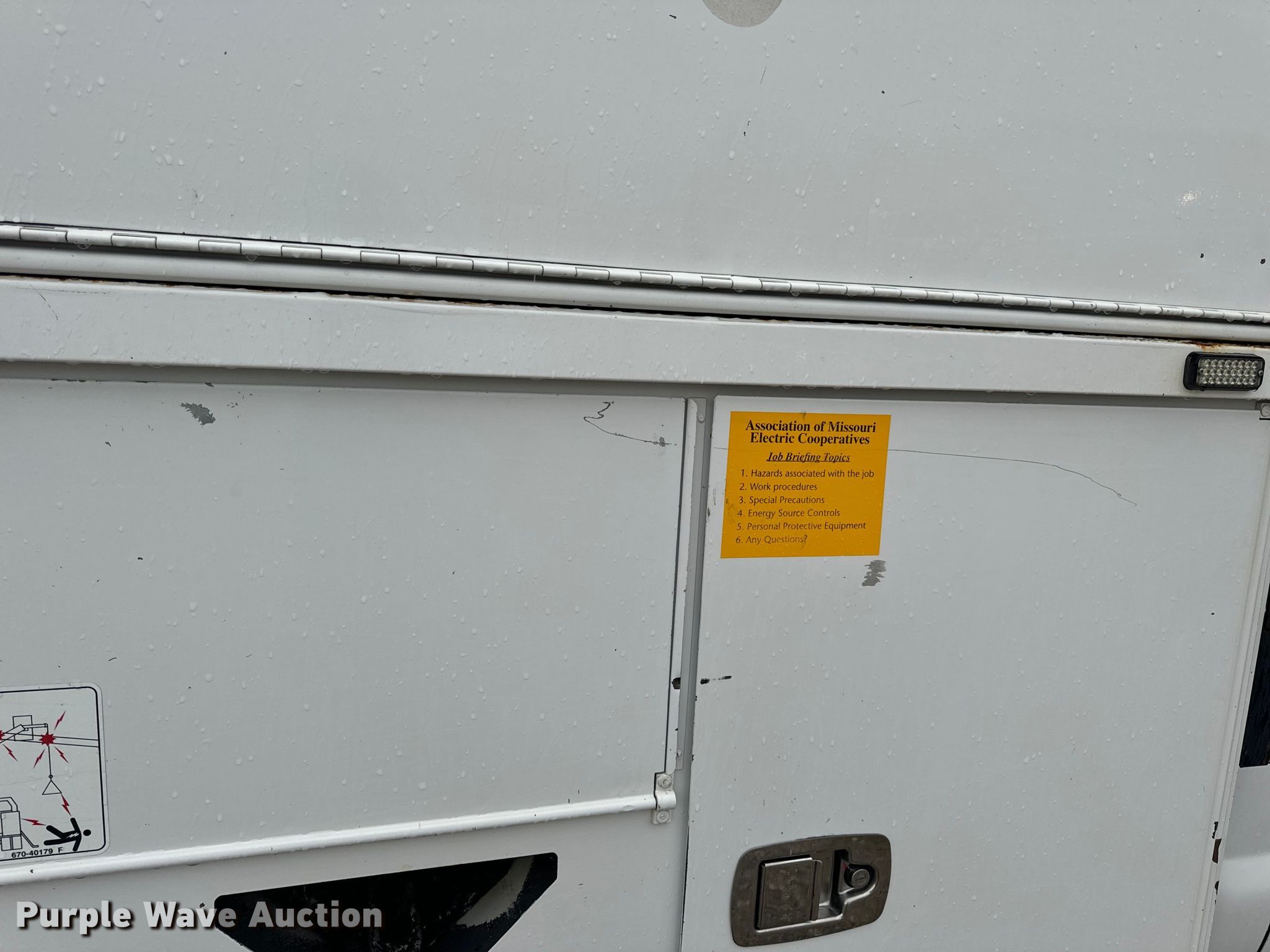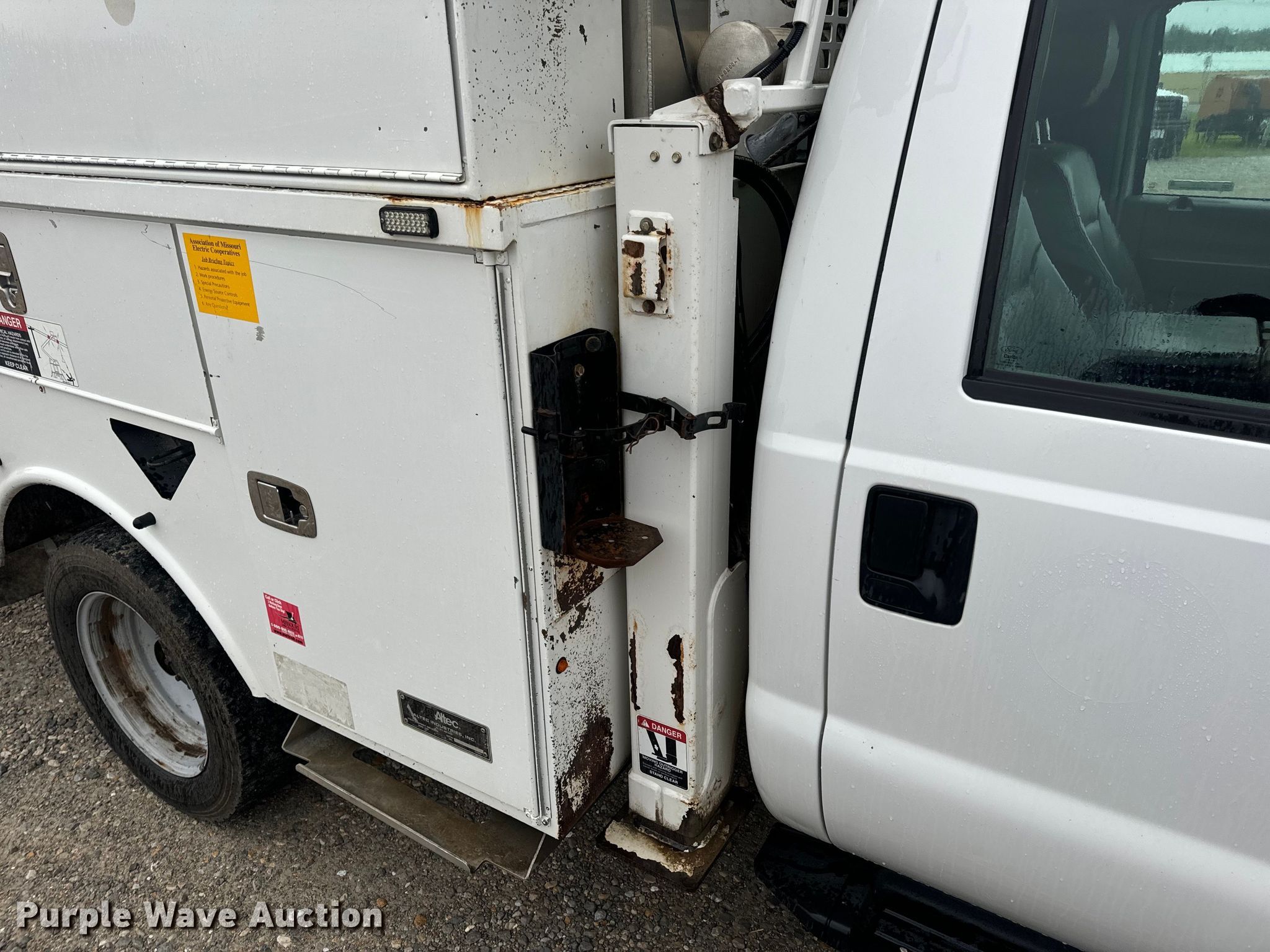 2014 Ford F550 Super Duty XL bucket truck. Miles: 205,886 on odometer, VIN: 1FDUF5HT2EEA93315, Unit #: 8. Engine Displacement: 6.7L, Cylinders: 8, Fuel type: Diesel. Transmission Automatic. Chassis Four wheel drive, Axles: Single, Suspension: Spring, Brakes: Hydraulic, PTO, GVWR: 19,500 lbs. Interior AC, Heat, Heated mirrors, Power windows, Power locks, Cruise control, Auxiliary controls. Features Bed Altec, 8' 6" L x 94" W, Boom 2014 Altec AT40G, Serial: 1113EY0477, Maximum lift capacity: 400 lbs, Maximum lift height: 40.8', Boom type: Articulating, Insulated, Telescopic, Man basket, Boom controls Ground, Platform/ basket, Certification valid through: 03/2025. Tires Size: 225/70R19.5. Missouri title. Title distribution may be delayed up to 14 days from verification of funds. Co-Mo Electric Cooperative. Tipton, MO 65081