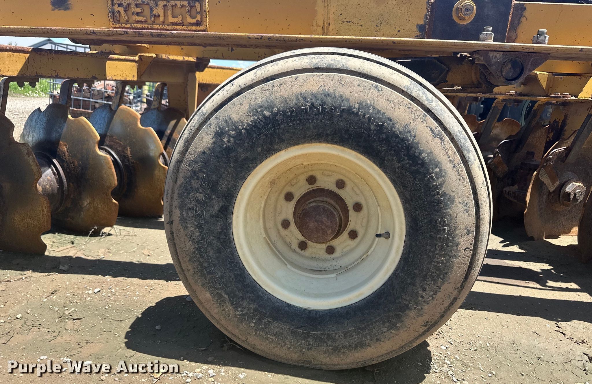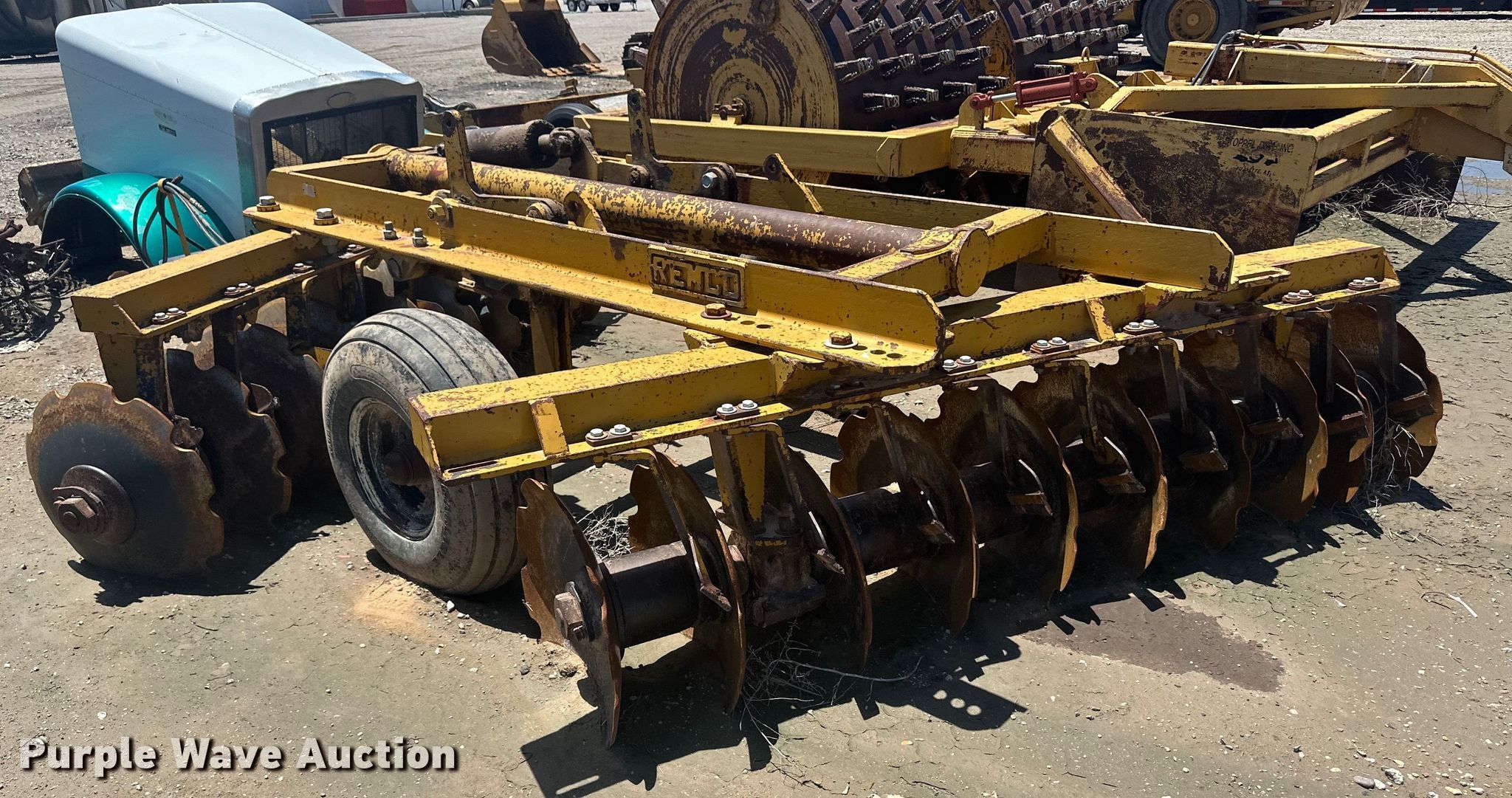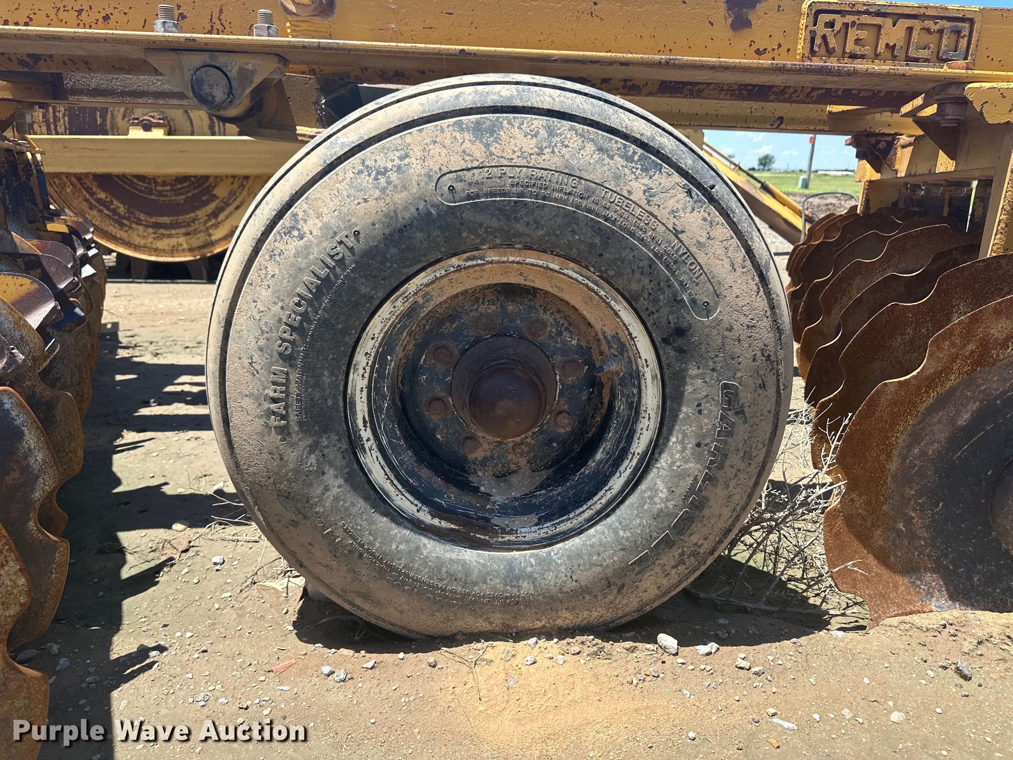 Remco AW20S off-set disk. Overall width: 10', Serial: AW98-223. Features Front blades Diameter: 26", Spacing: 12", Rear blades Diameter: 26", Spacing: 12", Disk scrapers, Operation Hydraulic lift. Tires Tire size: 12.5L-15. Stoppel Dirt Inc.. Sublette, KS 67877
