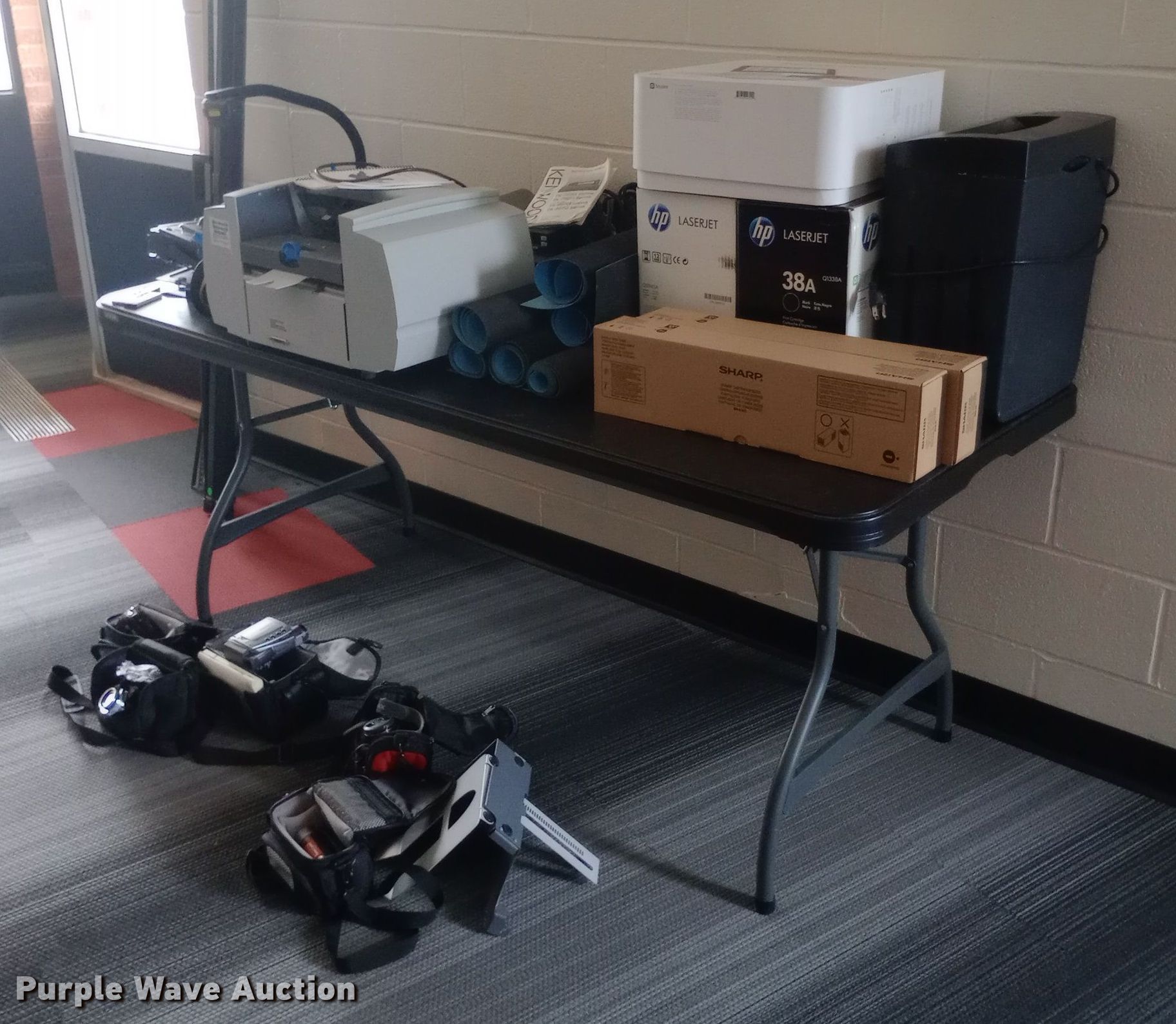 Electronics. (2) cameras, (3) camcorders, Putney Bowes DF800/DF900 folding machine, Kenwood radio, Laserjet 38A Q1338A printer cartridges, Laserjet Q5942A printer cartridges, Sharp toner cartridge, Shredder, IPad square stand, Projector screen. USD 358 Oxford. Oxford, KS 67119