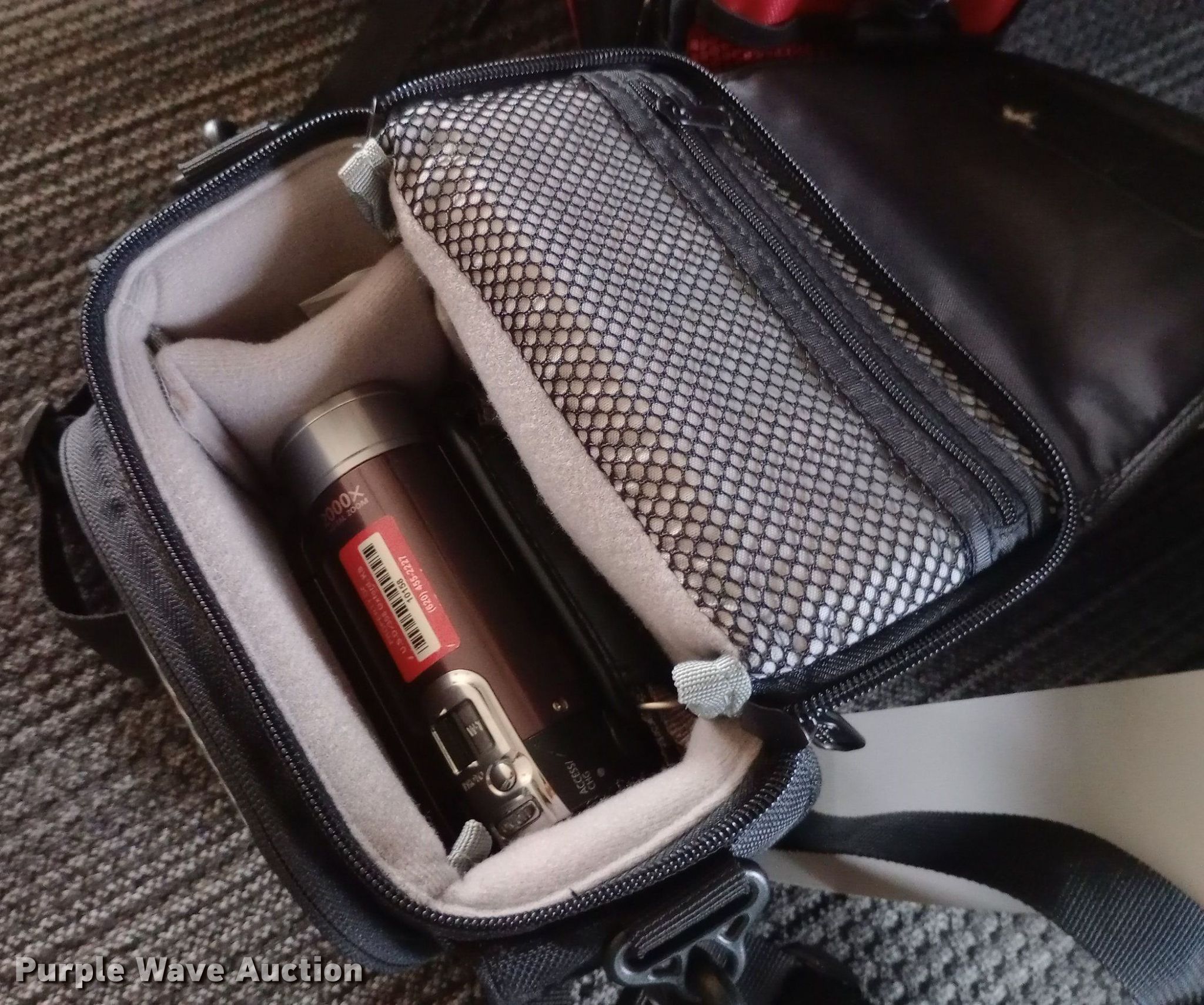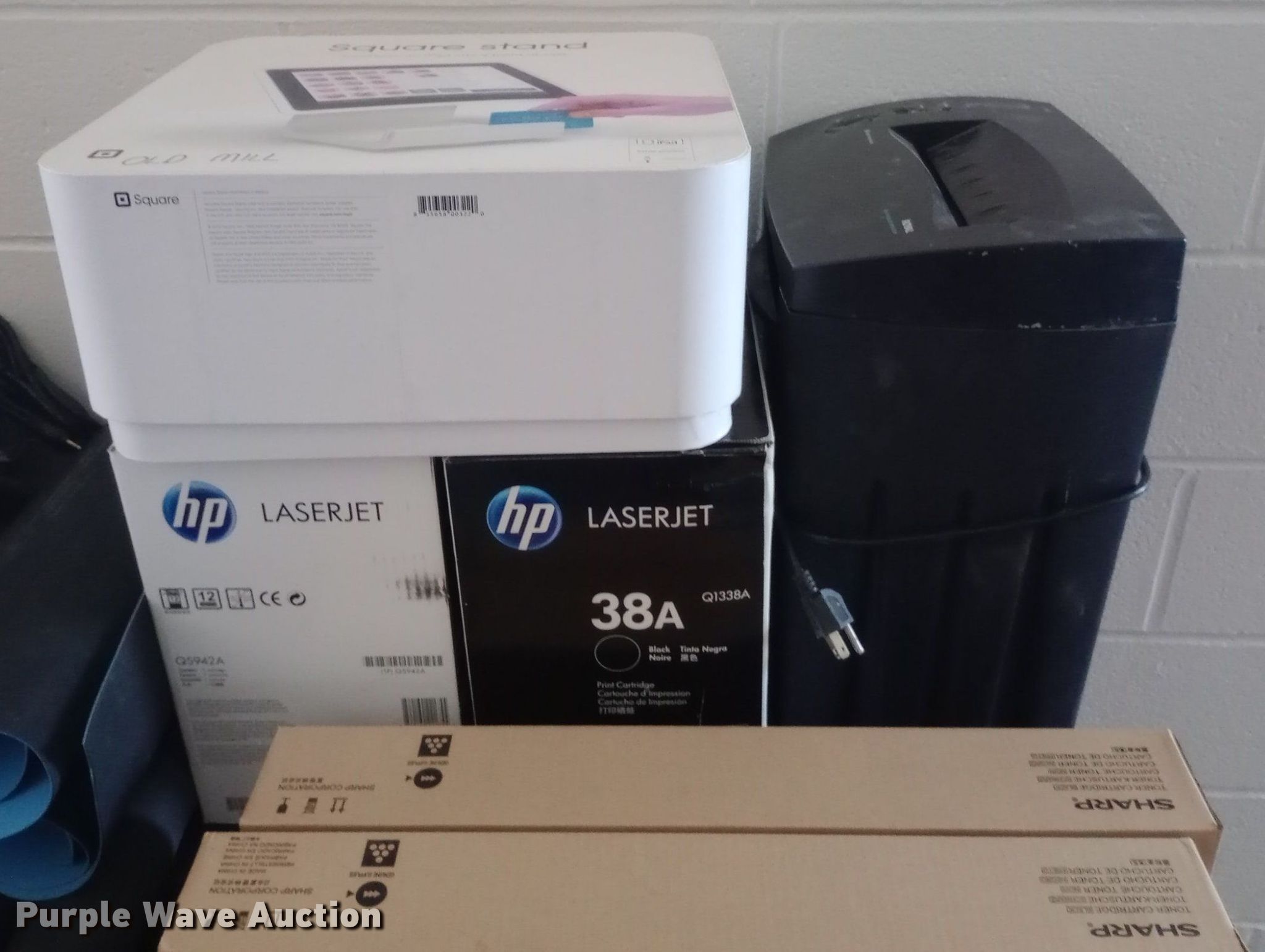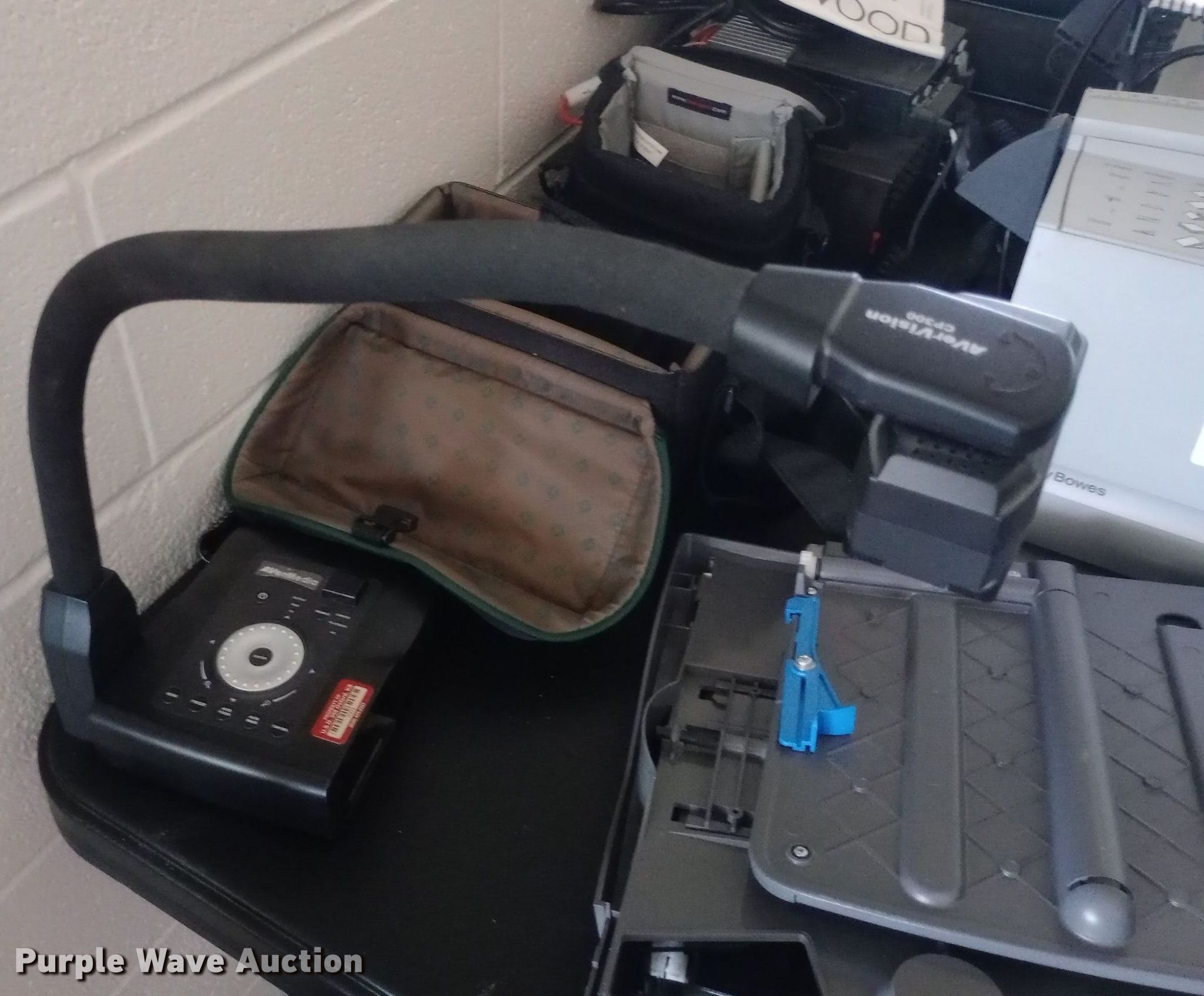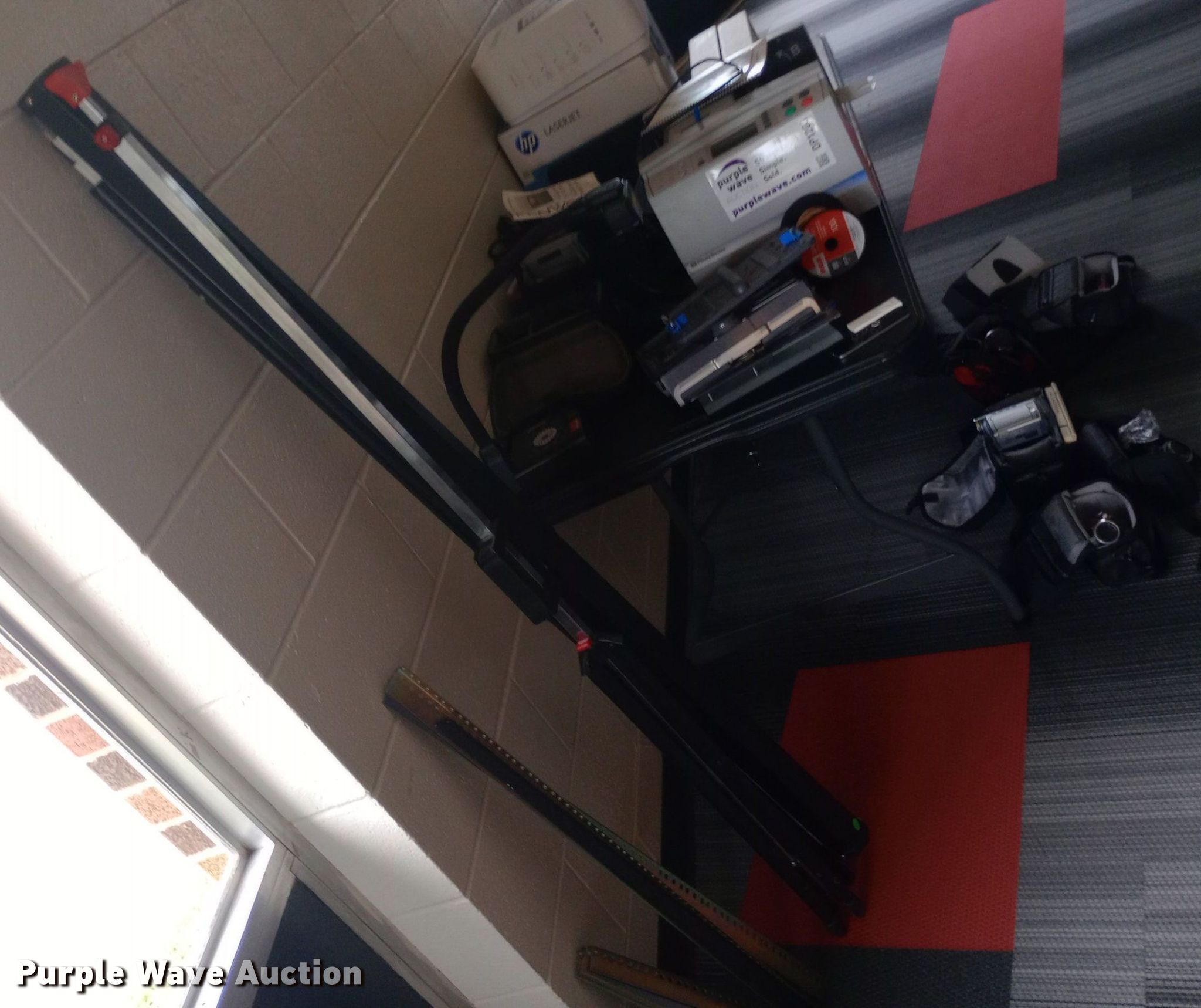 Purple Wave is selling a used Electronics in Kansas. This item is a Electronics with the following: (2) cameras, (3) camcorders, Putney Bowes DF800/DF900 folding machine, Kenwood radio, Laserjet 38A Q1338A printer cartridges, Laserjet Q5942A printer cartridges, Sharp toner cartridge, Shredder, IPad square stand, Projector screen