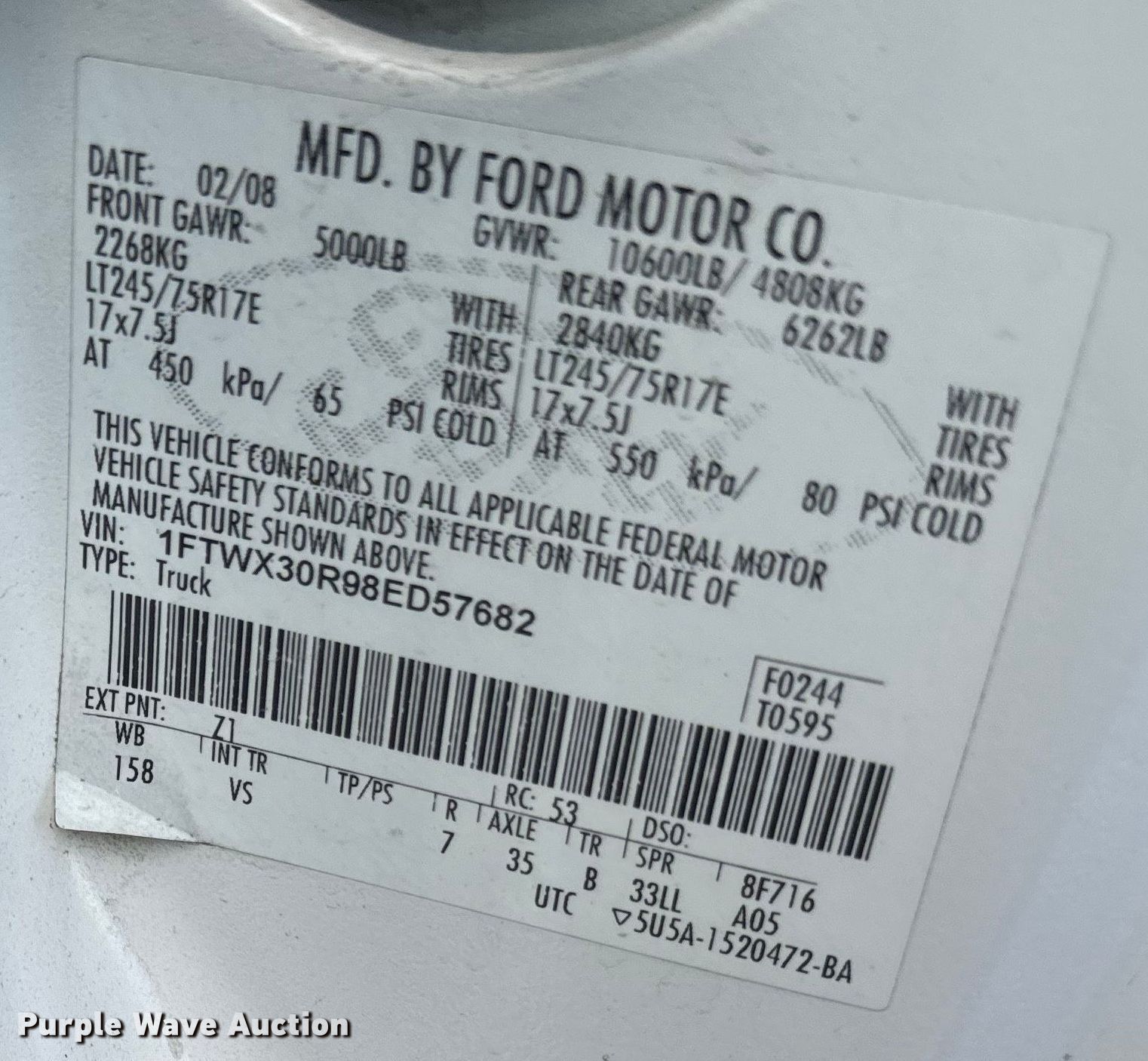 - VIN: 1FTWX30R98ED57682
