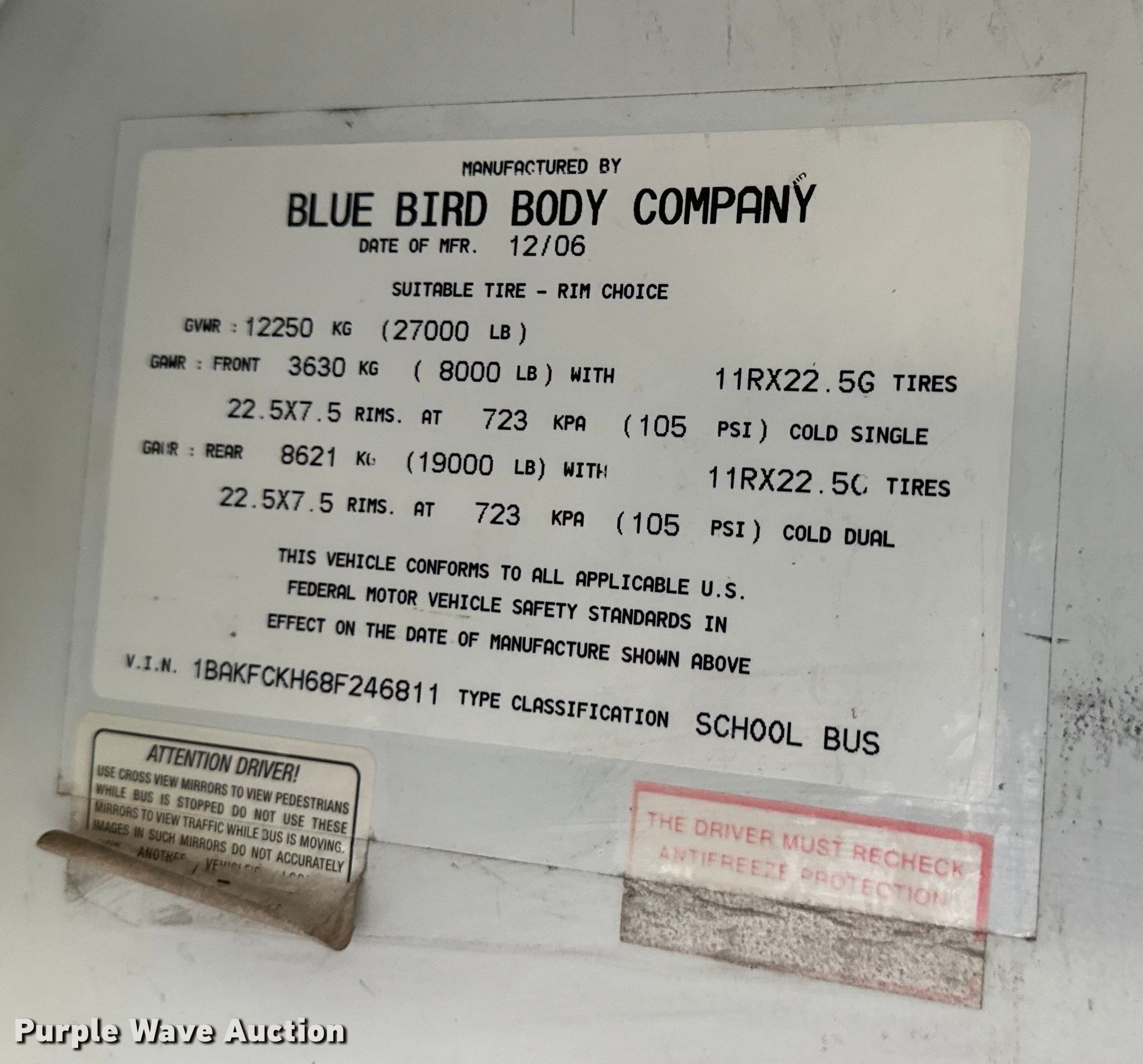 2008 Bluebird Vision school bus. Miles: 197,823 on odometer, VIN: 1BAKFCKH68F246811. Engine Caterpillar C7, Displacement: 7.2L, Cylinders: 6, Fuel type: Diesel. Transmission Automatic. Chassis Axles: Single, Suspension: Spring, Brakes: Hydraulic. Interior Heat. Tires Size: 11R22.5. Kansas title. Title distribution may be delayed up to 14 days from verification of funds. JEFFERSON COUNTY NORTH USD 339. Nortonville, KS 66060