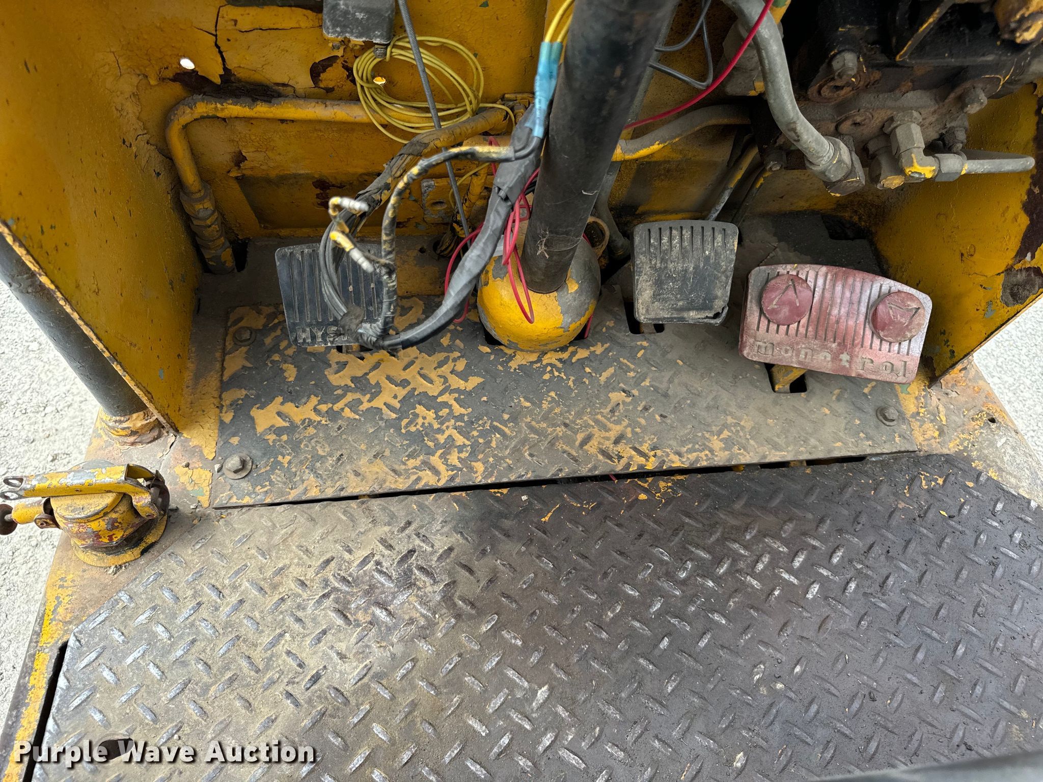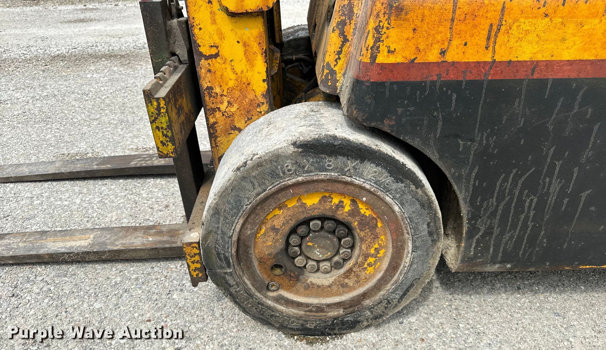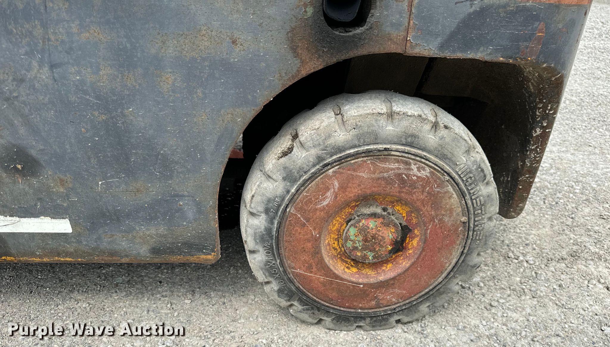 Hyster forklift. Serial: FAB21964. Engine Cylinders: 4, Fuel type: Gas. Transmission Powershift, 1F - 1R. Operators station Canopy. Features Mast stages: 2, Fork length: 44". Tires Front: 18x8x12 1/8, Rear: 16x5x10 1/2, Solid. Notes Hydraulic leak. East Oakland Township. Oakland, IL 61943