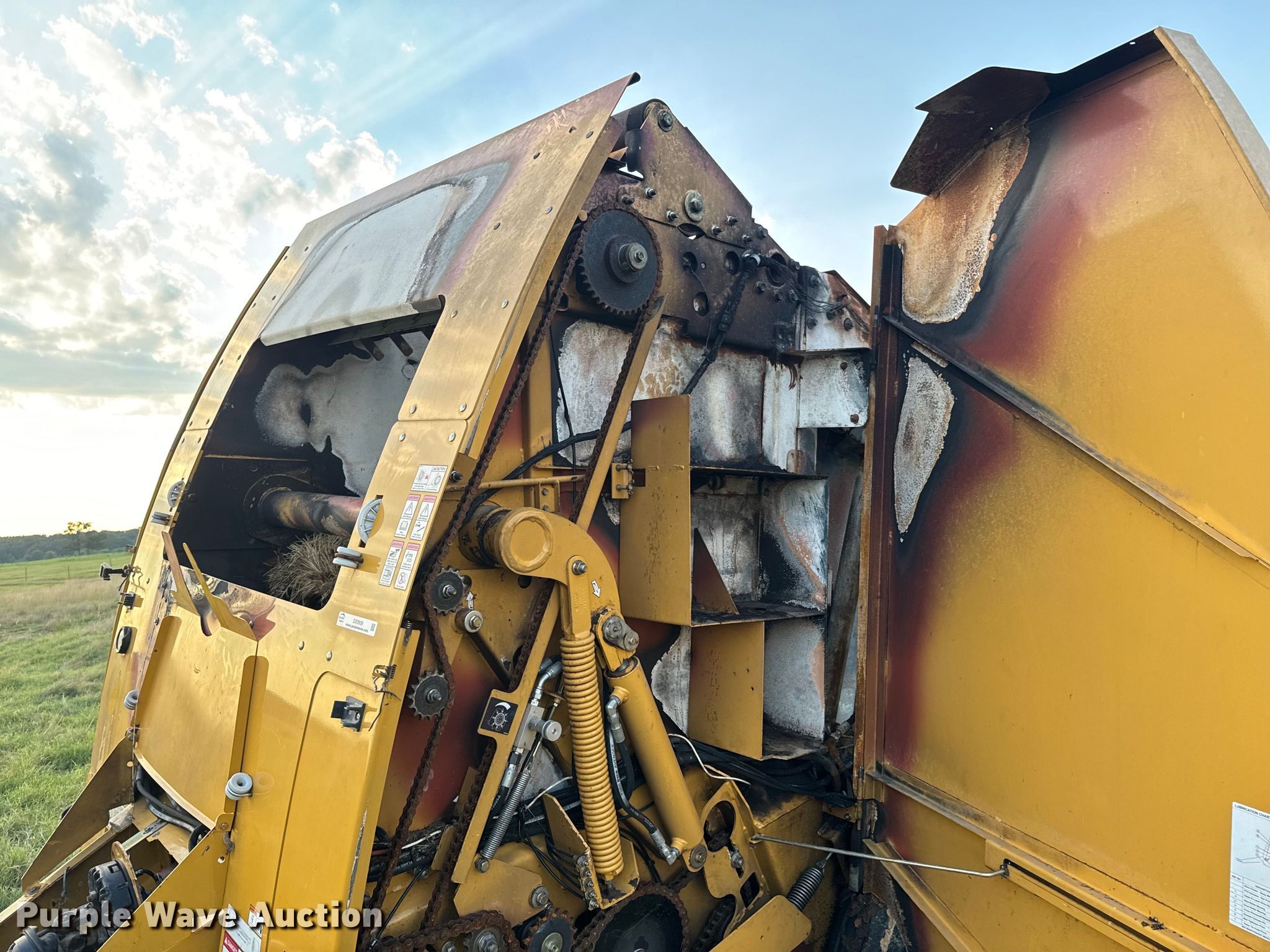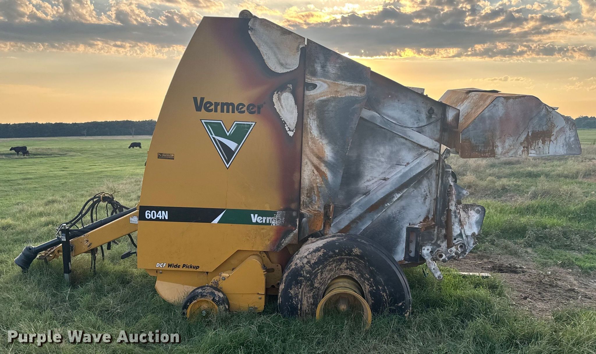 Vermeer 604N round baler. Serial: 1VRH16121F1000255, Insurance salvage unit claim #: 4-809159. Features PTO: 540, Monitor Vermeer, Gauge wheels Size: 7.10-16, Pickup width: 5', Hydraulic pickup lift, Bale size: 5'x6', Twin twine tie, Net-wrap. Tires Size: 21.5L-16.1. Notes Fire damage, Non-operational unit. Oklahoma Farm Bureau. Salina, OK 74365
