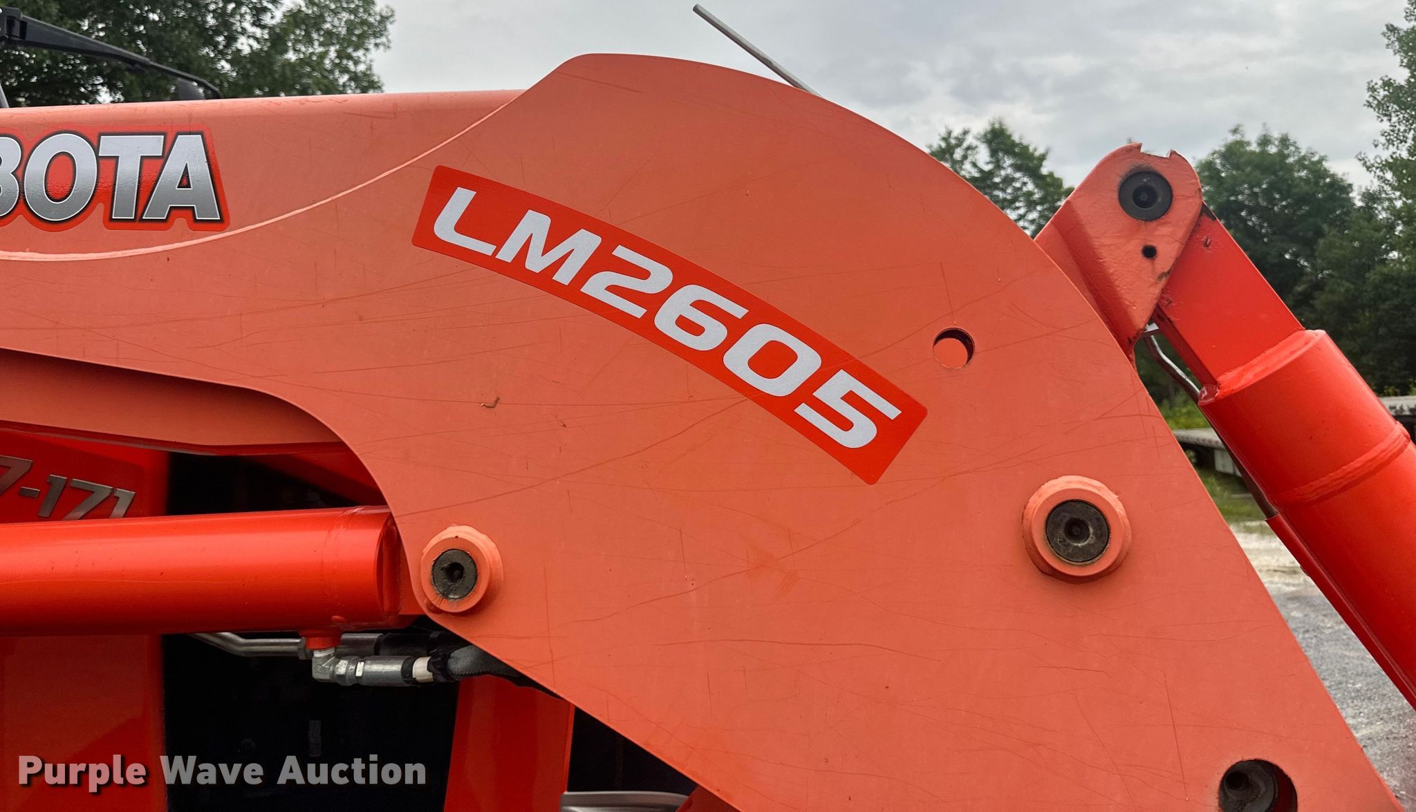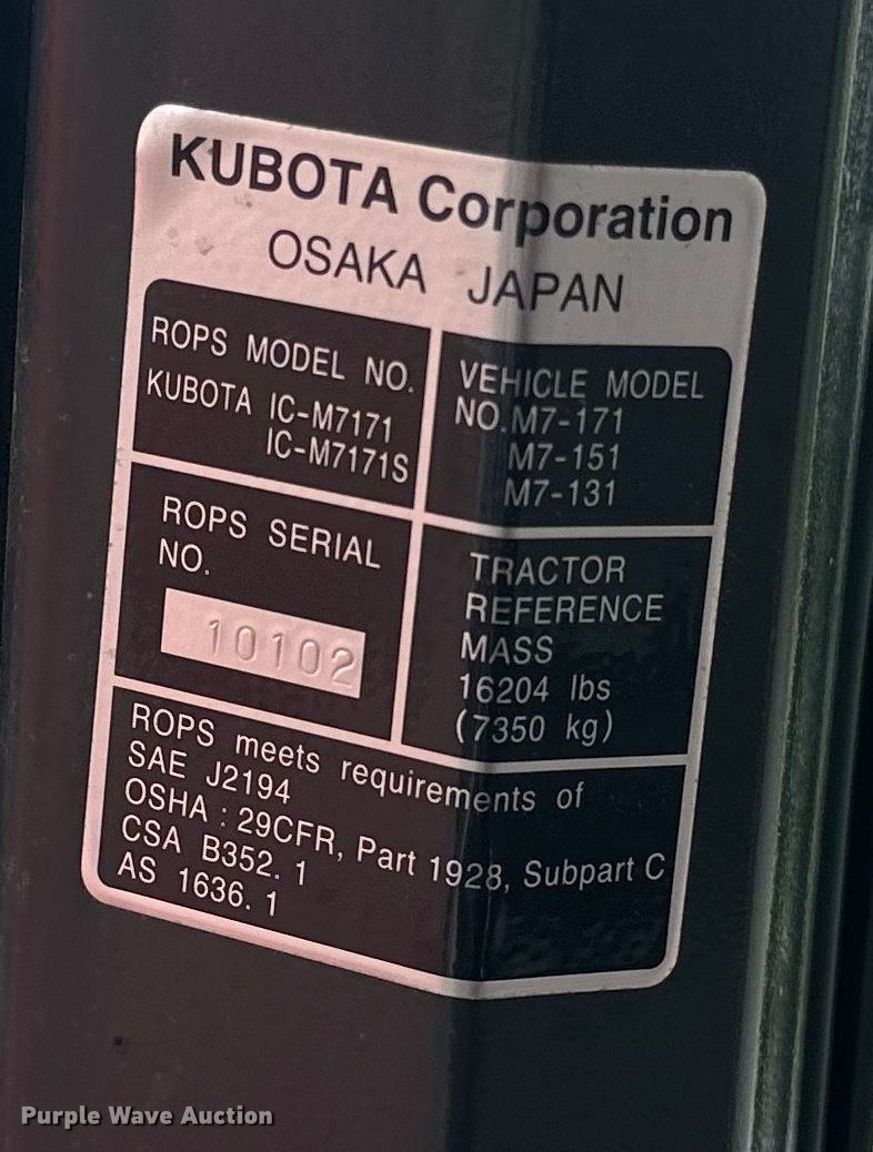 2019 Kubota M7-171 Premium MFWD tractor. Hours: 1,090 on meter, Serial: 10049. Engine Kubota V6108-CR-TIER4, Cylinders: 4, Fuel type: Diesel, HP: 168. Transmission Powershift, 24F - 24R, Left-hand reverser, Differential lock. Operators station AC, Heat, Display Kubota. Features PTO: 540, 1000, Three point Top link, Seven pin outlet, ISOBUS outlet, Front: 1, Rear: 4, Power beyond (hydraulics), Loader Kubota LM2605, Quick attach, Controls: Joystick, Bucket Width: 96".. Tires Front: 16.9R28, Rear: 480/80R42. Notes 1,000 PTO shaft included. Fetch Transportation. New Haven, VT 05472