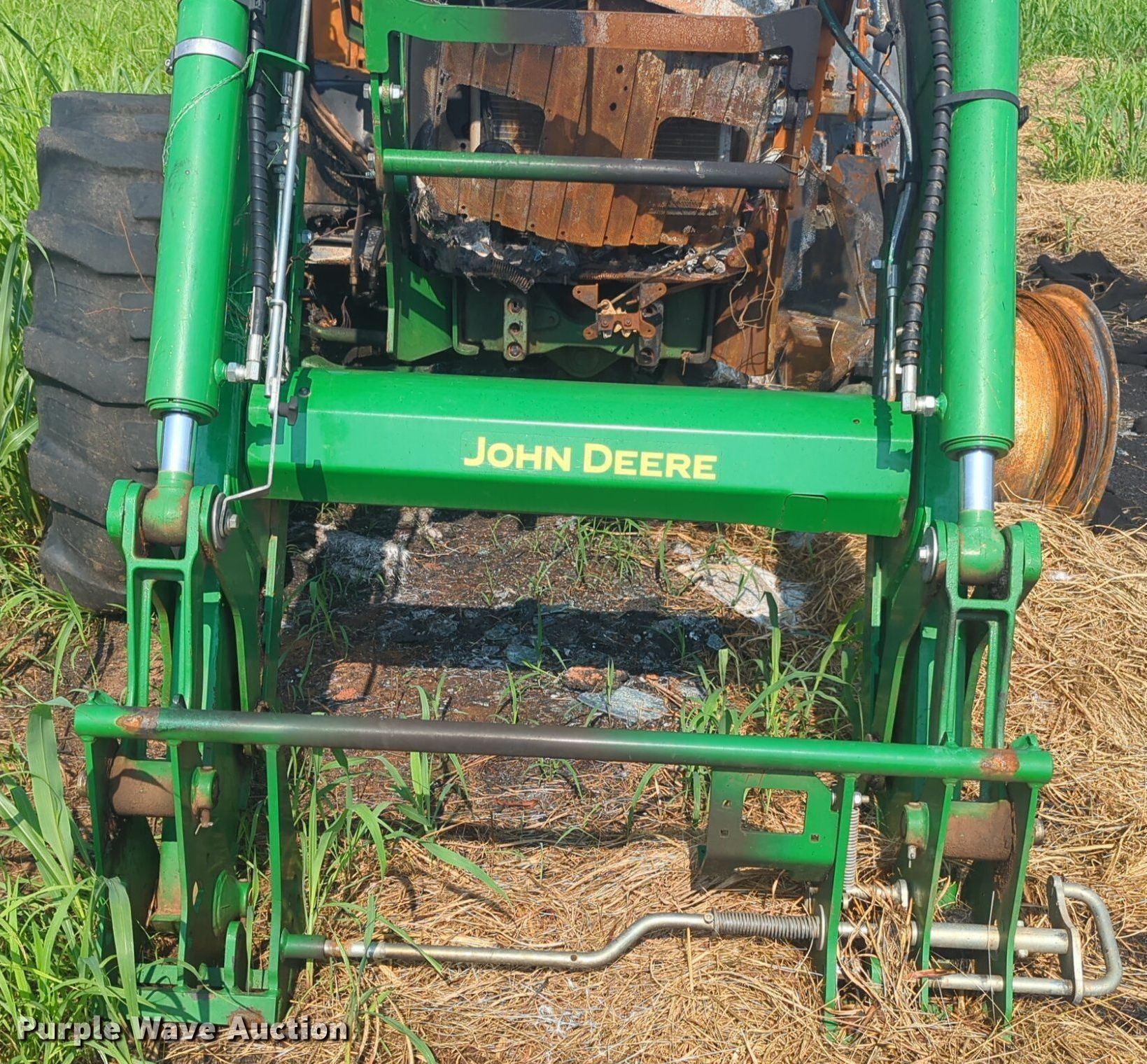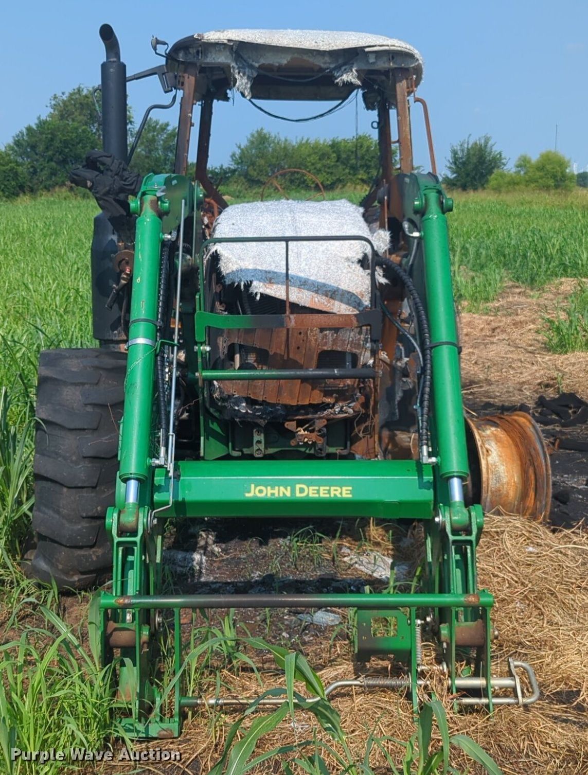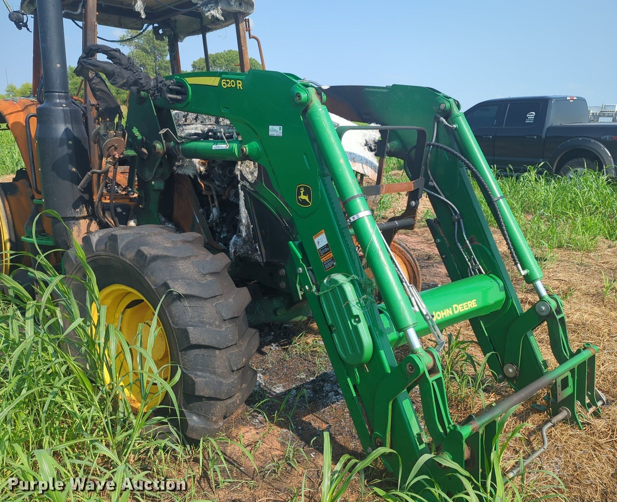 2019 John Deere 6120M MFWD tractor. Serial: 1206120MTJG918647, Insurance salvage unit claim #: 4-809820. Engine John deere, Cylinders: 4, Fuel type: Diesel. Transmission Powershift, 24F - 24R, Left-hand reverser, Differential lock. Features PTO: 540, Three point Top link, Hydraulic remote sets Rear: 2, Loader John Deere 620R, Quick attach, Controls: Joystick. Notes Fire Damage, Tires missing, Non-operational unit. Oklahoma Farm Bureau. Minco, OK 73059
