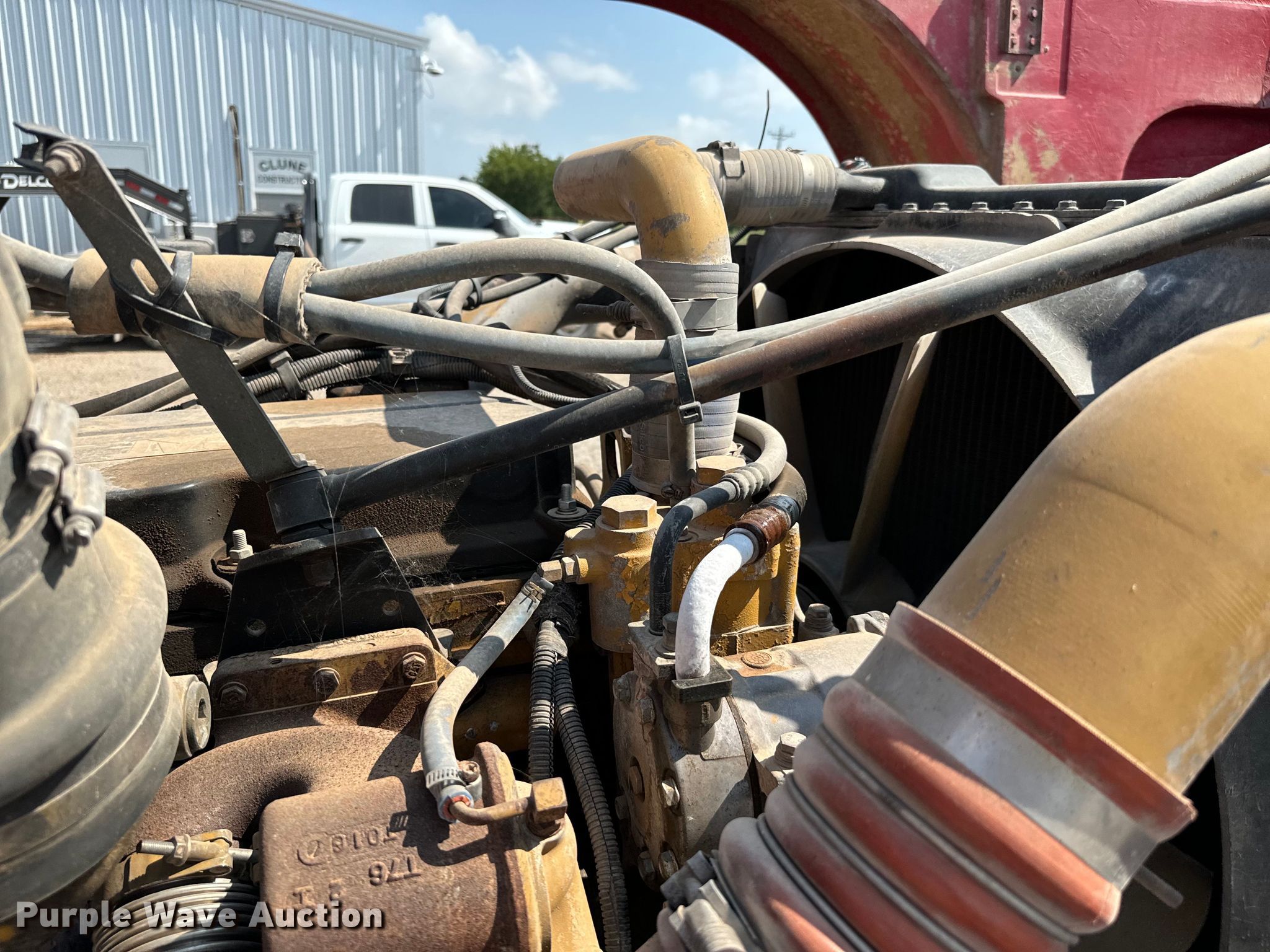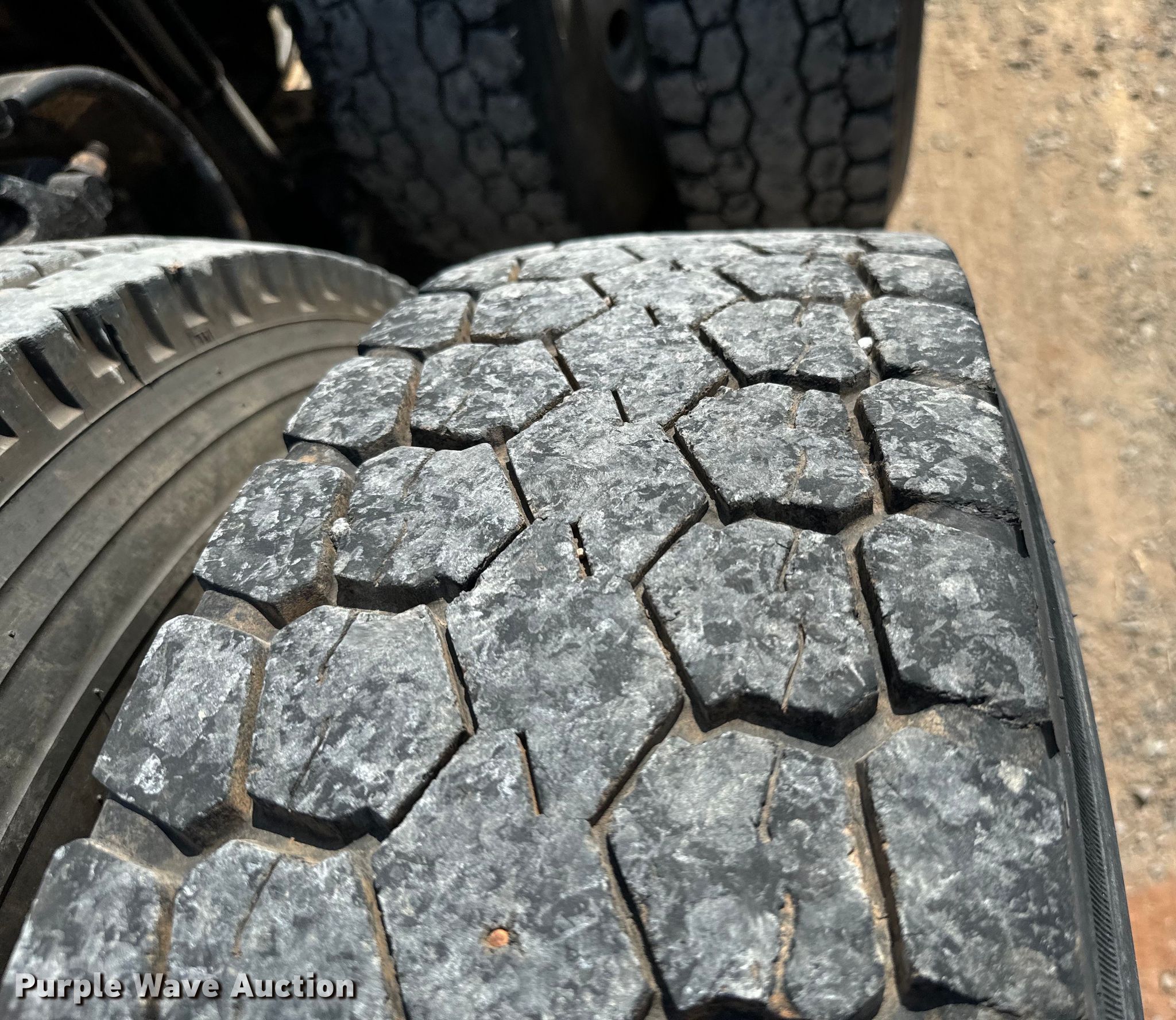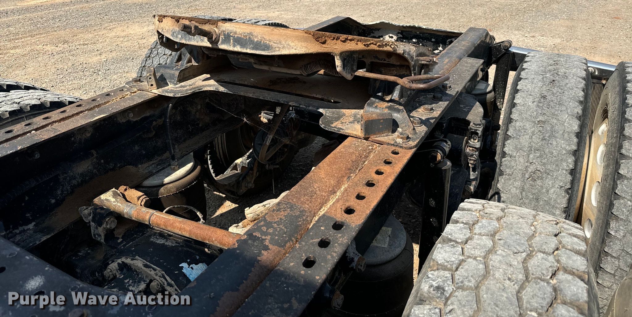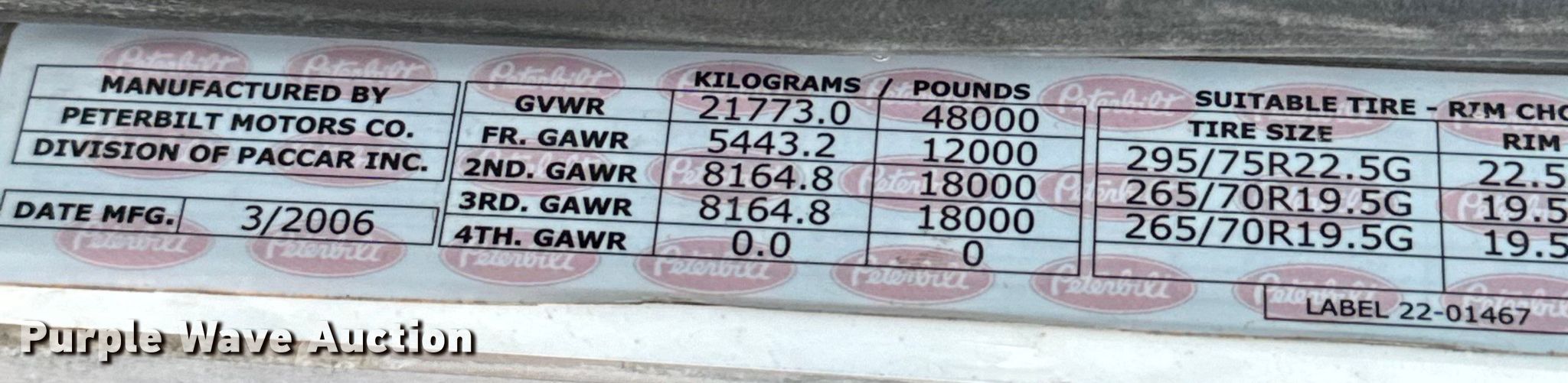 2007 Peterbilt 378 semi truck. Miles: 106,975 on odometer, Hours: 34,508 on meter, VIN: 1XPFDU9X27D858500. Engine Caterpillar C13 Acert, Displacement: 12.5L, Cylinders: 6, Fuel type: Diesel, Engine brake. Transmission Manual, Speed: 10. Chassis Axles: Tandem, Differential lock: Inter-axle, Suspension: Air Dump valves, Brakes: Air, PTO, GVWR: 48,000 lbs FAWR: 12,000 lbs, IAWR: 18,000 lbs, RAWR: 18,000 lbs. Interior AC, Heat, Heated mirrors, Power windows, Cruise control, Air ride cab, Sleeper Sleeper length: 4', Beds: Single, Rear climate control. Features Deck plate: Aluminum, Fifth wheel type: Fixed, Fuel tank: Dual. Tires Front: 295/75R22.5, Rear: 11R22.5. Notes Dash warning indicator: ABS, Windshield chipped or cracked. Oklahoma title. Title has a lien that will be released following the close of the auction. Title distribution may be delayed up to 30 days from verification of funds. Clune Construction LLC. Maysville, OK 73057