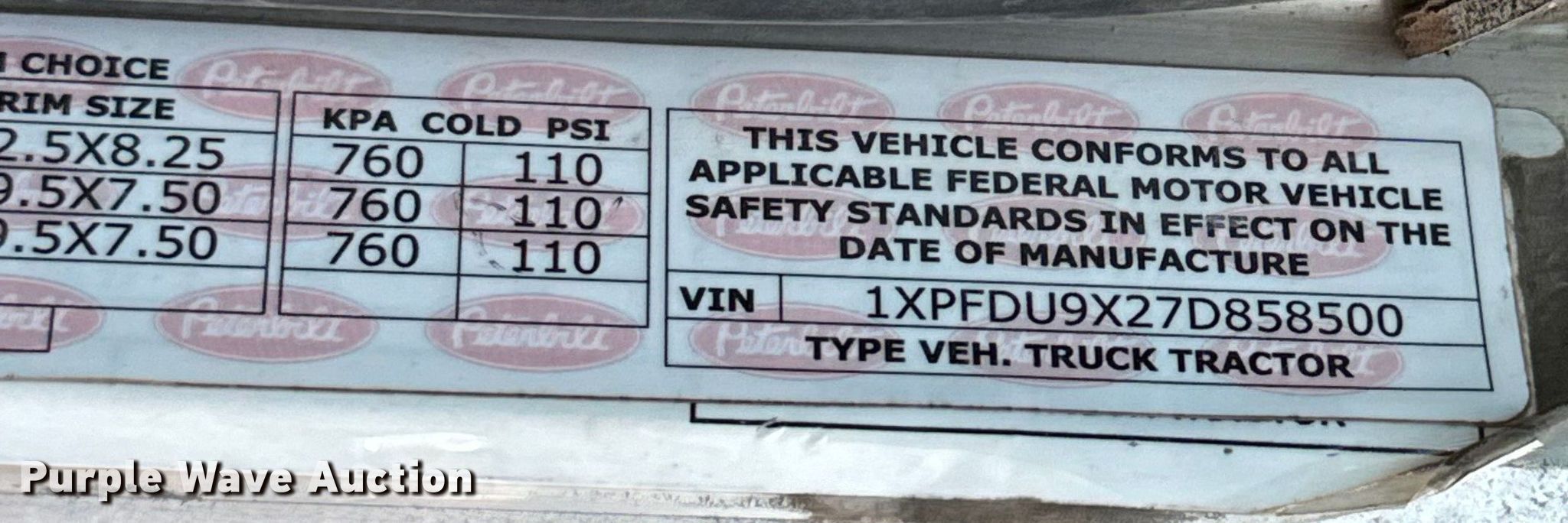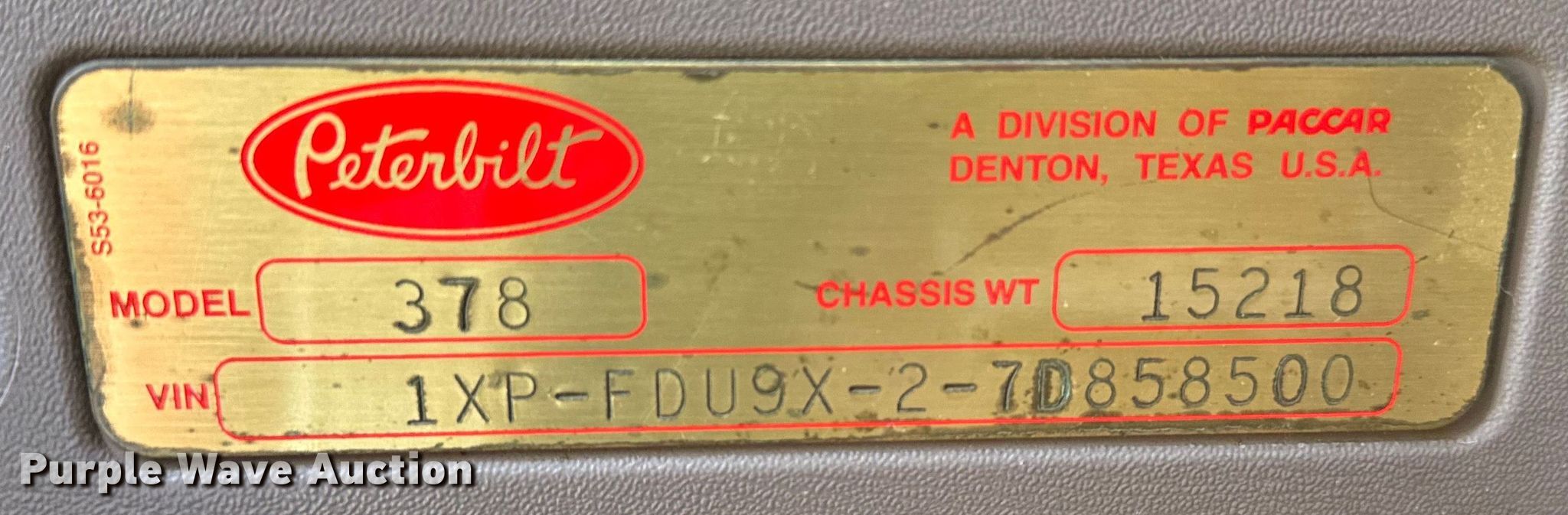Purple Wave is selling a used Truck Tractor in Oklahoma. This item is a 2007 Peterbilt 378 semi truck with the following: Miles: 106,975 on odometer, Hours: 34,508 on meter, VIN: 1XPFDU9X27D858500