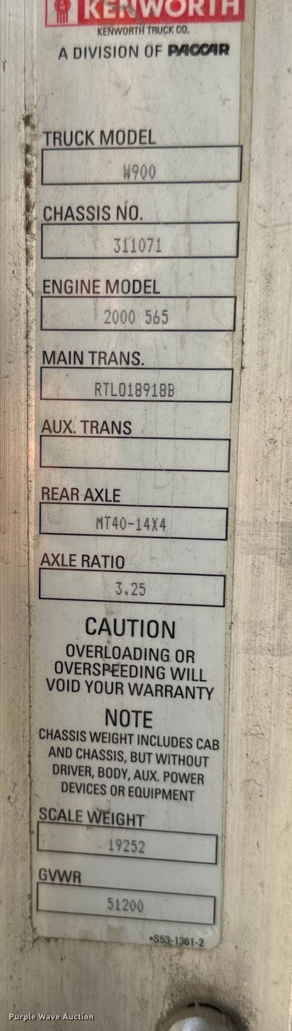 2019 Kenworth W900 semi truck. Miles: 611,681 on odometer, Hours: 19,205 on meter, VIN: 1XKWD49XXKJ311071. Engine Cummins ISX15, Displacement: 15.0L, Cylinders: 6, Fuel type: Diesel, Engine brake. Transmission Eaton Fuller RTL018918B, Manual, Speed: 18. Chassis Axles: Tandem, Differential lock: Inter-axle, Suspension: Air Dump valves, Brakes: Air, GVWR: 51,200 lbs. Interior AC, Heat, Heated mirrors, Power windows, Power locks, Cruise control, Air ride cab, Sleeper Kenworth Studio Sleeper, Sleeper length: 72", Beds: Double bunk, Refrigerator, Rear climate control. Features Deck plate: Aluminum, Fifth wheel type: Air operated, Sliding, Fuel tank: Dual. Tires Size: 285/75R24.5. Notes Windshield chipped or cracked, Dead battery, Engine head gasket issues , Non-operational unit. Kansas title. Mileage has not been verified. Odometer discrepancy will be marked on the title. Commerce Bank. Great Bend, KS 67530