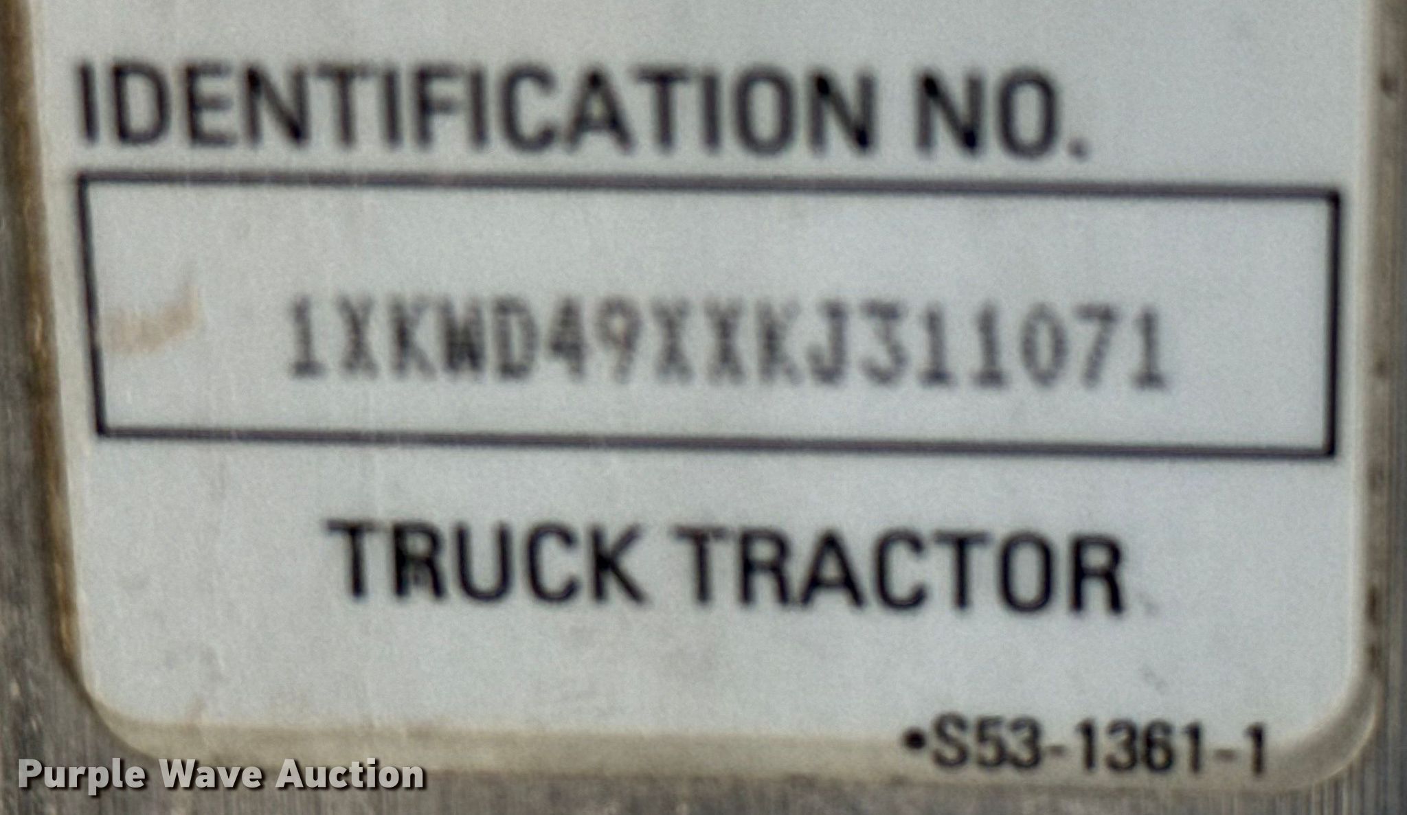 Purple Wave is selling a used Truck Tractor in Kansas. This item is a 2019 Kenworth W900 semi truck with the following: Miles: 611,681 on odometer, Hours: 19,205 on meter, VIN: 1XKWD49XXKJ311071