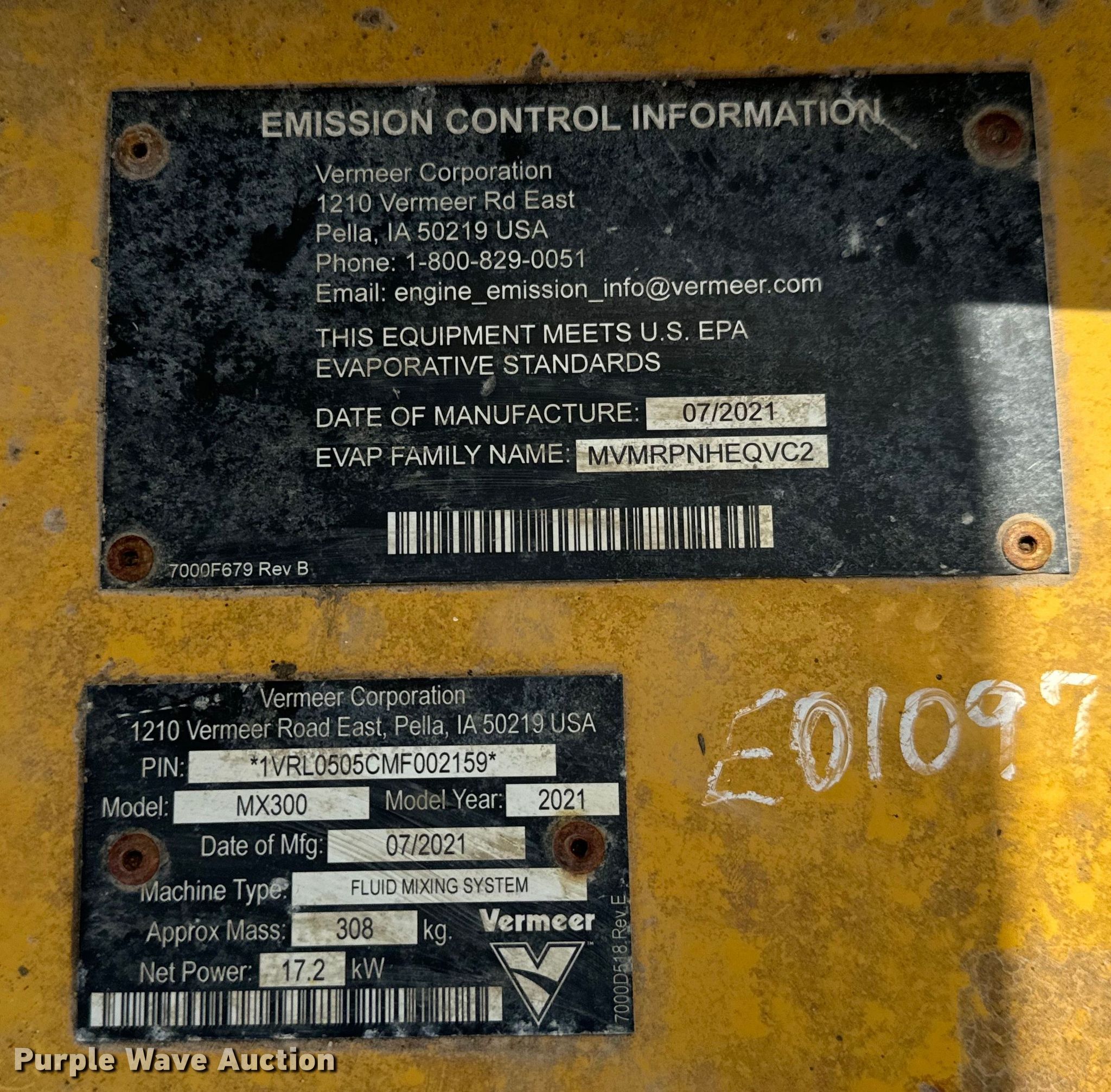 (2) Vermeer MX300 fluid mixing systems. 2022. Hours: 566 on meter, Serial: 1VRL0505KNF002189. Engine Kohler ECH730, Displacement: 747 cc, Cylinders: 2, Fuel type: Gas. Features TK1000 poly tank. 2021 Hours: 161 on meter, Serial: 1VRL0505CMF002159. Engine Kohler ECH730, Displacement: 747 cc, Cylinders: 2, Fuel type: Gas. Features TK1000 poly tank. Notes Trailer not included. Superior Excavating LLC - Open Inspection August 14 and 19. 10401 North Woodlawn Boulevard. Valley Center, KS 67147