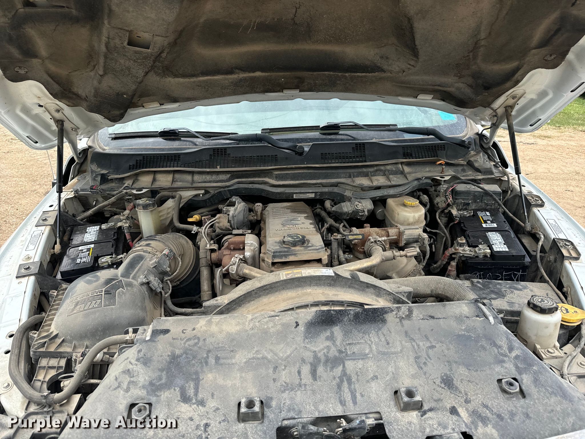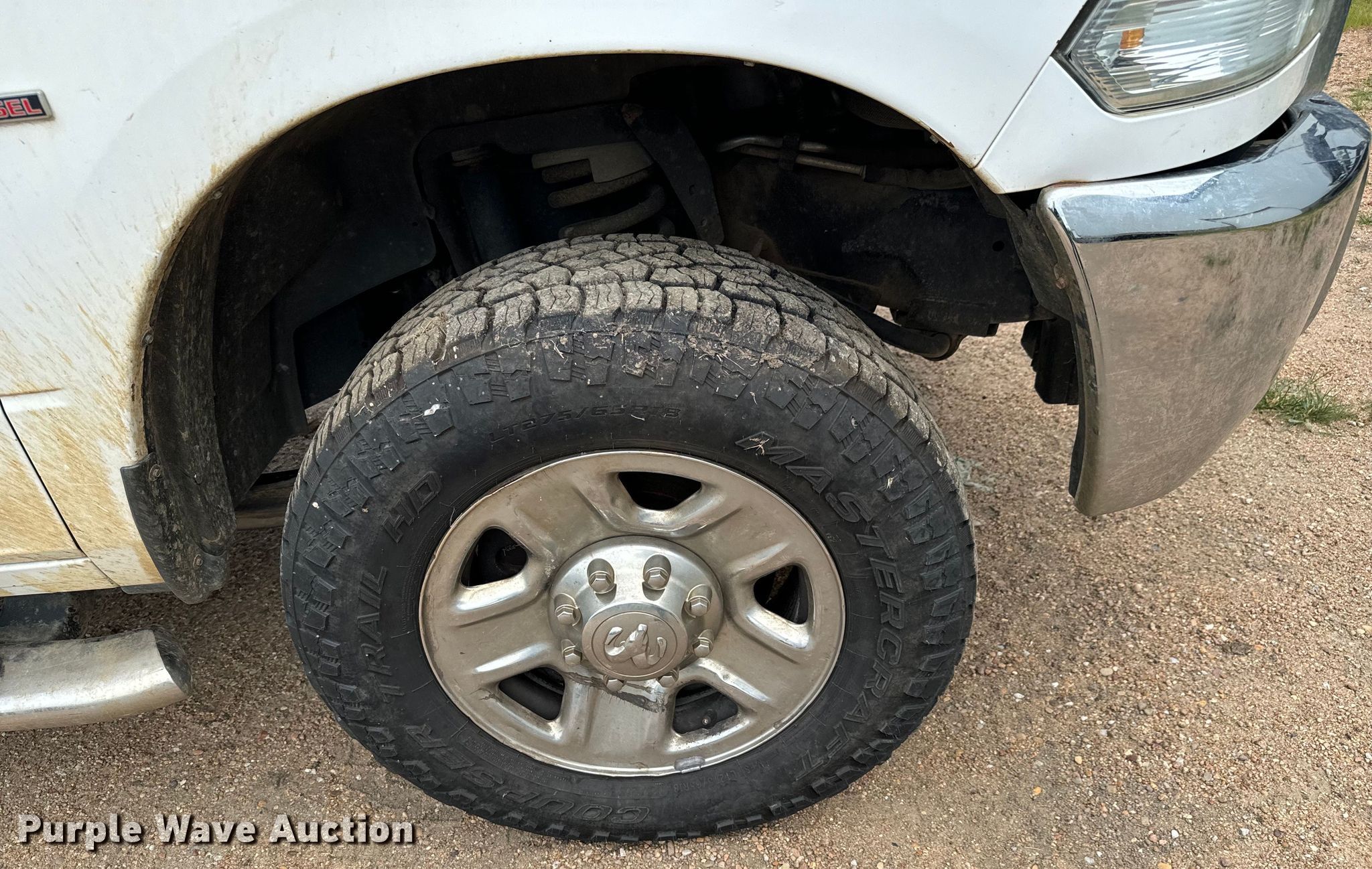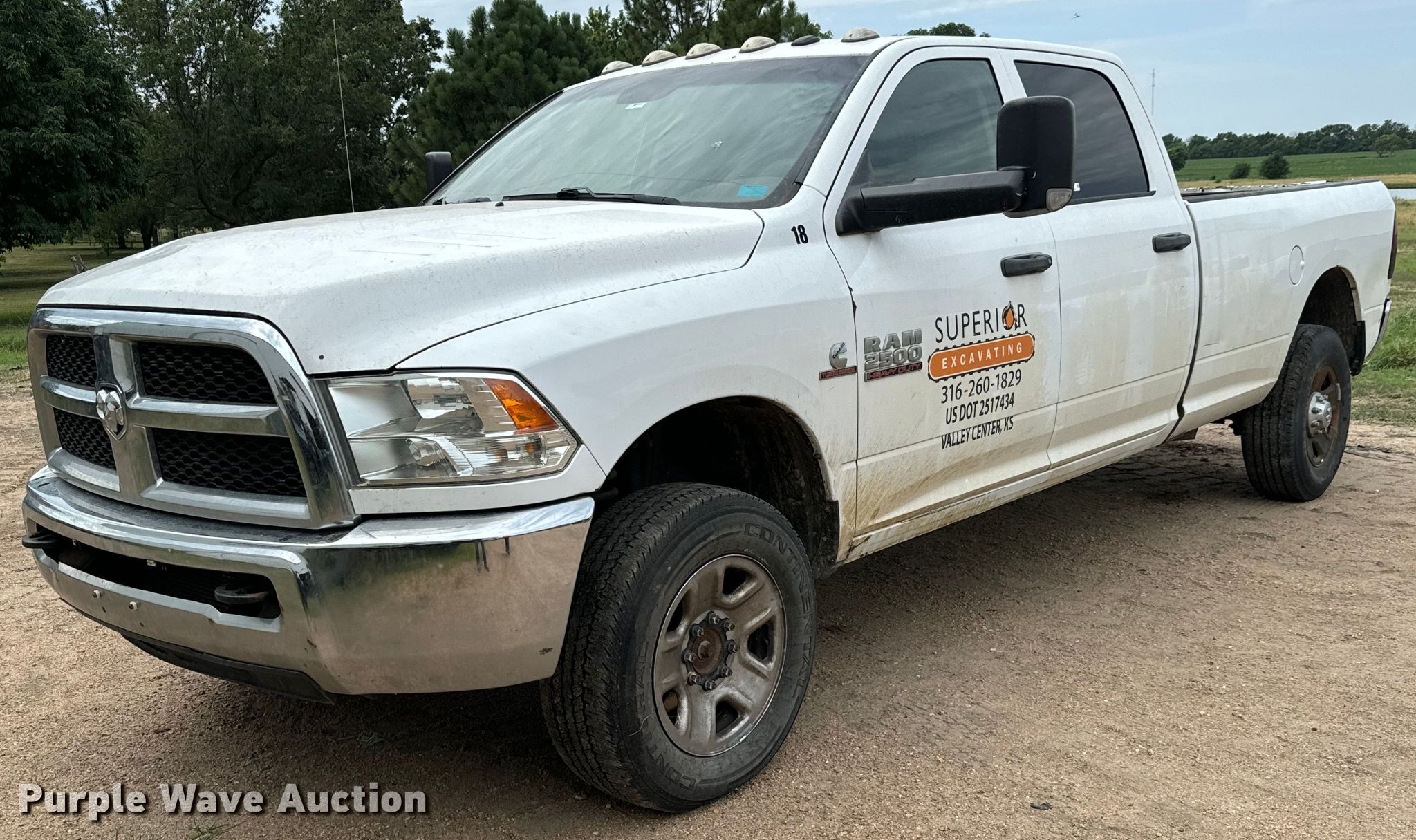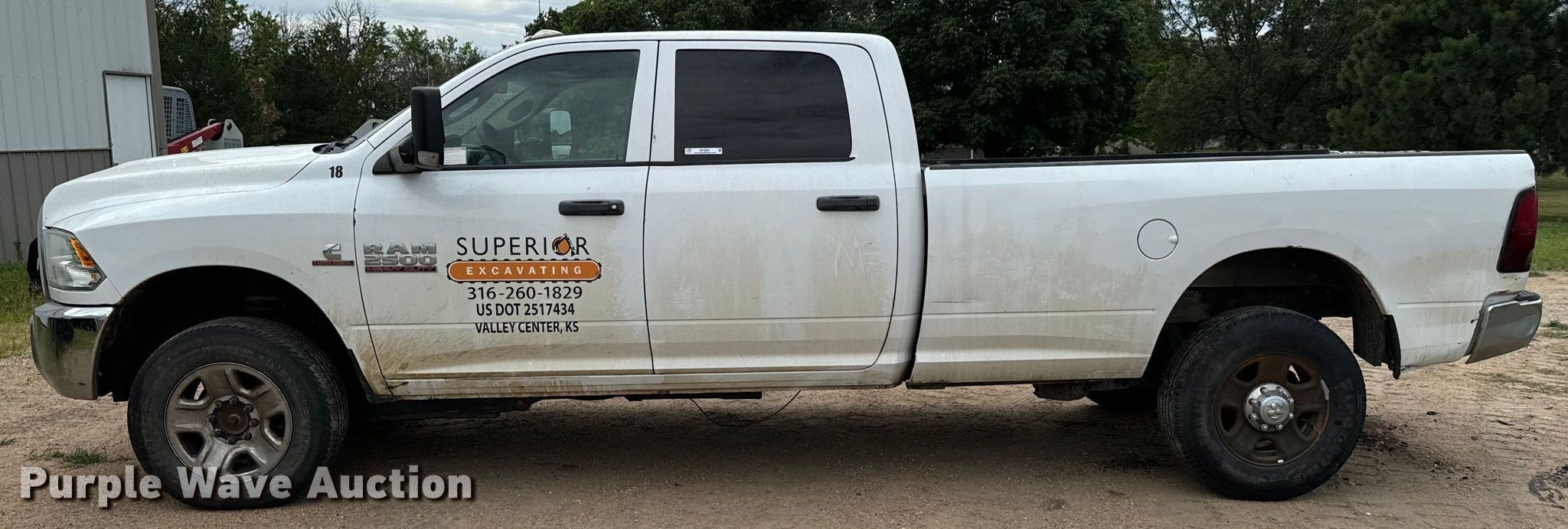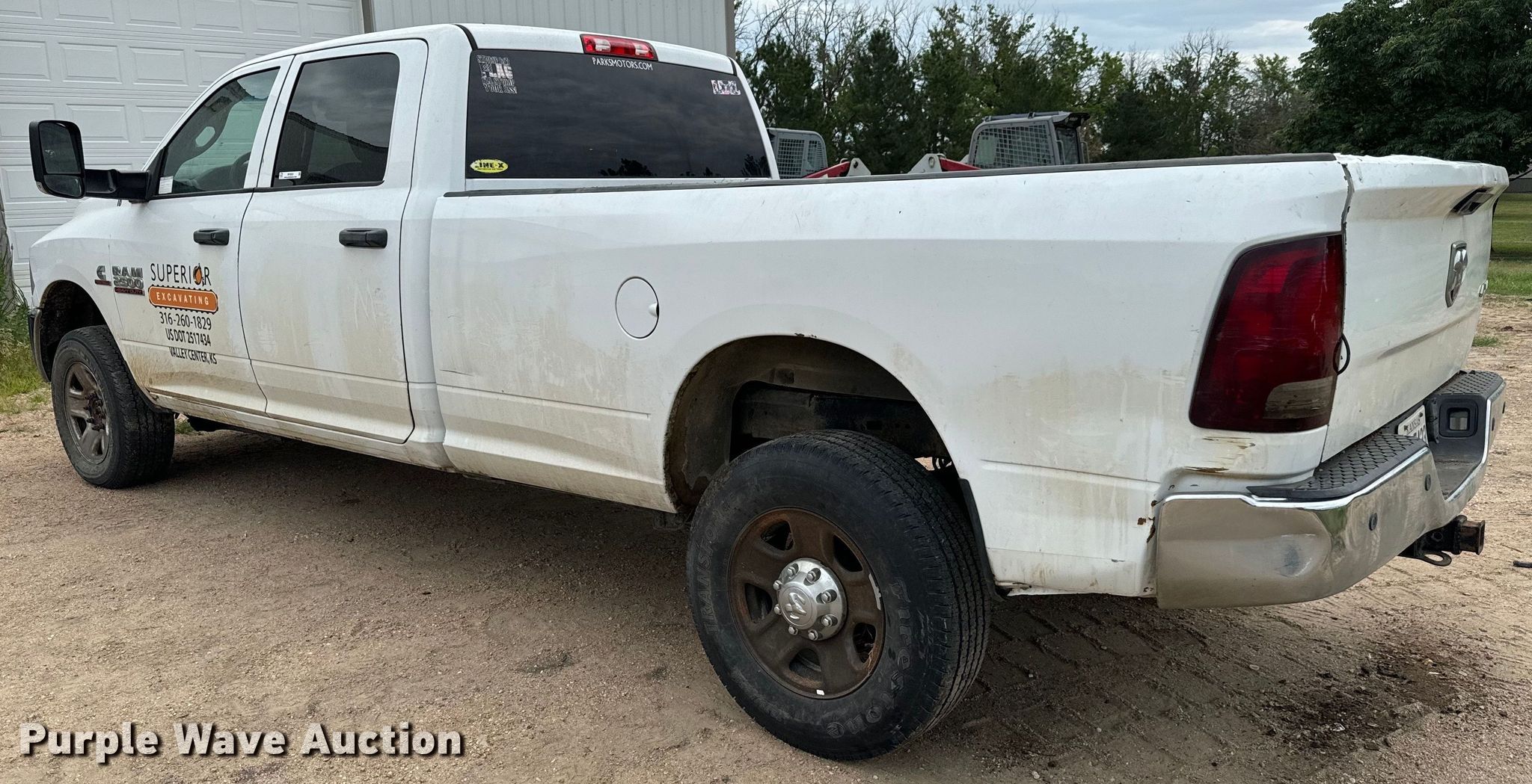 2017 Dodge Ram 2500HD Crew Cab pickup truck. Miles: 254,397 on odometer, VIN: 3C6UR5HL0HG518725, Unit #: 18. Engine Displacement: 6.7L L6 OHV, Cylinders: 6, Fuel type: Diesel. Transmission Automatic, Four wheel drive. Interior AC, Heat, Heated mirrors, Power windows, Power locks, Cruise control, Backup camera. Tires Front: 275/65R18, Rear: 275/70R18. Notes Dash warning indicator: TPMS, Brake, Regen, Windshield chipped or cracked, Hole in tail light, Tailgate latch issues, Passenger side mirror cracked, Non-operational brakes. Kansas title. Title distribution may be delayed up to 30 days from verification of funds. Superior Excavating LLC - Open Inspection August 14 and 19. 10401 North Woodlawn Boulevard. Valley Center, KS 67147