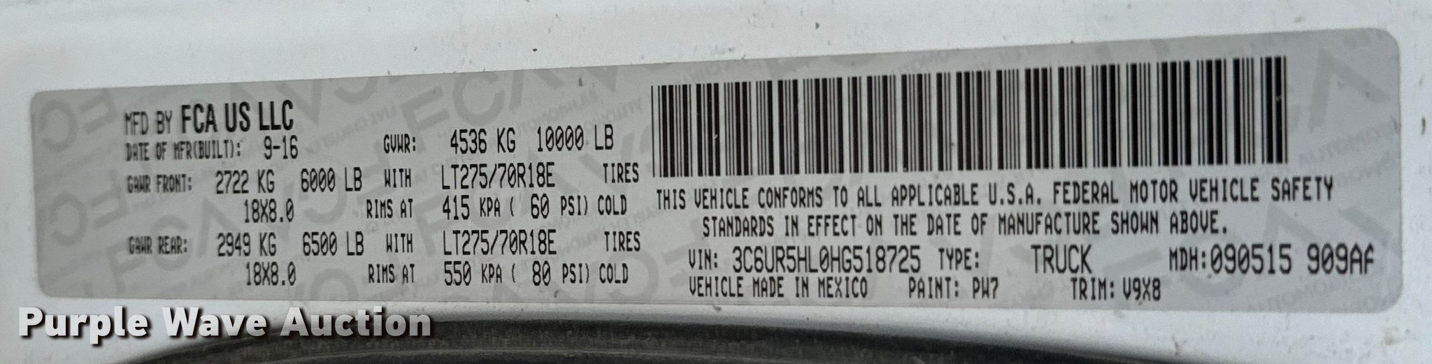 - VIN: 3C6UR5HL0HG518725