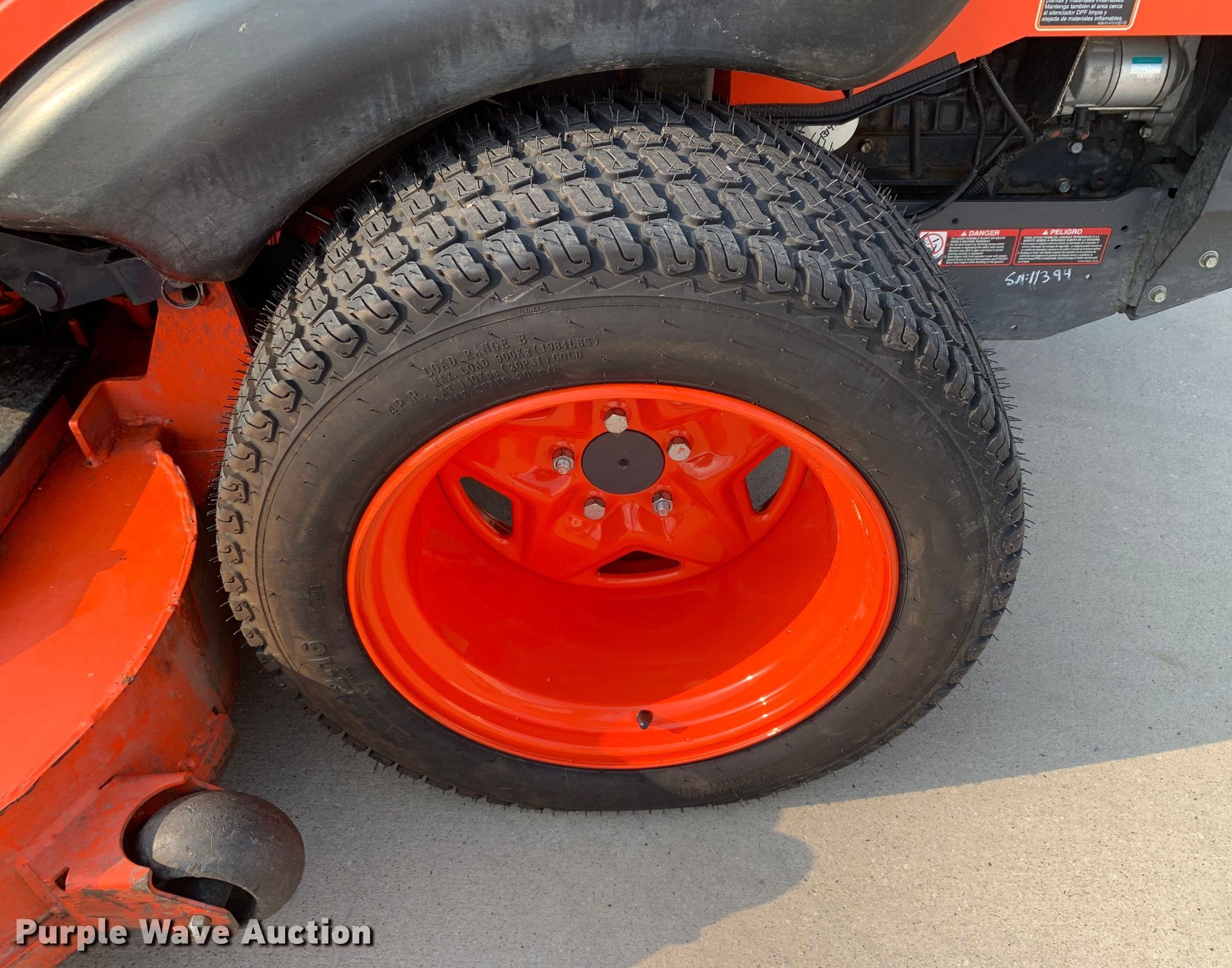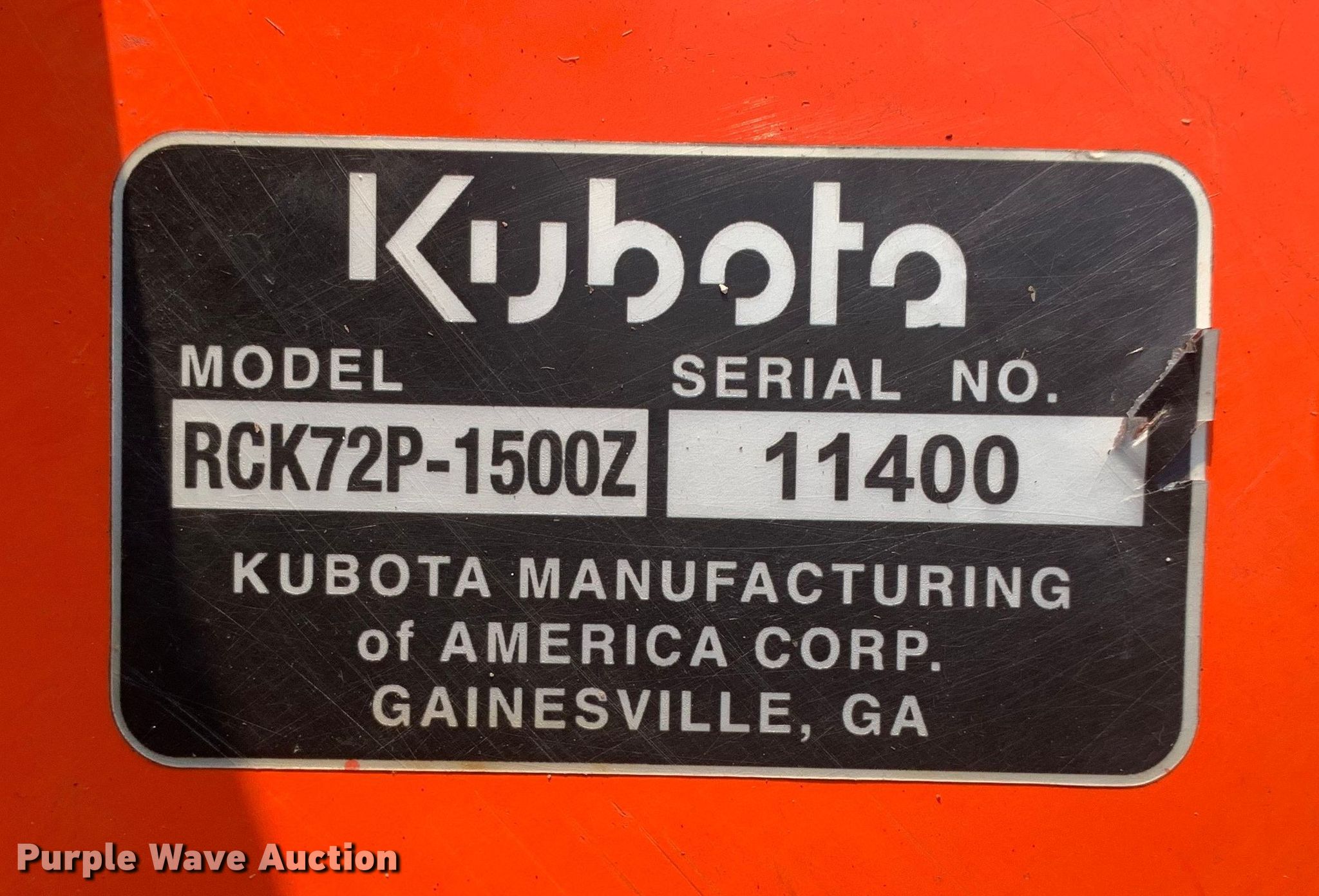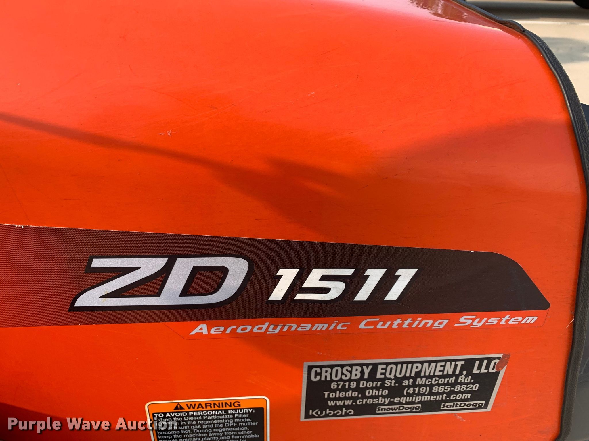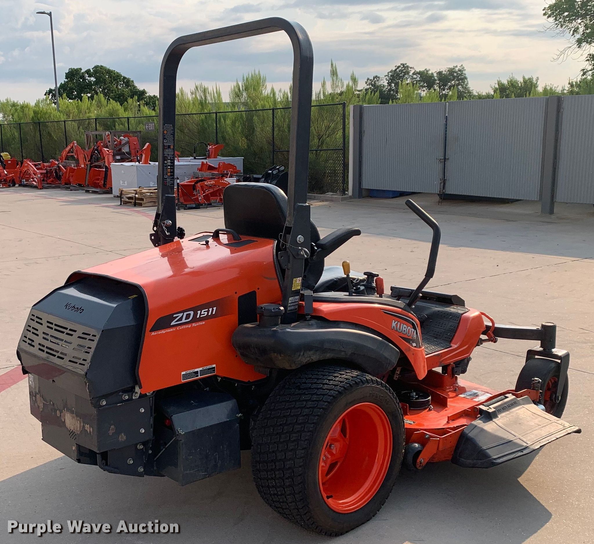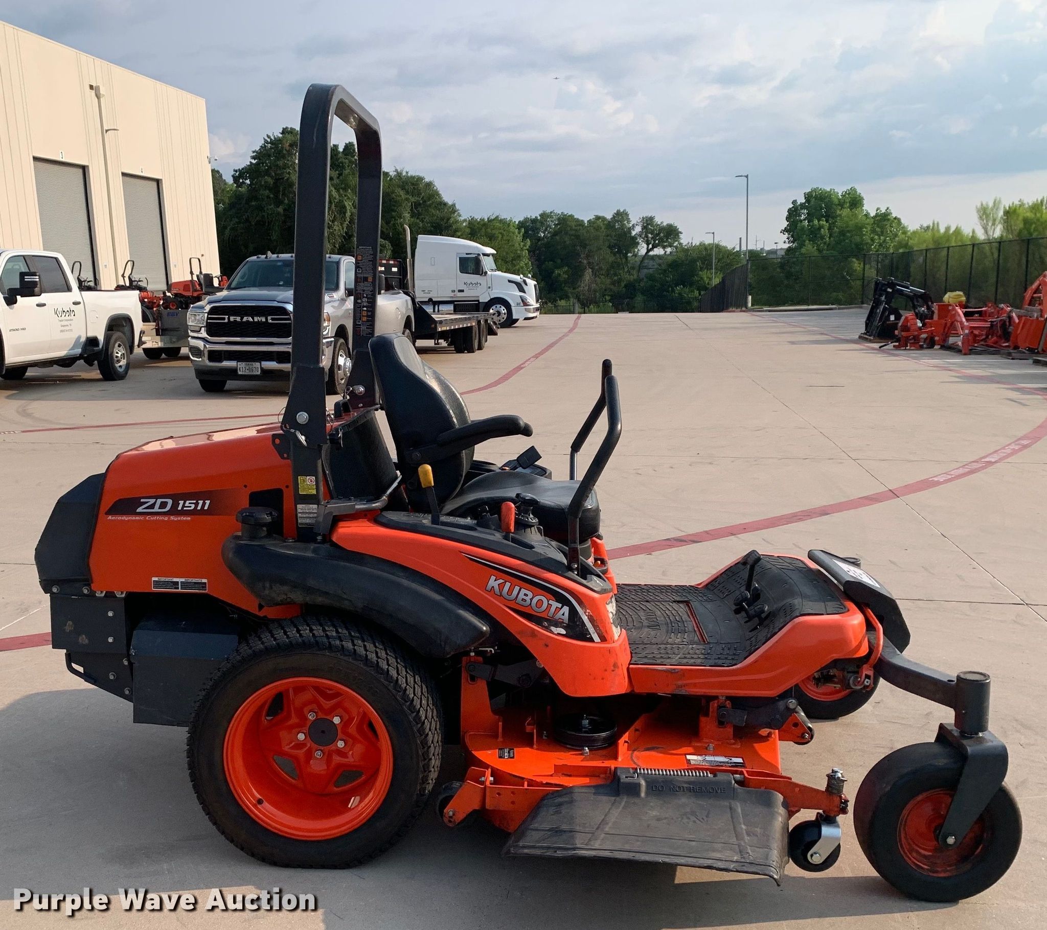 Kubota ZD1511LF ZTR lawn mower. Hours: 1,320 on meter, Cutting width: 72", Serial: 11394. Engine Kubota V1505-T-EF04, Displacement: 1.5L, Cylinders: 4, Fuel type: Diesel. Transmission Hydrostatic. Chassis PTO. Operators station OROPS. Features Mower deck Width: 72", Kubota RCK72P-1500Z, Serial: 11400, Hydraulic front deck lift. Tires Front: 15x6.50-8, Rear: 26x12-16. Notes No manufacturer's warranty included. Kubota Tractor Corp. Grapevine, TX 76051