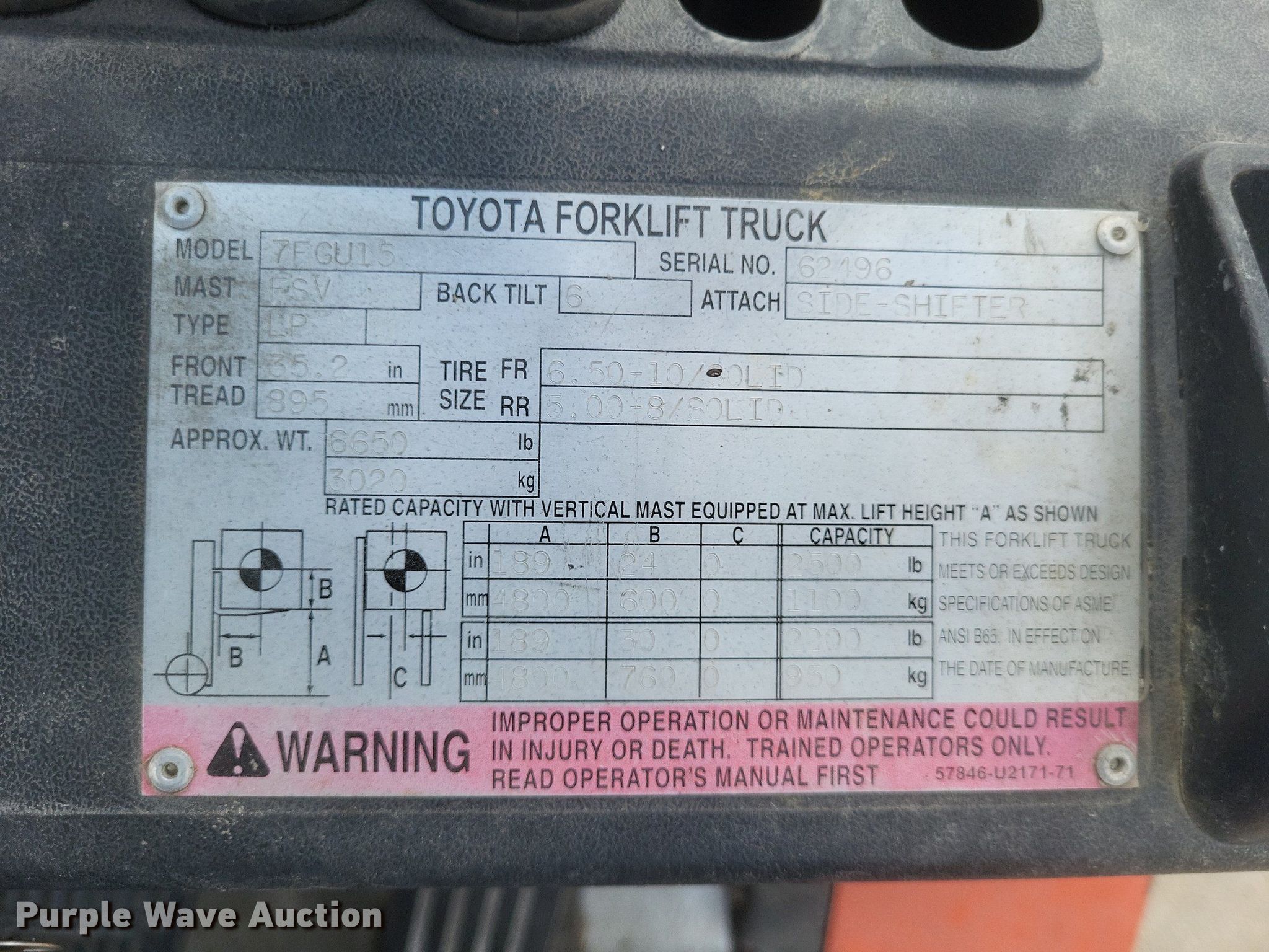 Toyota 7FGU15 forklift. Hours: 10,249 on meter, Miles or hours may vary, unit still in use, Serial: 62496. Engine Toyota, Cylinders: 4, Fuel type: LPG LP bottle: Not included. Transmission Powershift. Operators station OROPS. Features Maximum lift capacity: 6,650 lbs, Maximum lift height: 189", Mast stages: 2, Side shift, Mast tilt, Fork length: 41". Tires Front: 6.50-10, Rear: 5.00-8. Notes Possible starter issues. Kohlfeld Distributing Inc.. Jackson, MO 63755