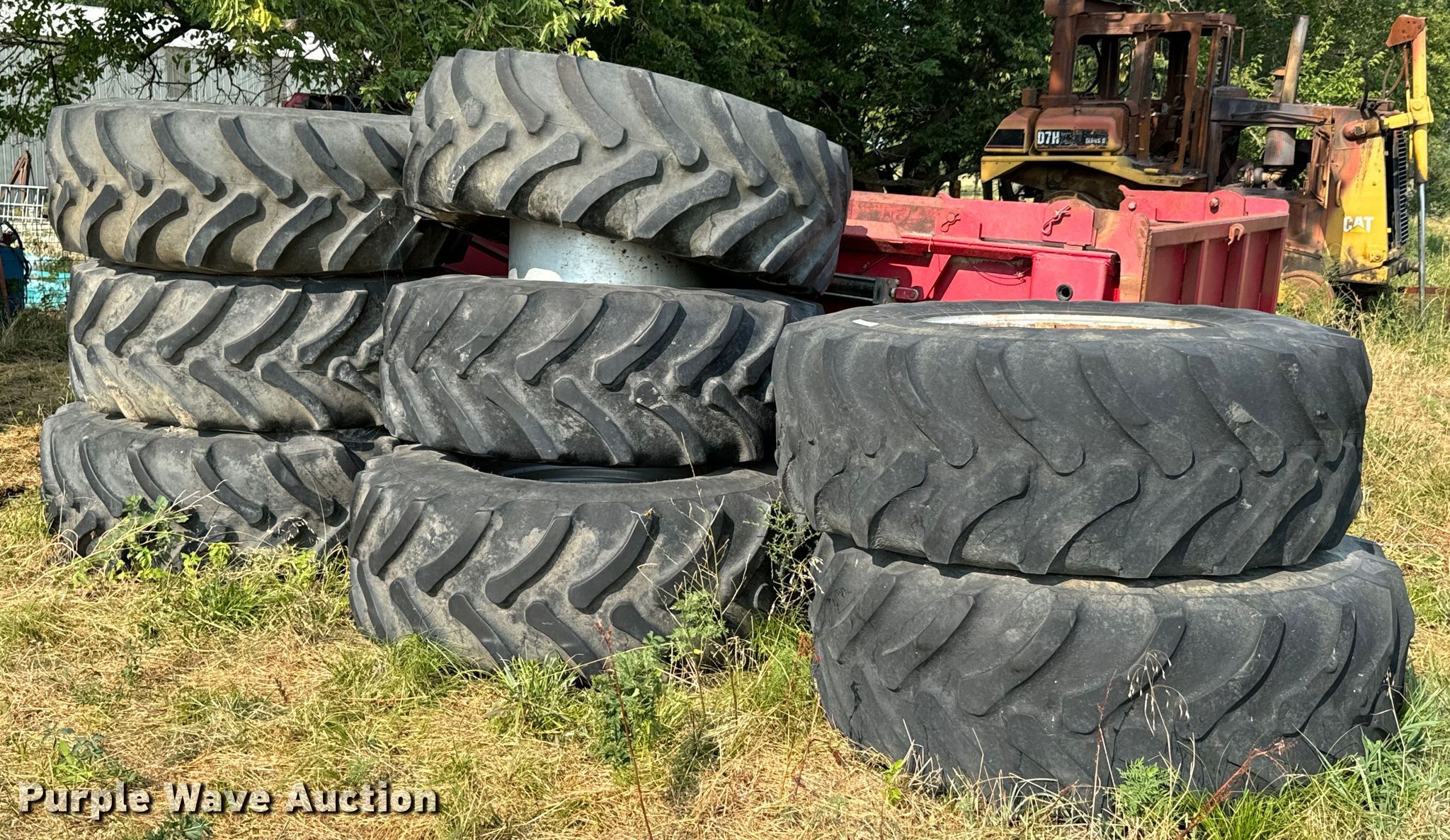 Purple Wave is selling a used Industrial Tires or Tracks in Kansas. This item is a (8) tractor wheels and tires with the following: (7) wheels and tires, (1) without wheel, Tire size: 24.5R32