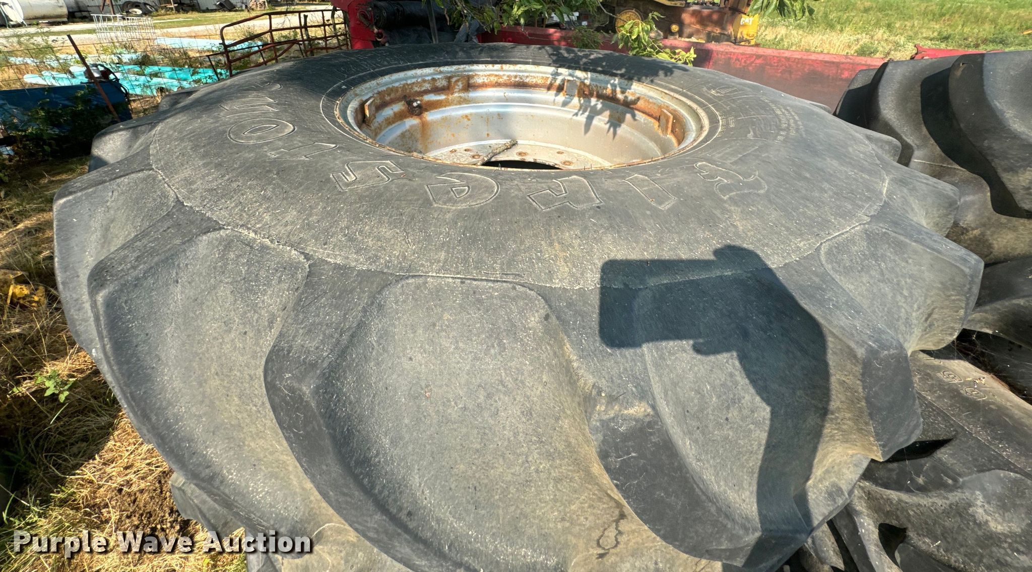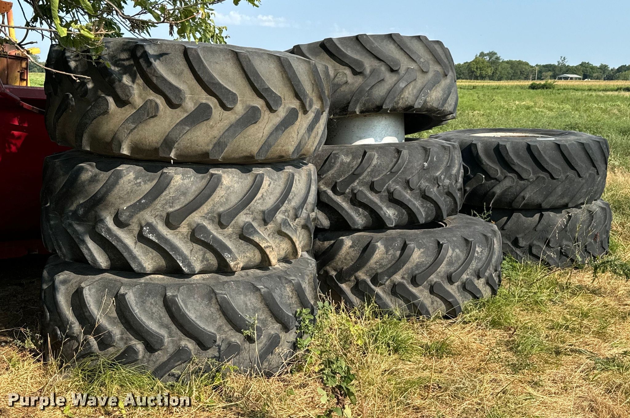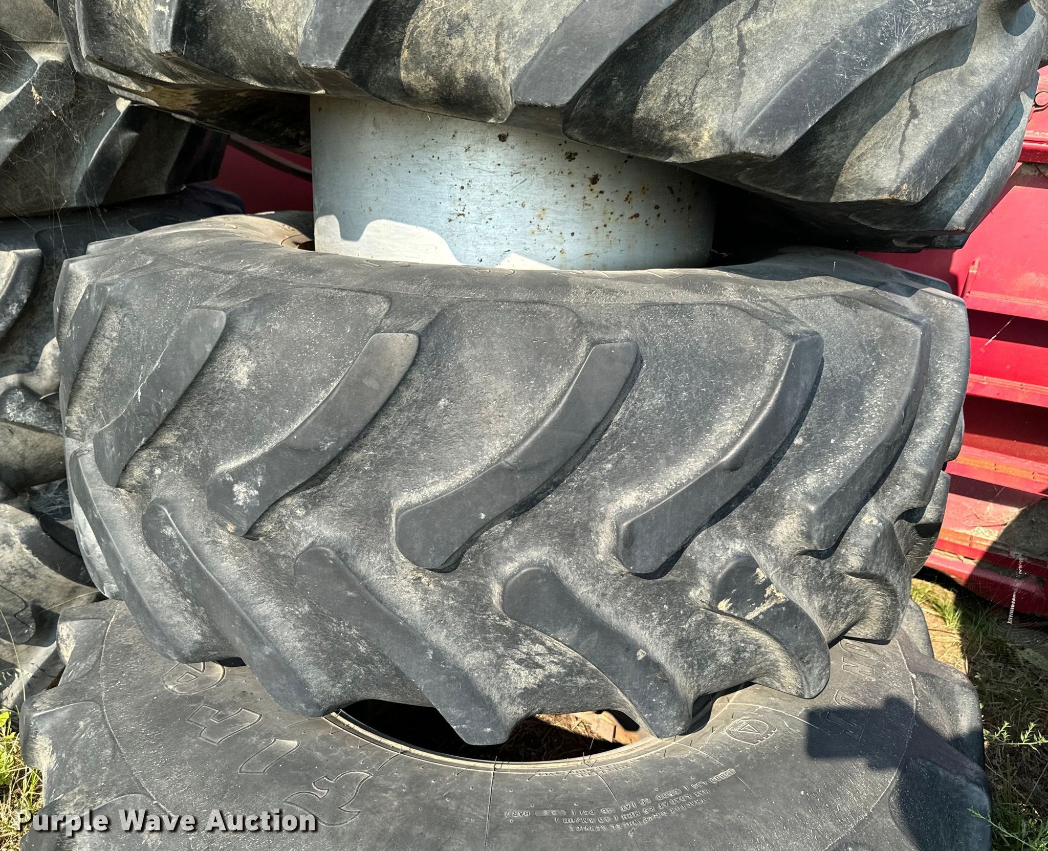 (8) tractor wheels and tires. (7) wheels and tires, (1) without wheel, Tire size: 24.5R32. Notes Removed from a Case IH 9270 tractor. Myers Dozer Service. Dennis, KS 67341