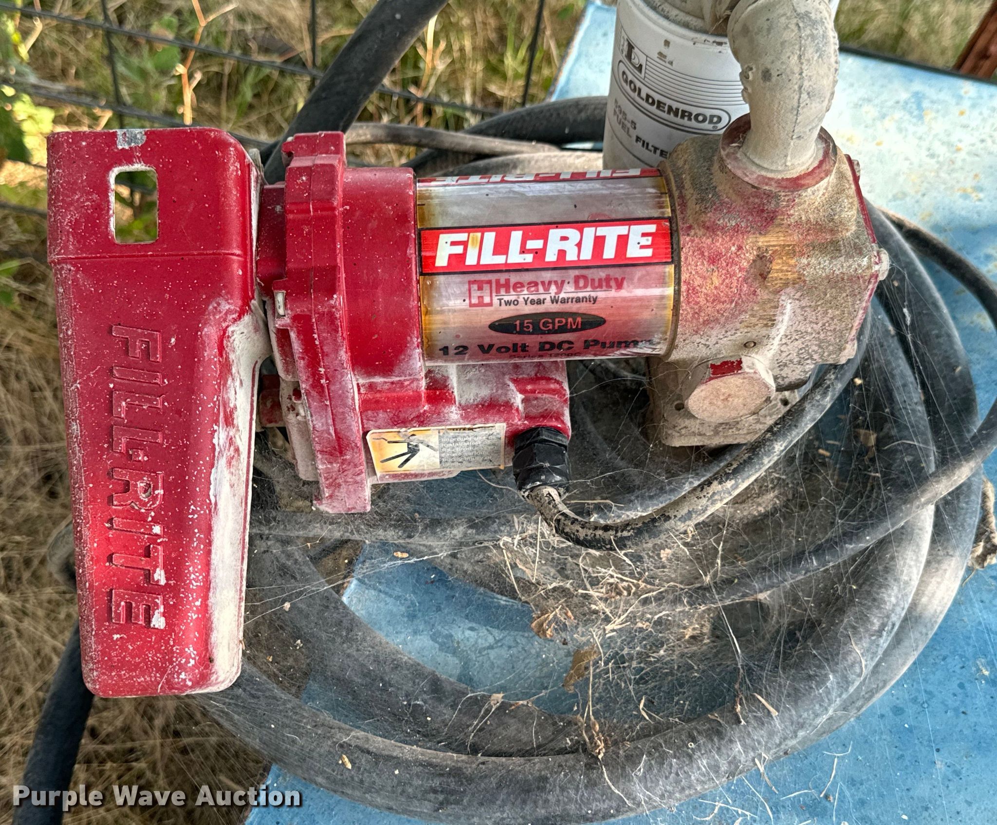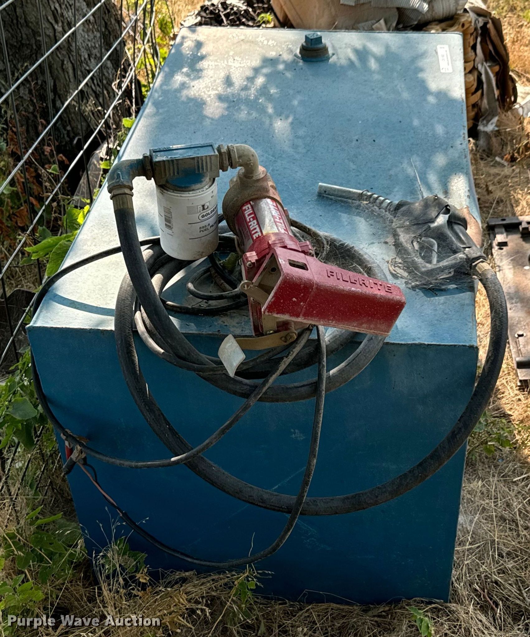 Purple Wave is selling a used Fuel and Lube in Kansas. This item is a Auxiliary fuel tank with the following: Approx. capacity: 200 gallons, 48" W x 30" H, Fill-Rite 12v DC pump, GPM: 15