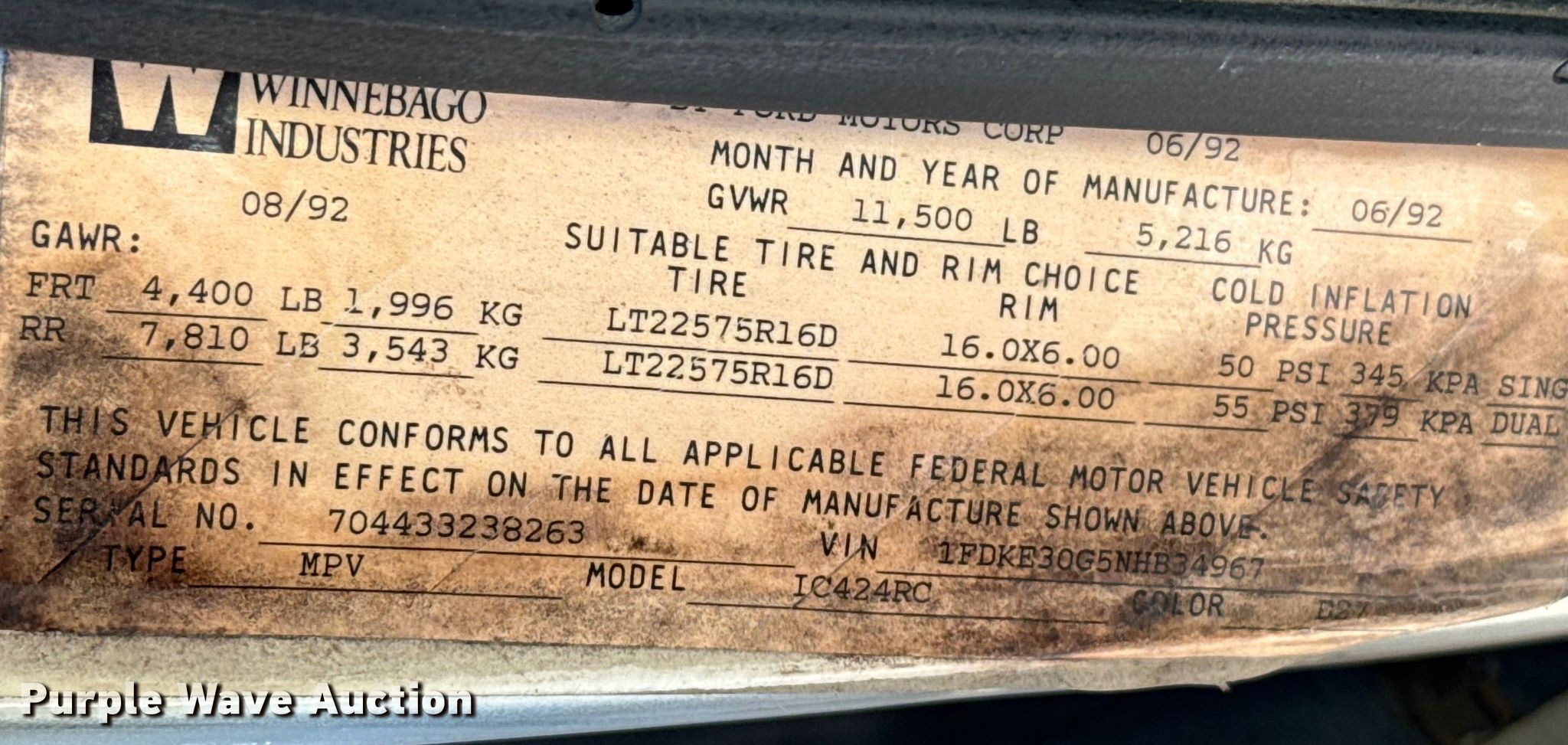 Purple Wave is selling a used RV or Camper in Kansas. This item is a 1992 Ford E350 RV with the following: Miles: 90,887 on odometer, VIN: 1FDKE30G5NHB34967