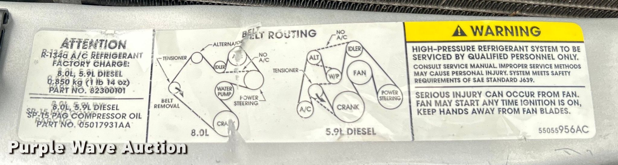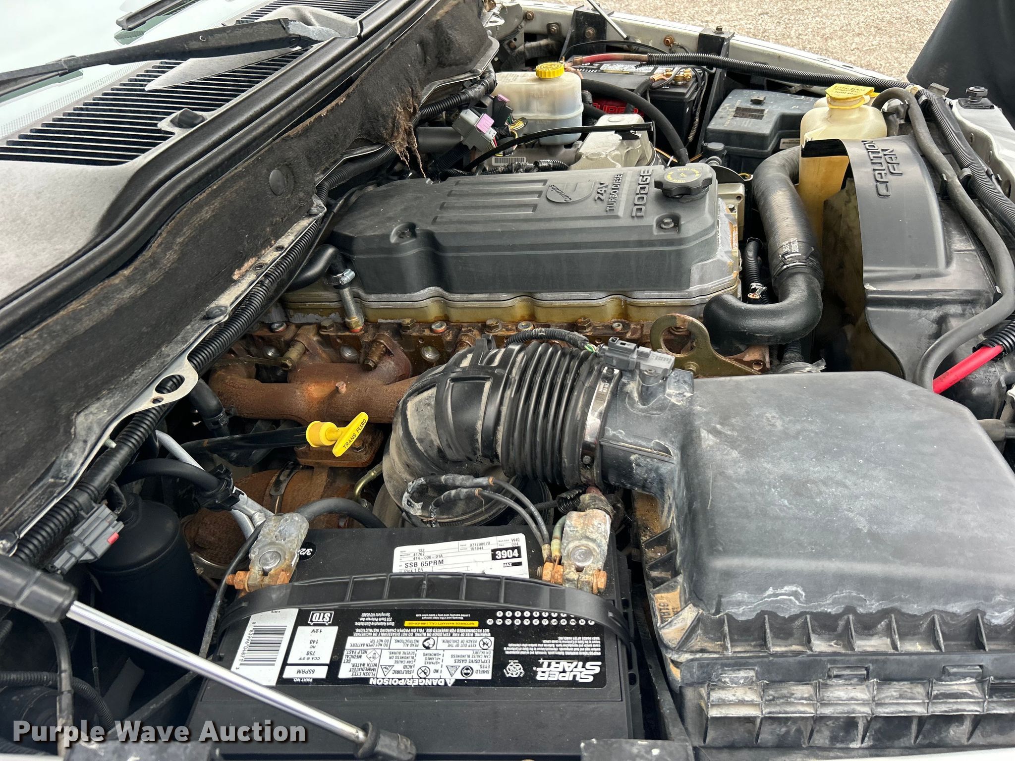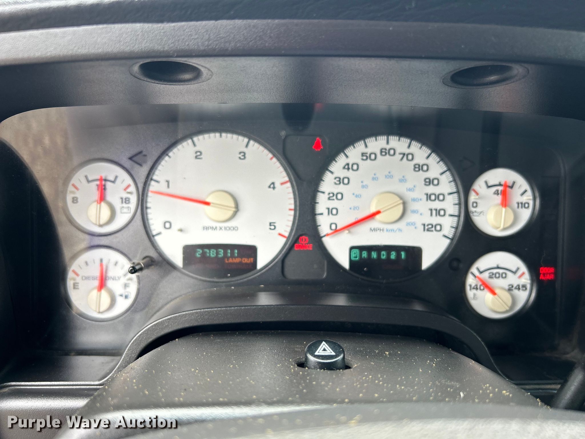 2004 Dodge Ram 2500 Quad Cab pickup truck. Miles: 278,311 on odometer, VIN: 3D7KA28C74G133085. Engine Displacement: 5.9L L6 OHV, Cylinders: 6, Fuel type: Diesel. Transmission Automatic. Interior AC, Heat, Heated mirrors, Power windows, Power locks, Cruise control. Tires Size: 265/70R17. Notes Dash warning indicator: Lamp out, Hydraulic hood spring issues, weak. Oklahoma title. Title distribution may be delayed up to 14 days from verification of funds. 15107 North 137th East Avenue. Collinsville, OK 74021