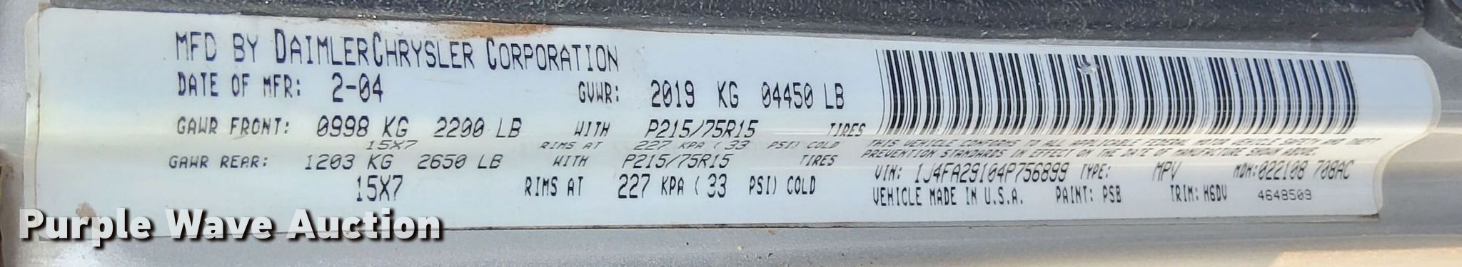 • VIN: 1J4FA29104P756899