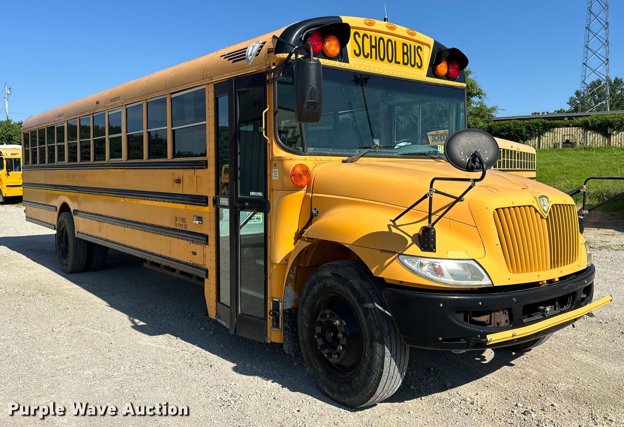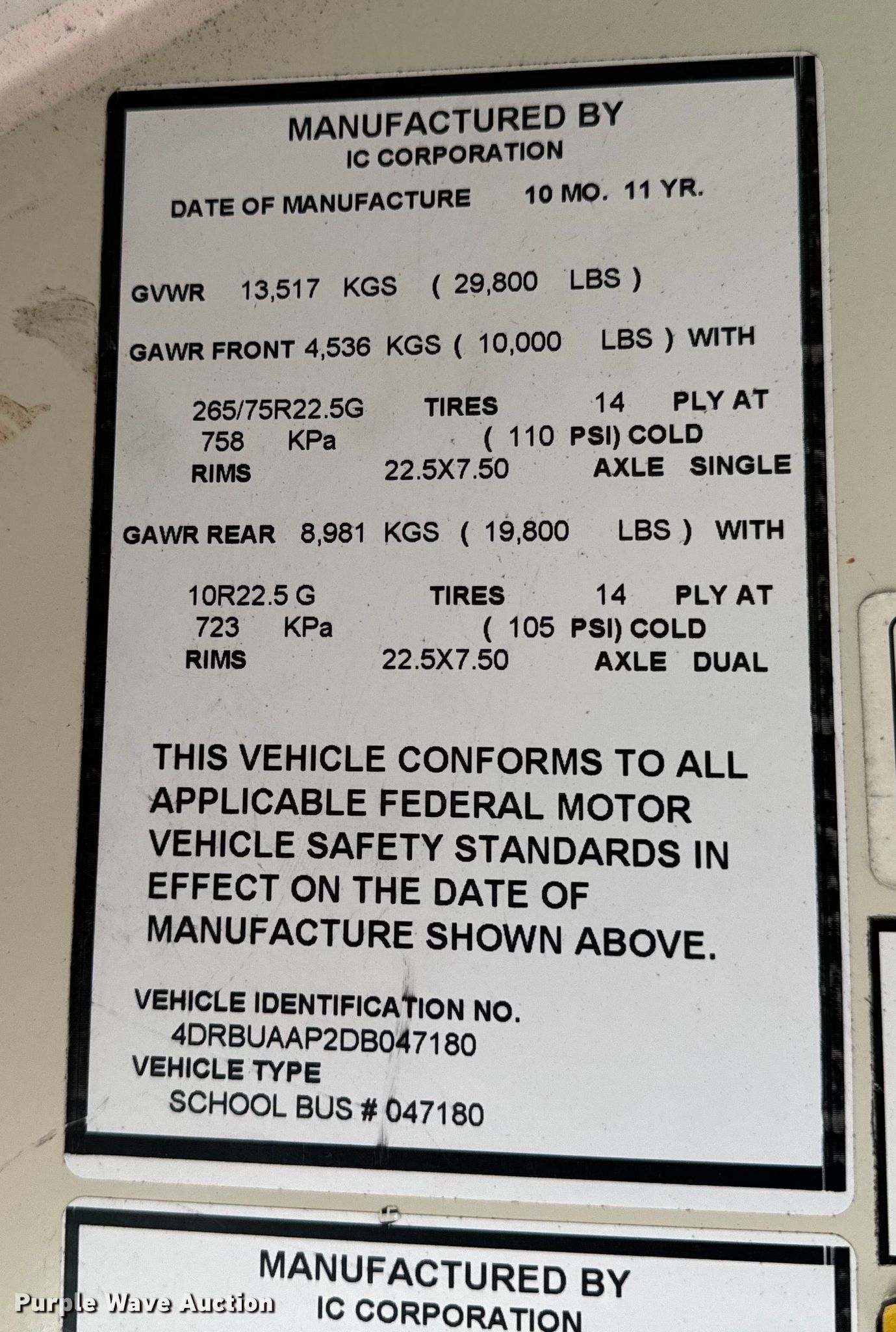 2013 IC Corporation PB10500 school bus. Miles: 90,172 on odometer, Hours: 6,634 on meter, VIN: 4DRBUAAP2DB047180. Engine International MaxxForce, Displacement: 7.6L, Cylinders: 6, Fuel type: Diesel. Transmission Automatic. Chassis Axles: Single, Suspension: Spring, Brakes: Hydraulic, GVWR: 29,800 lbs. Interior Heat, Heated mirrors, Cruise control, Electric passenger sliding door, Passengers: 71, Adult seats: 25. Tires Size: 11R22.5. Notes Windshield chipped or cracked. Illinois title. Seller is a Missouri licensed motor vehicle dealer. Title will be assigned and distributed by the dealer. Please contact the seller for distribution questions. Title distribution may be delayed up to 14 days from verification of funds. Lexington Diesel Services LLC. Lexington, MO 64067