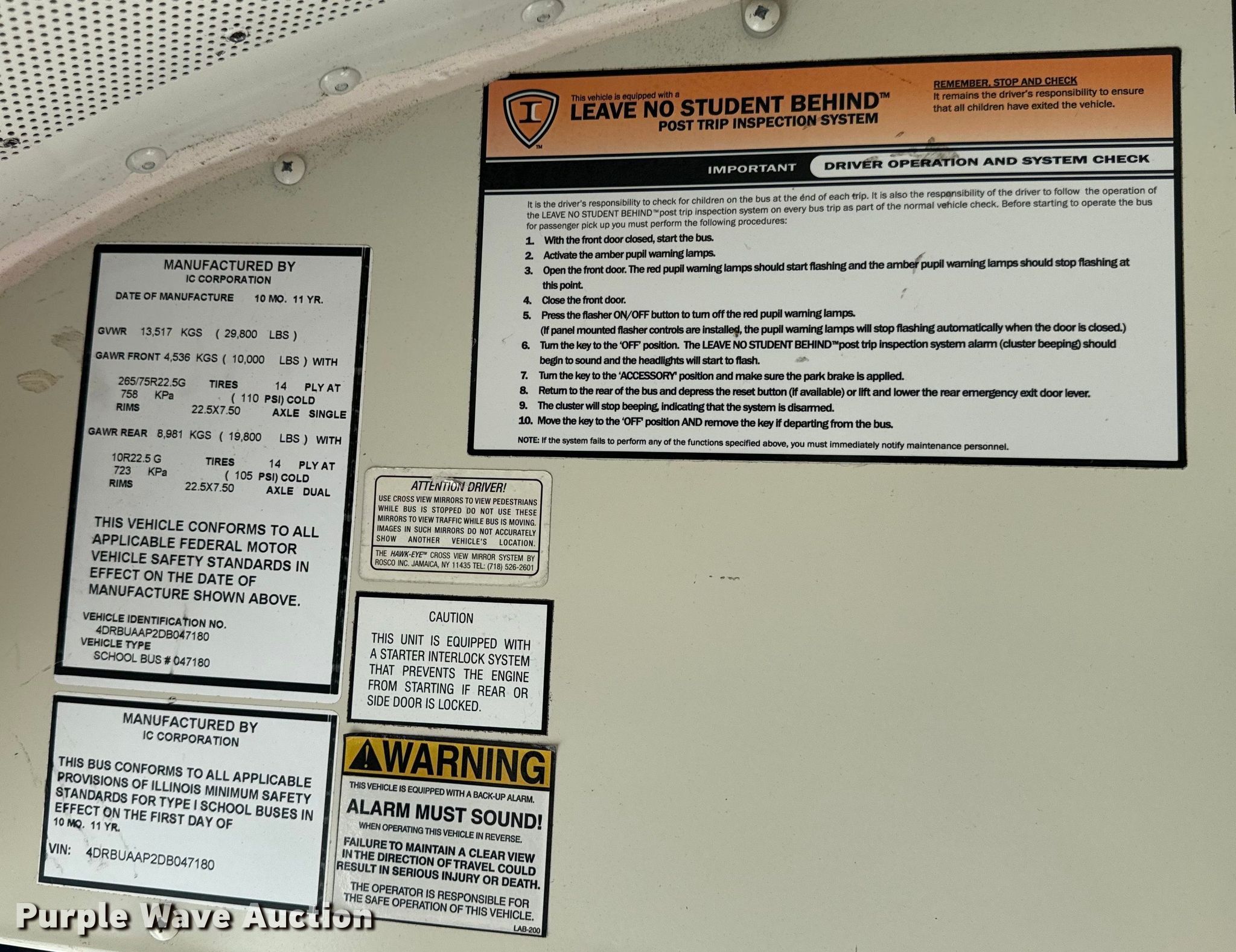 Purple Wave is selling a used Bus in Missouri. This item is a 2013 IC Corporation PB10500 school bus with the following: Miles: 90,172 on odometer, Hours: 6,634 on meter, VIN: 4DRBUAAP2DB047180