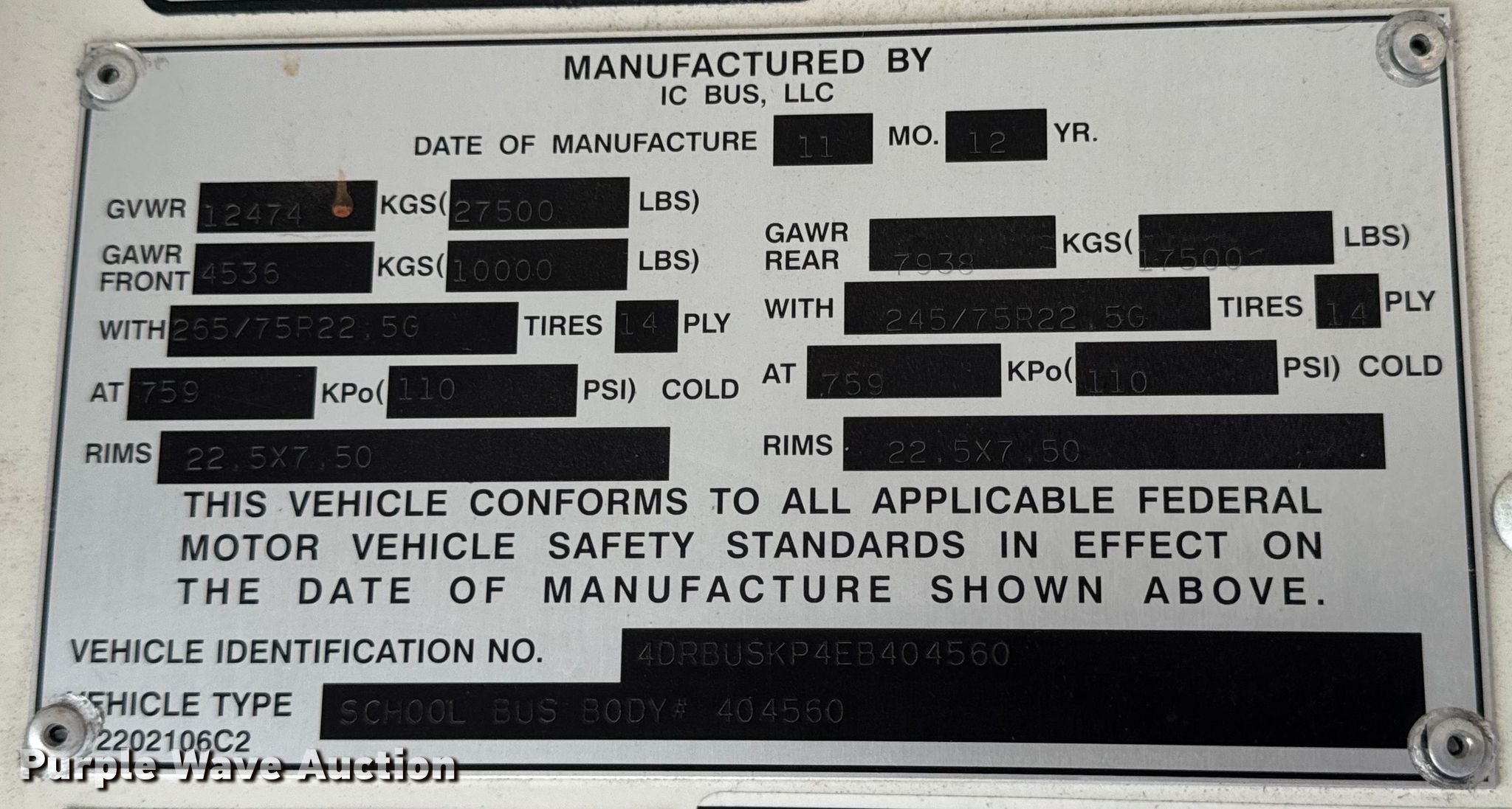 Purple Wave is selling a used Bus in Missouri. This item is a 2014 IC Corporation PB10500 school bus with the following: Miles: 87,764 on odometer, Hours: 4,780 on meter, VIN: 4DRBUSKP4EB404560