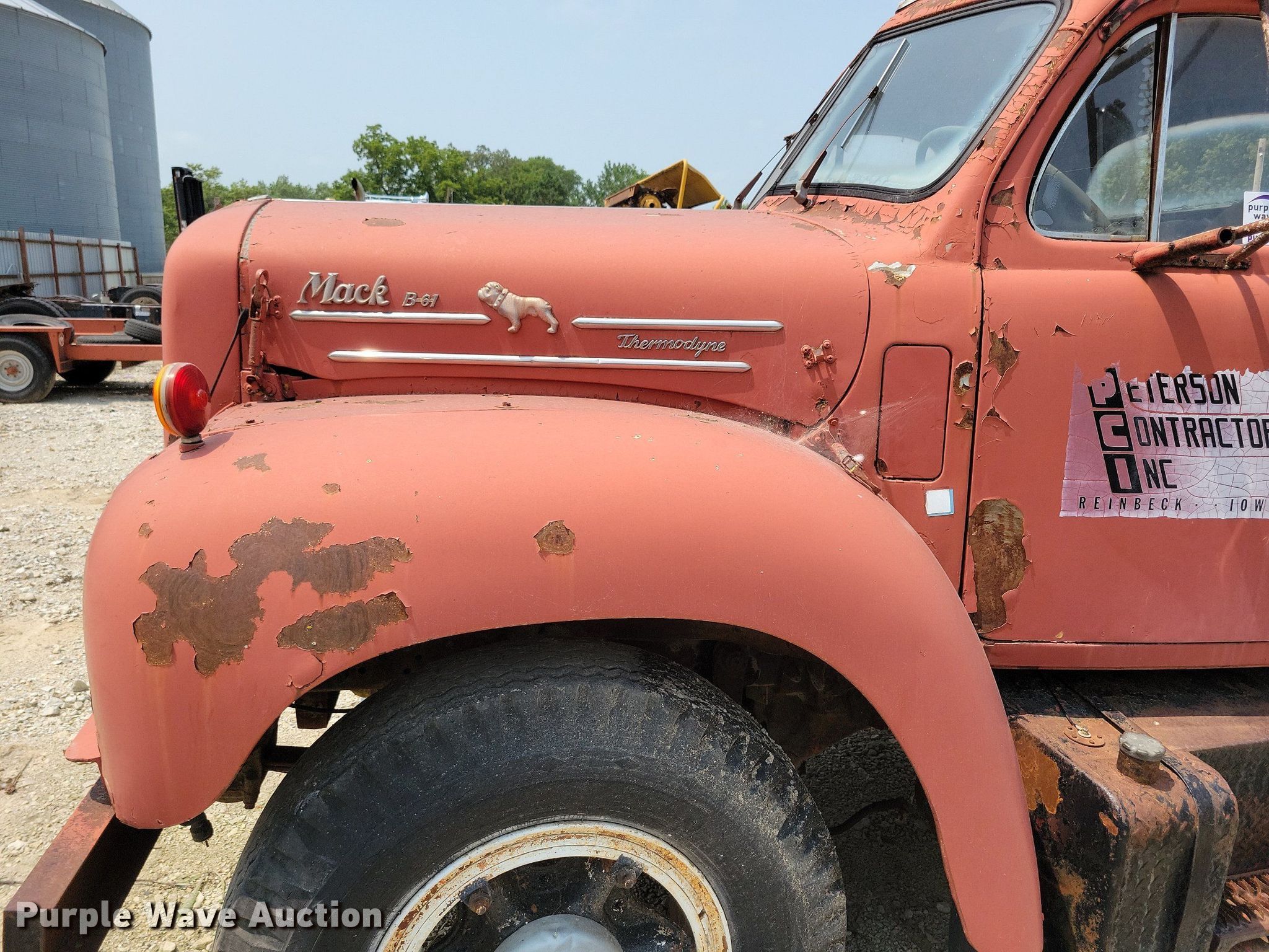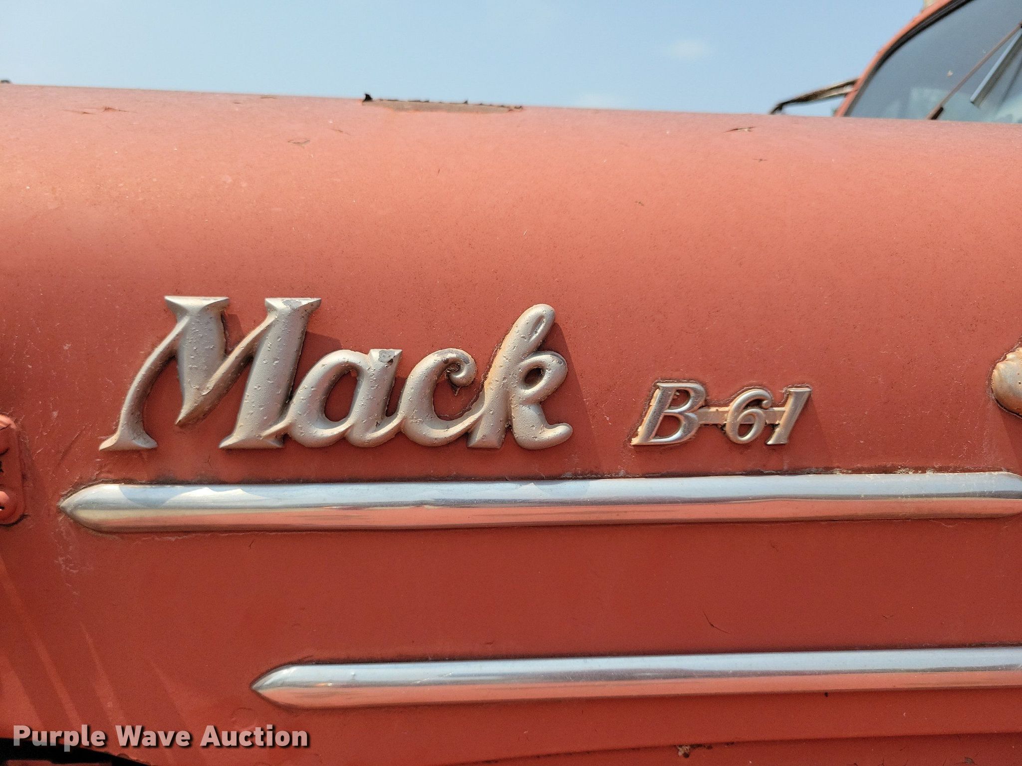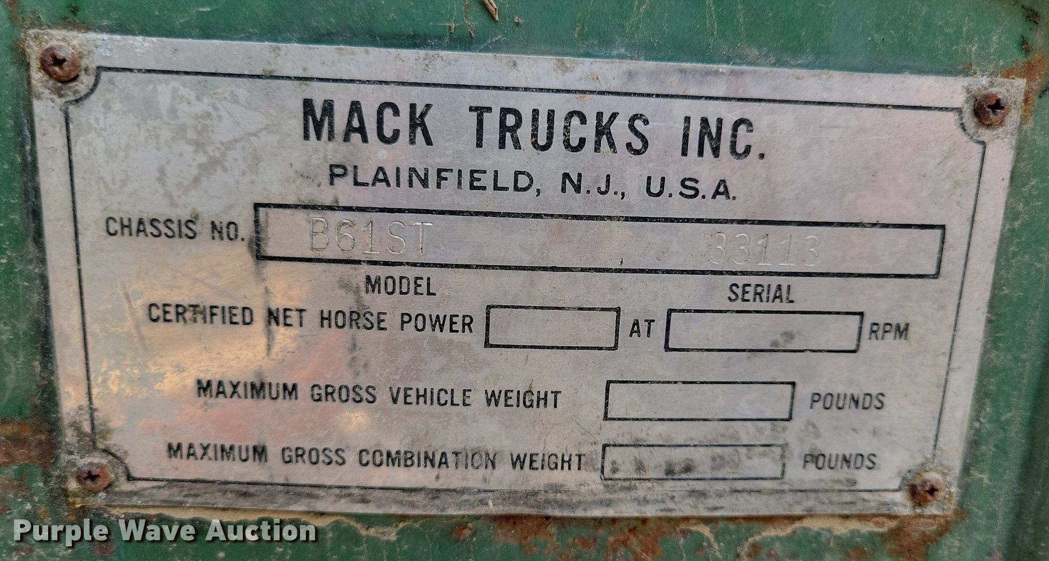 1961 Mack B61 semi truck. Miles: 94,332 on odometer, VIN: B61ST33113. Engine Mack Thermodyne, Cylinders: 6, Fuel type: Diesel. Transmission Mack Triplex, Manual, Speed: 15. Chassis Axles: Tandem, Suspension: Camelback, Brakes: Air, PTO, Wet kit. Features Deck plate: Steel, Fifth wheel type: Sliding, Fuel tank: Dual. Tires Size: 10-20. Notes Non-operational unit. Iowa title. Seller is an Iowa licensed motor vehicle dealer. The buyer may be required to pay sales tax and/or registration fees to the dealer prior to taking possession. Title will be assigned and distributed by the dealer. Please contact the seller for distribution questions. BC Murphy Enterprises, LLC. Anita, IA 50020