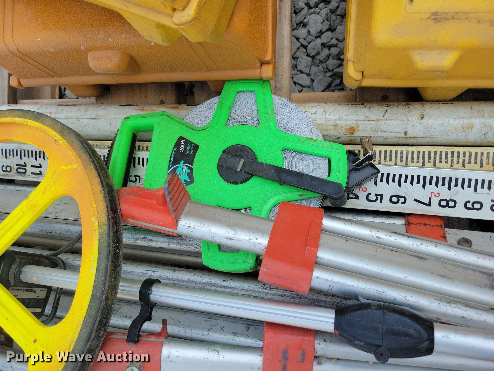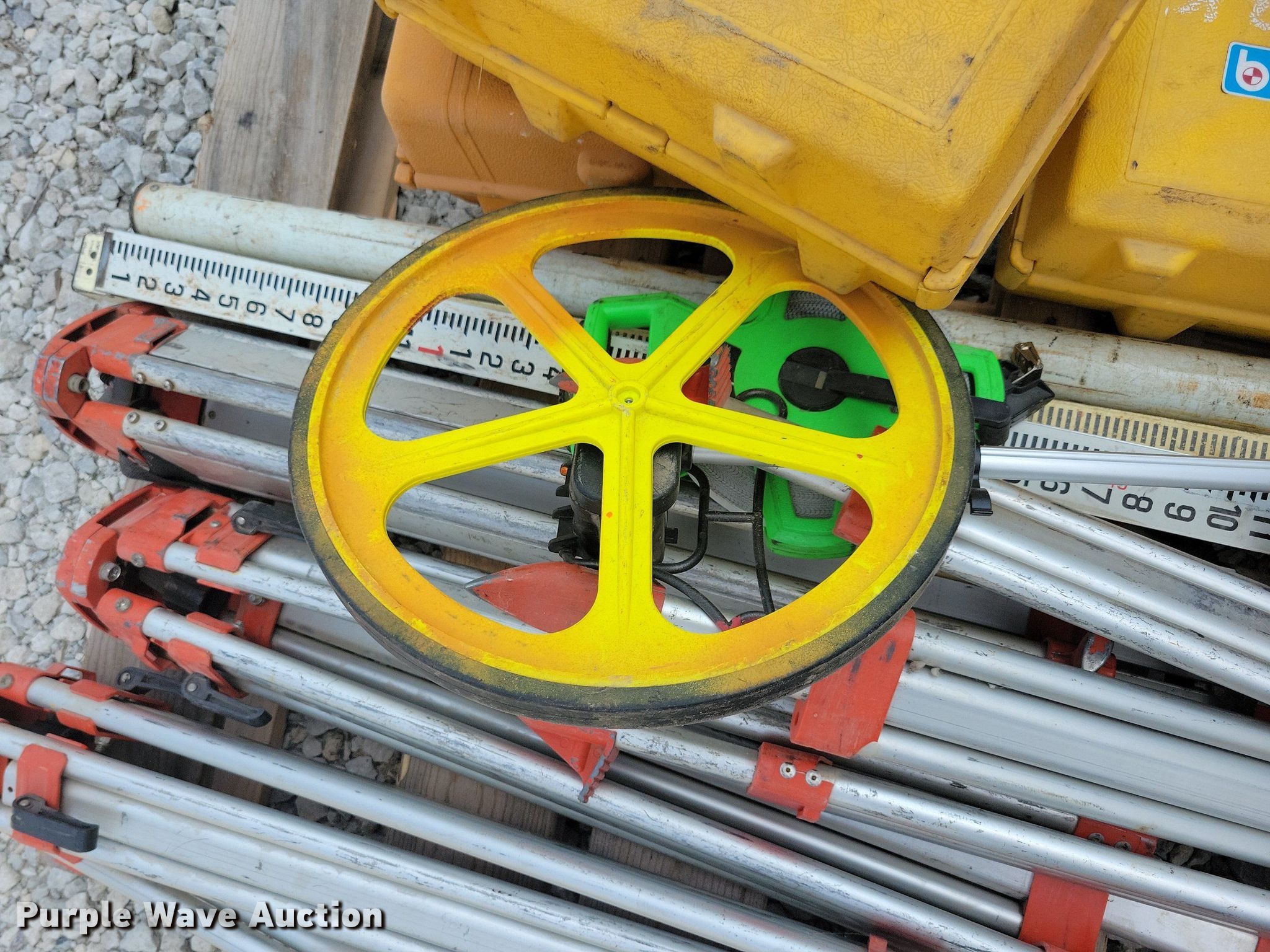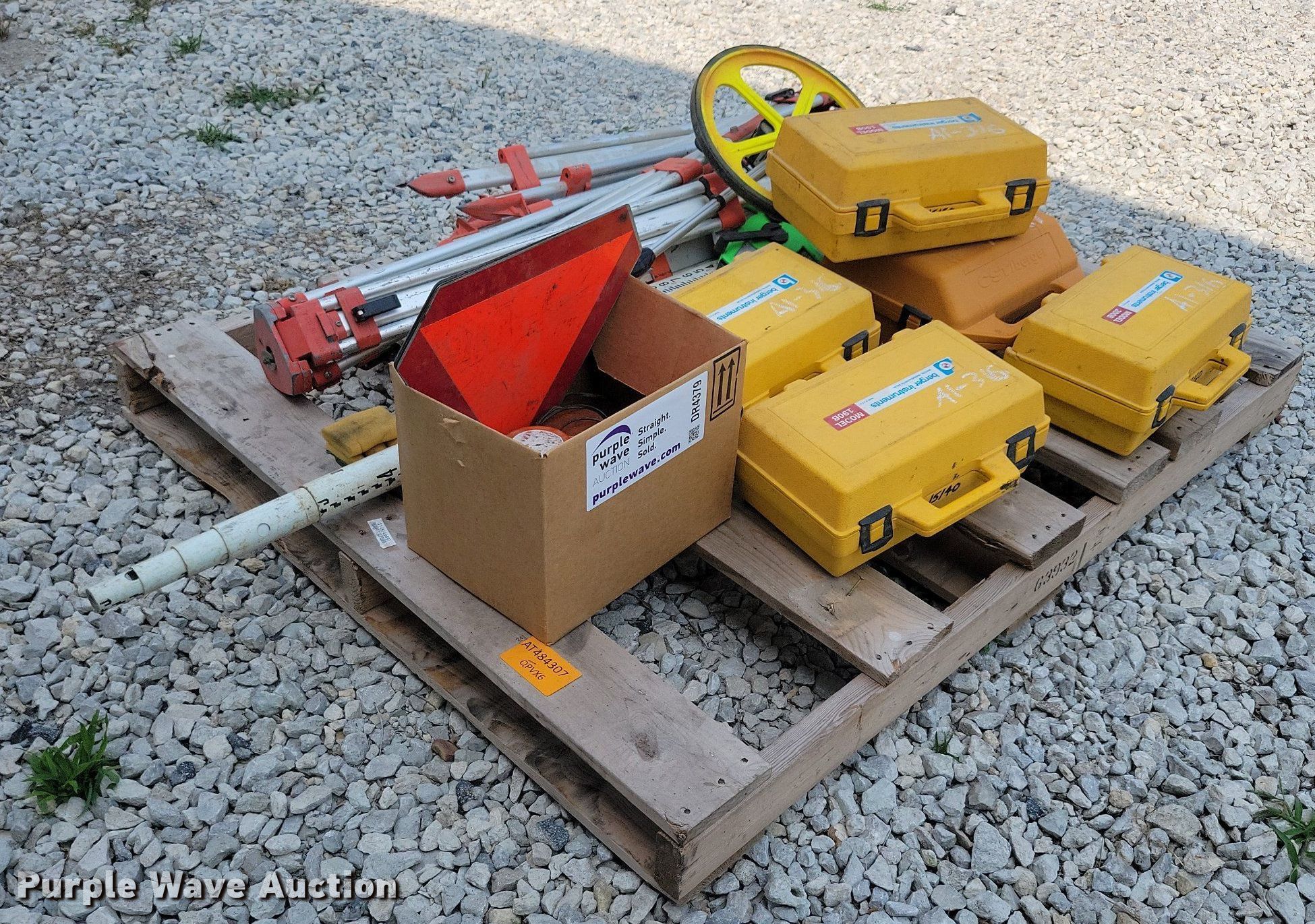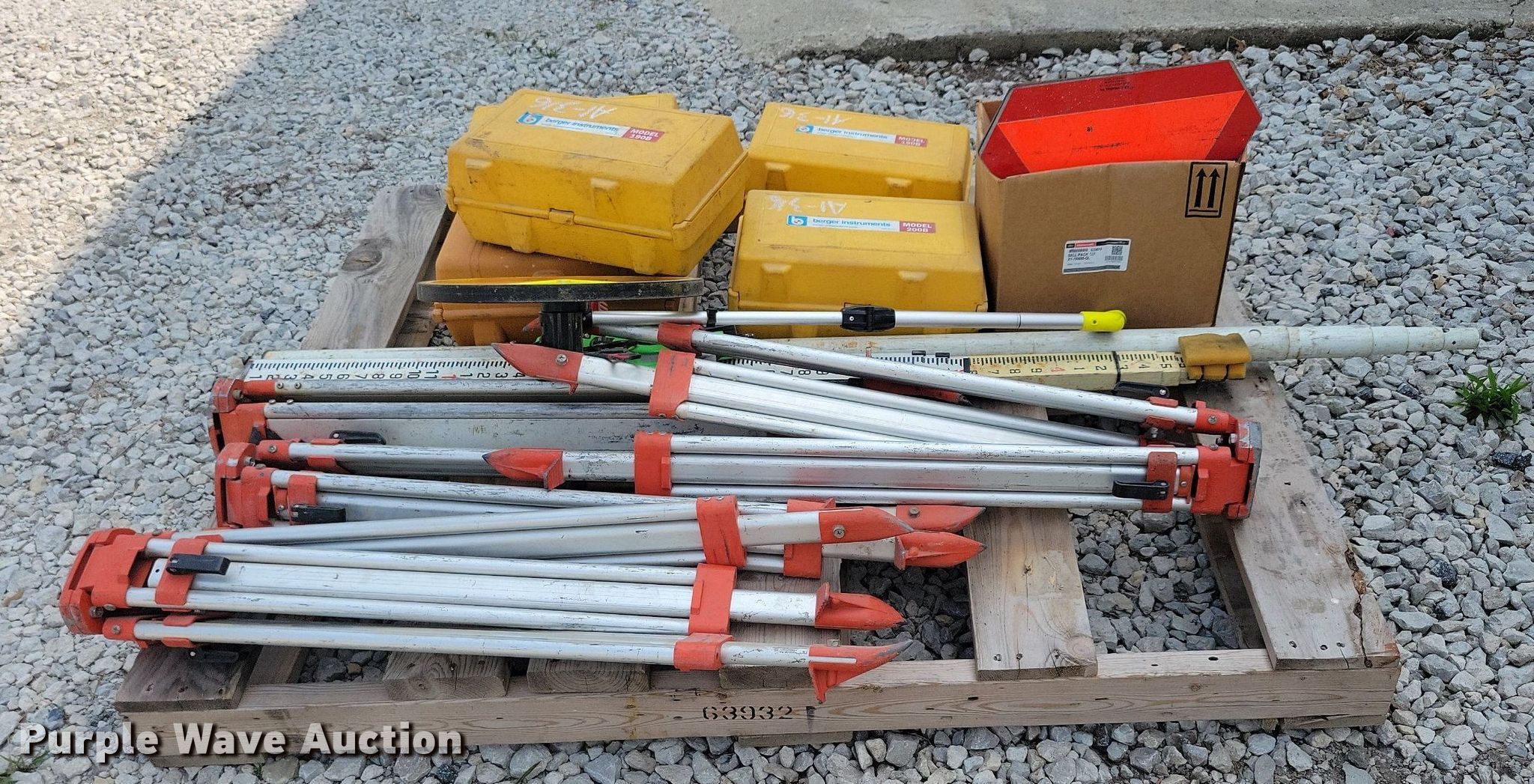 Purple Wave is selling a used Surveying Equip. in Iowa. This item is a Berger Instruments surveying equipment with the following: (5) levels, (4) tripods, 200' tape measure, Height sticks, Distance measuring wheel, Lights
