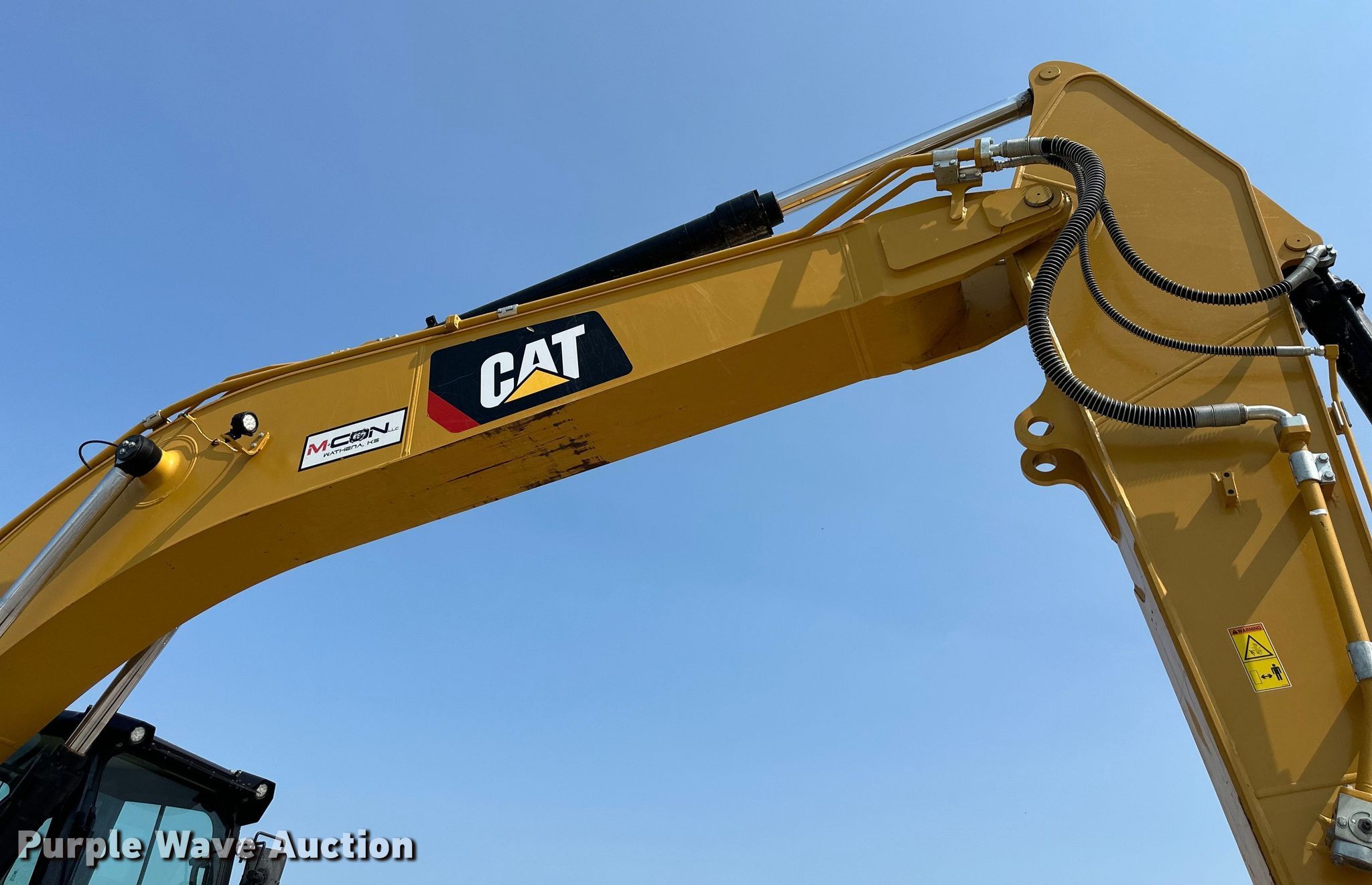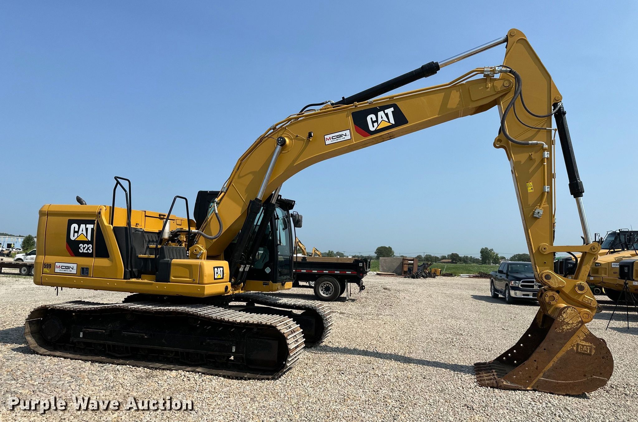 2019 Caterpillar 323 excavator. Hours: 3,557 on meter, Serial: CAT00323JRAZ10474. Engine Caterpillar C7.1 Acert, Displacement: 7.1L, Cylinders: 6, Fuel type: Diesel. Transmission Hydrostatic, Two speed travel. Operators station Enclosed cab, AC, Heat. Features Auxiliary hydraulics Two-way, Boom Standard, Stick Stick length: 9' 7", Quick coupler: Hydraulic Caterpillar, Bucket Caterpillar, Width: 54", Teeth: 7. Tracks Width: 31", Steel, Grouser pads: Triple. M CON, LLC. Wathena, KS 66090