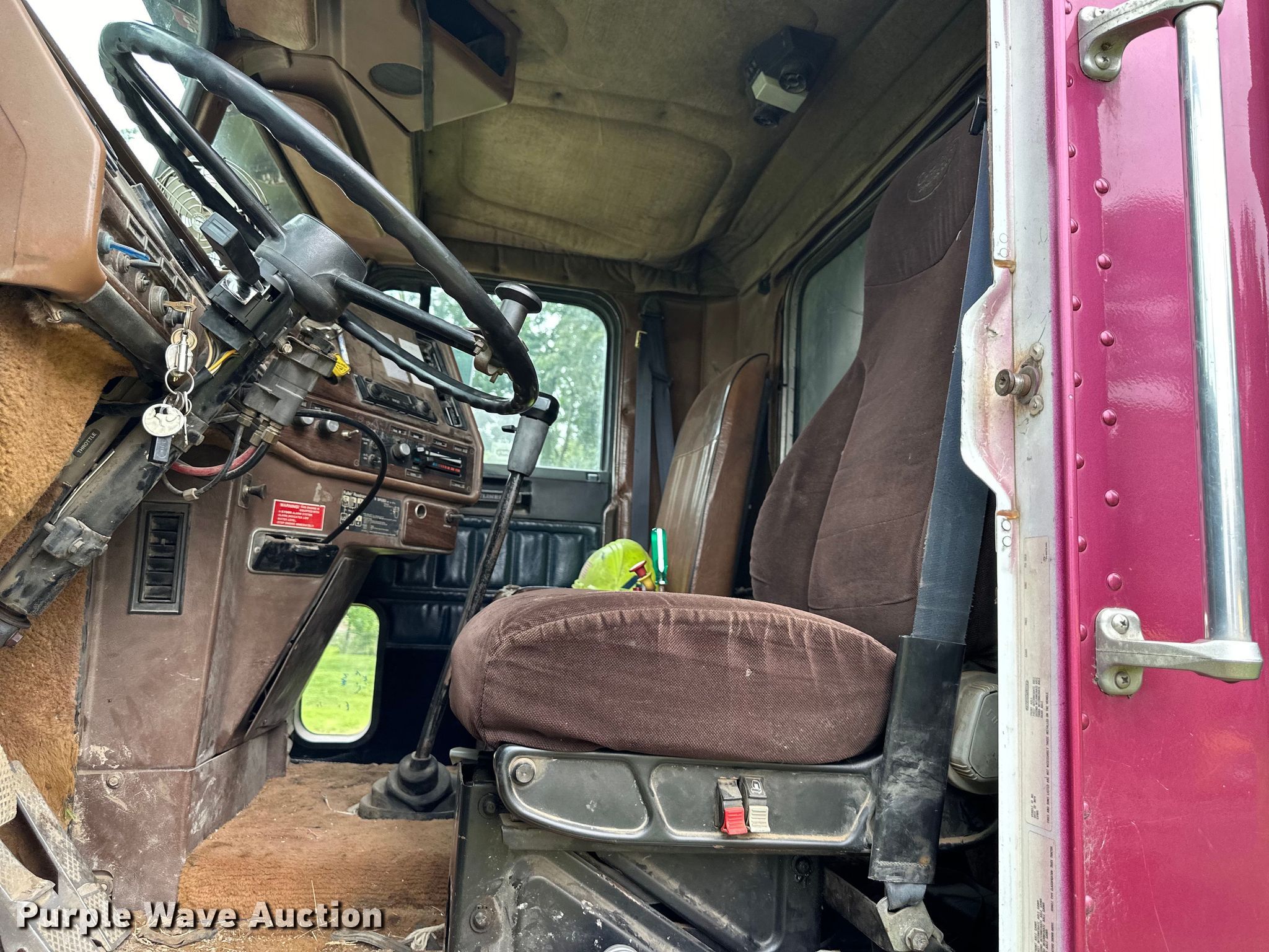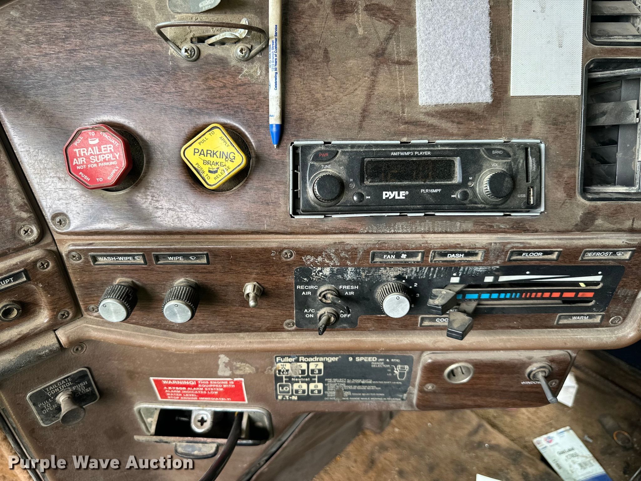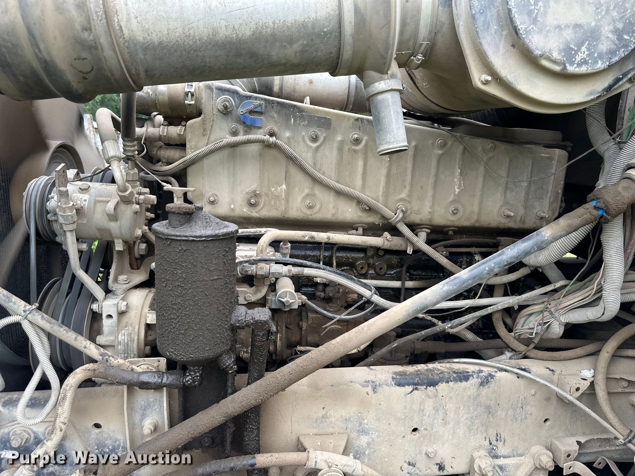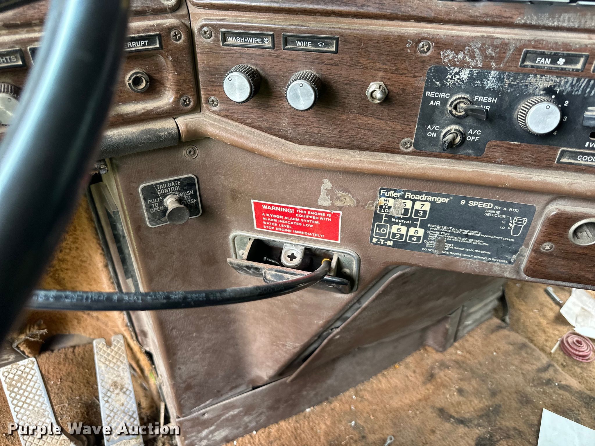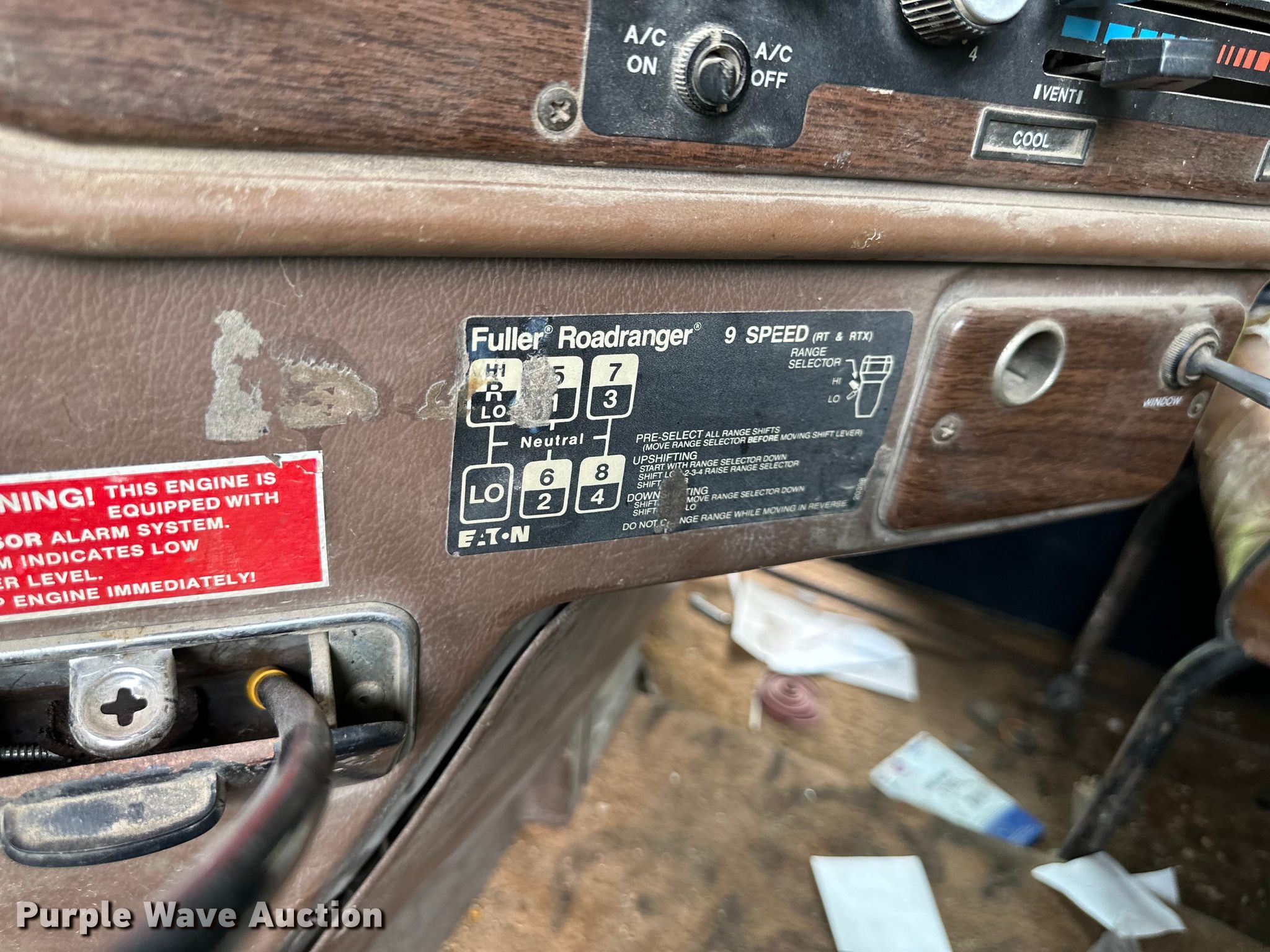 1988 Freightliner FLC dump truck. Miles: 17,096 on odometer, VIN: 1FUPYCYBXJP312584. Engine Cummins, Displacement: 14.0 L, Cylinders: 6, Fuel type: Diesel. Transmission Manual, Speed: 9. Chassis Axles: Tandem, Pusher axle, Differential lock: Inter-axle, Suspension: Spring, Brakes: Air, PTO. Interior AC, Heat. Features Dump bed 15' L x 96" W, Side height: 54", Bed type: Steel, Ram: Single, End gate: Air operated. Tires Front: 385/65R22.5, Rear: 11R22.5, Lift axle: 275/80R22.5. Notes Battery issues, parts may be missing, Dead battery. Kansas title. Exchange National Bank & Trust. Rushville, MO 64484