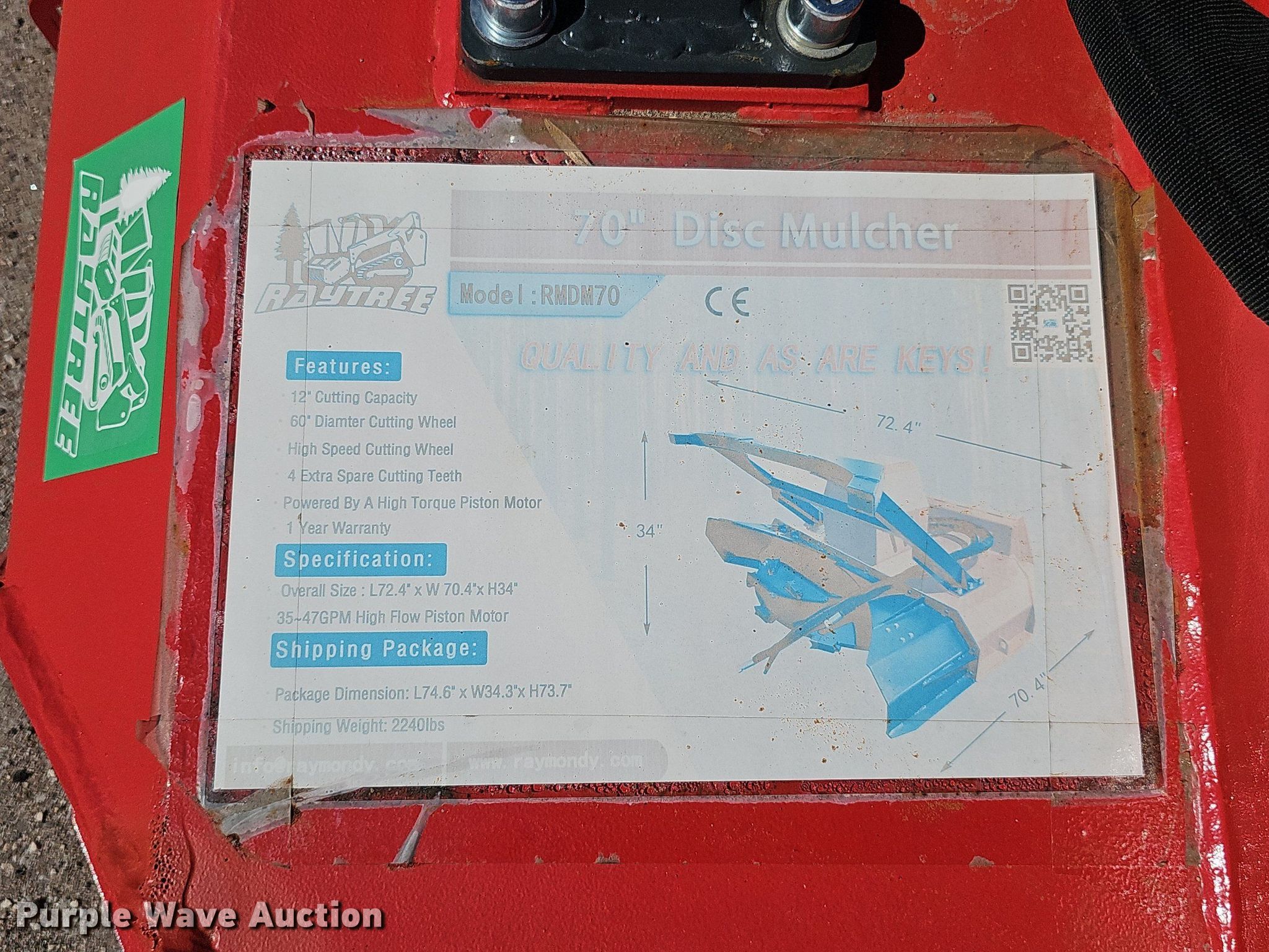 Purple Wave is selling a used Skid Steer Attach. in Nebraska. This item is a 2024 Raytree RMD70 skid steer mulcher with the following: Serial: DM20240410060, Width: 70", Cutting capacity: 12", Cutting wheel: 60"