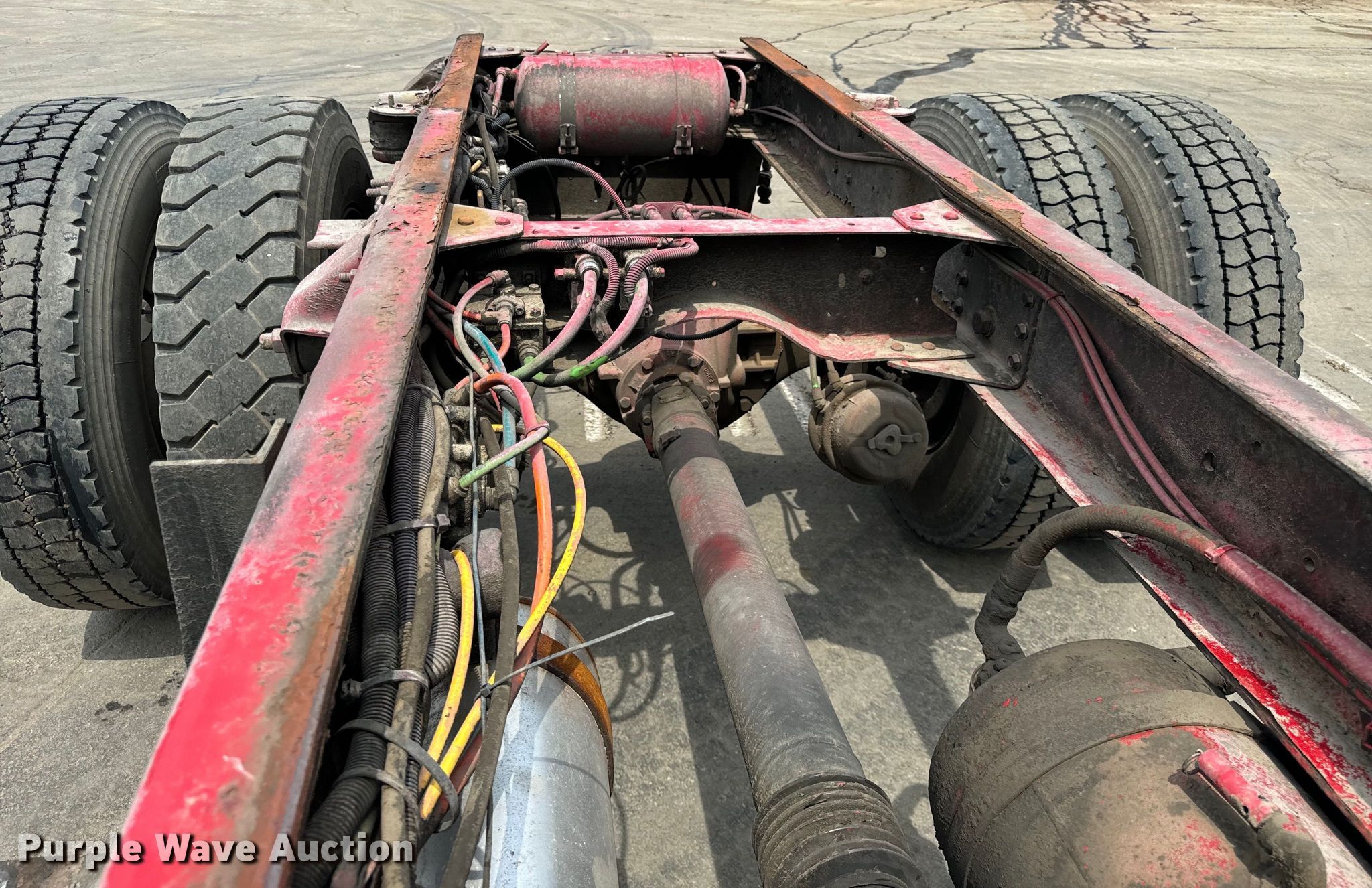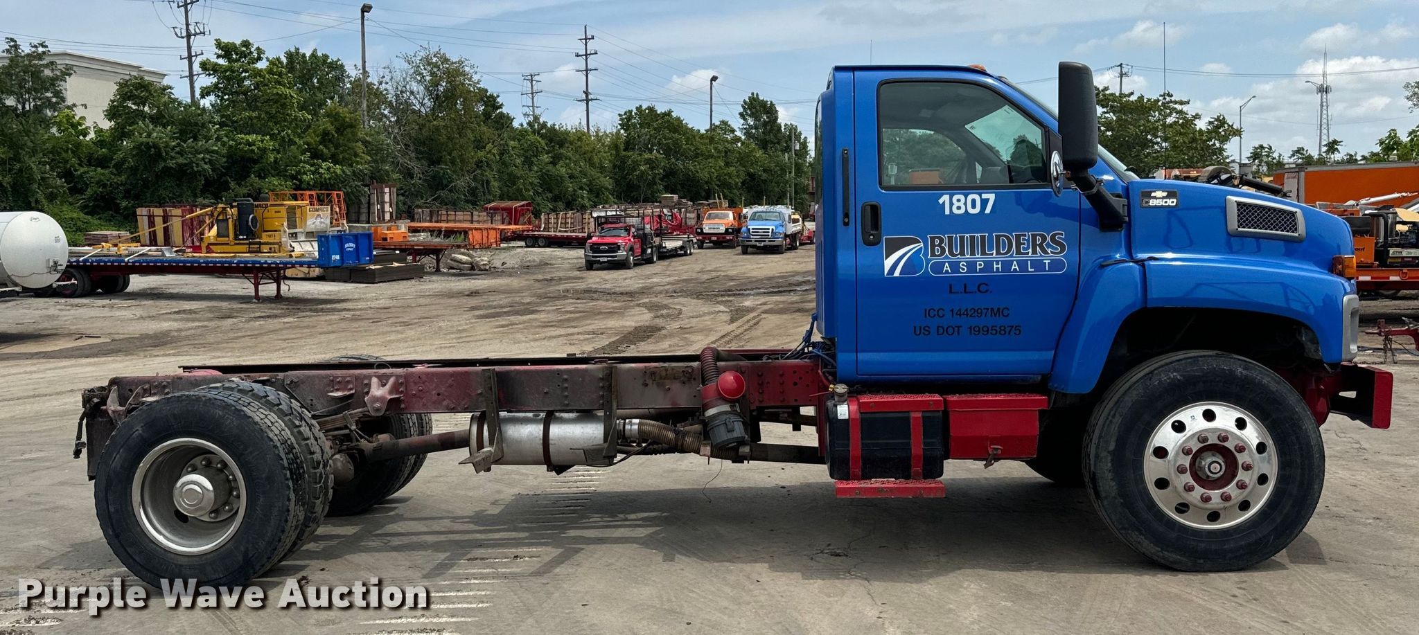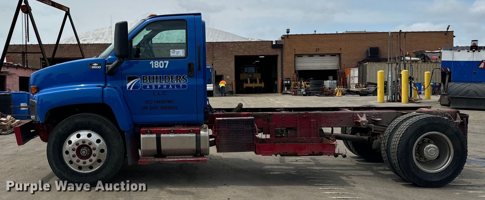 2005 Chevrolet C8500 truck cab and chassis. Miles: 113,046 on odometer, VIN: 1GBM8C1C45F522451, Unit #: 1807. Engine Caterpillar, Displacement: 7.2L, Fuel type: Diesel. Transmission Manual, Speed: 6. Chassis Axles: Single, Suspension: Spring, Brakes: Air, PTO, Truck chassis: 13' 10". Interior AC, Heat, Cruise control. Features Fuel tank: Dual. Tires Size: 11R22.5. Notes Dash warning indicator: Low air. Illinois title. Builders Asphalt, LLC. Hillside, IL 60162