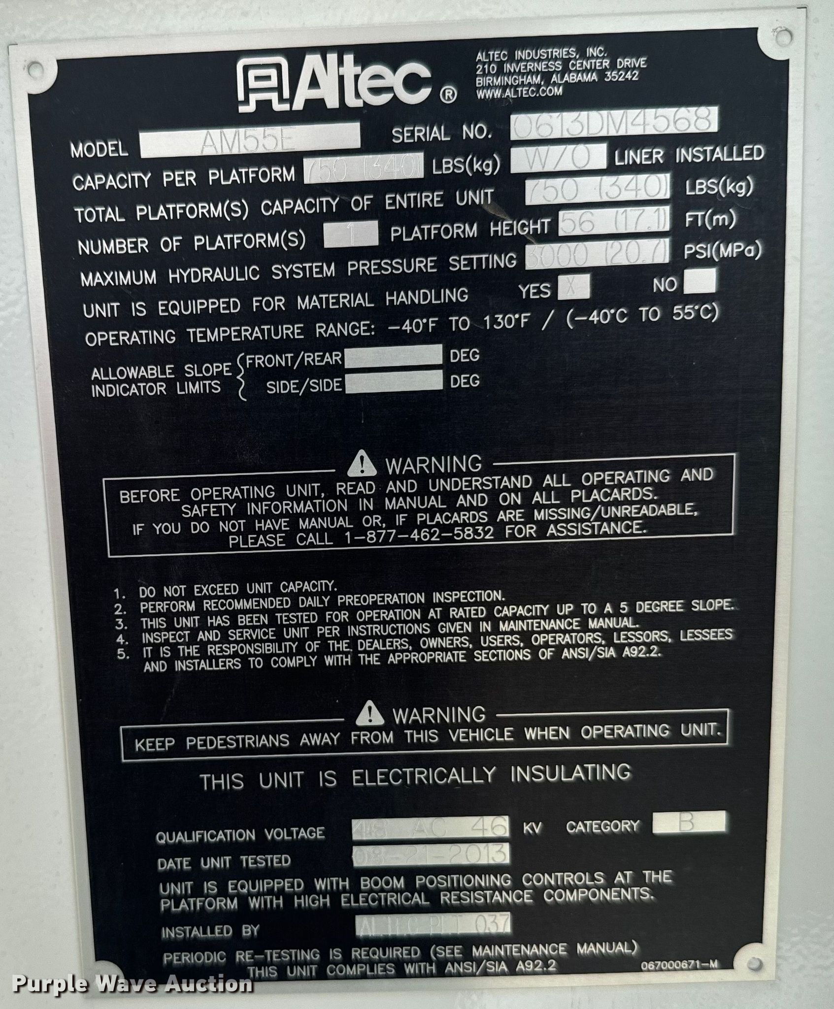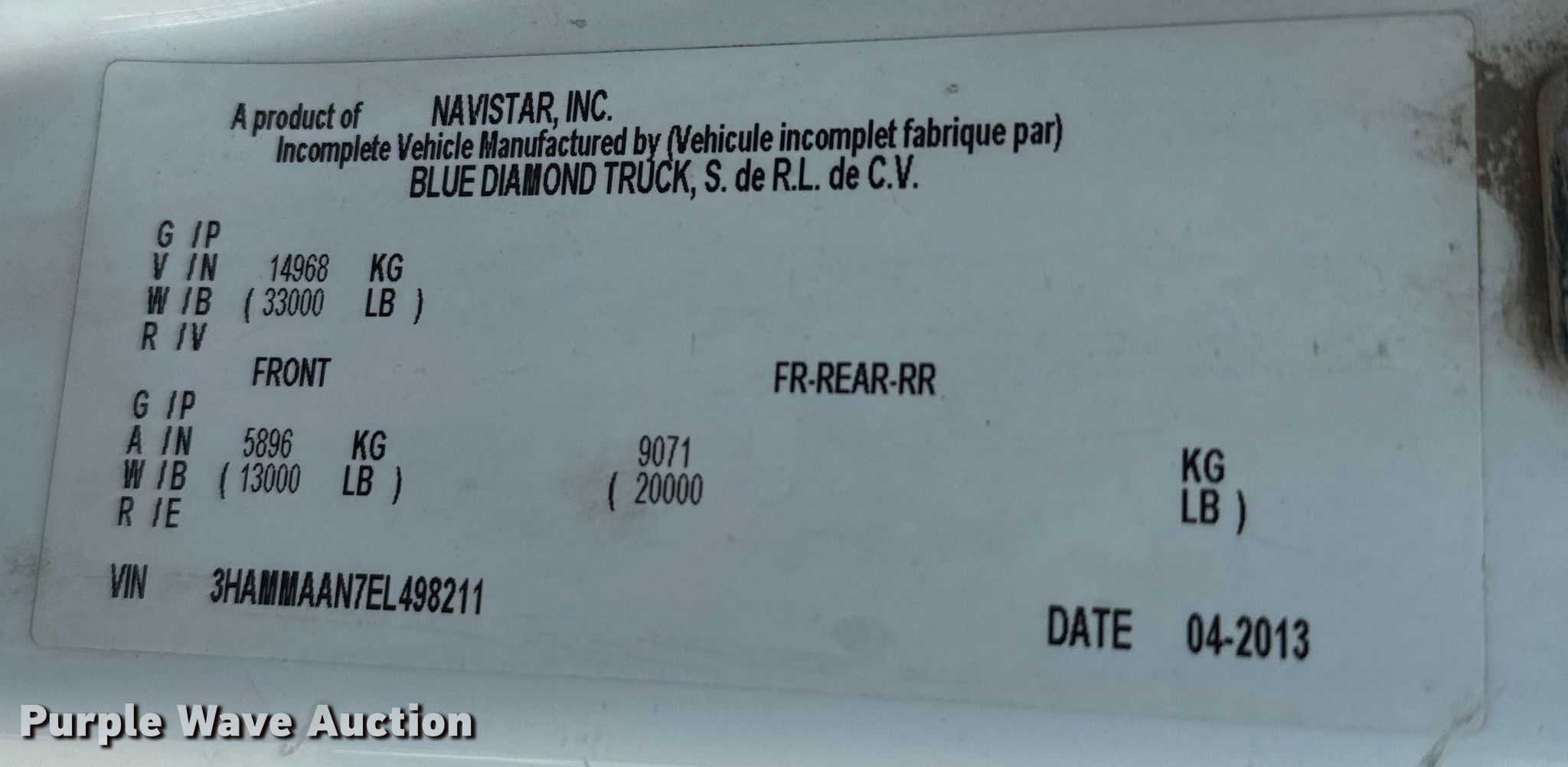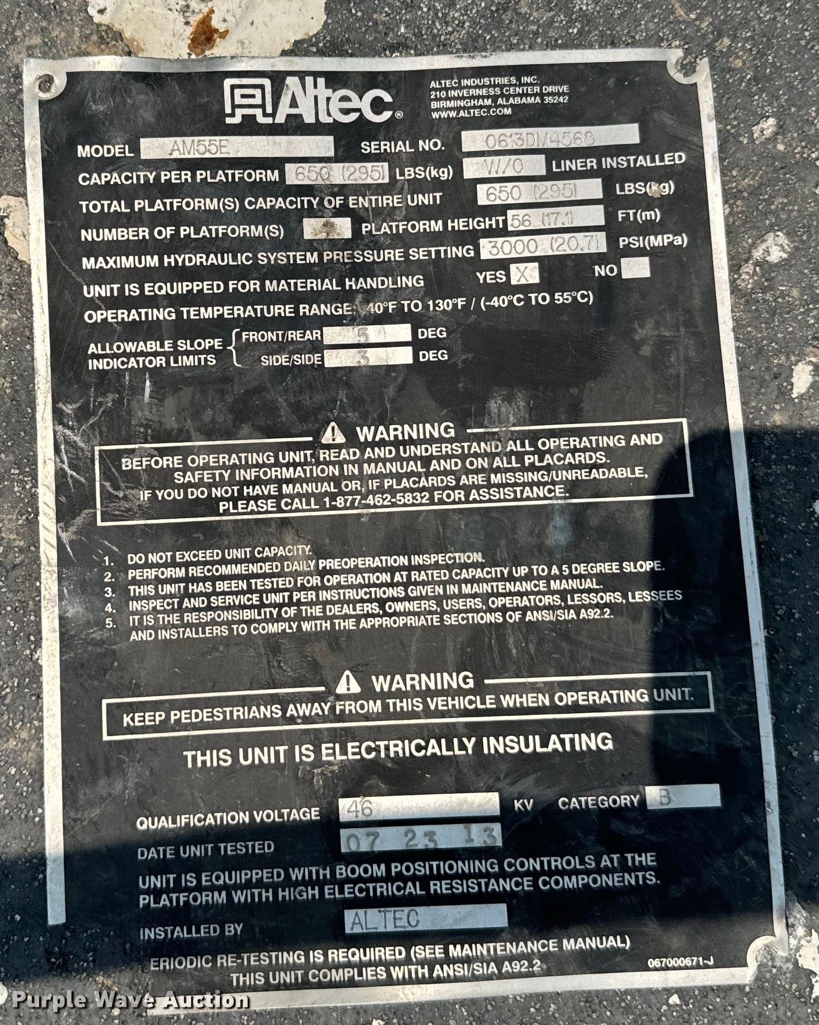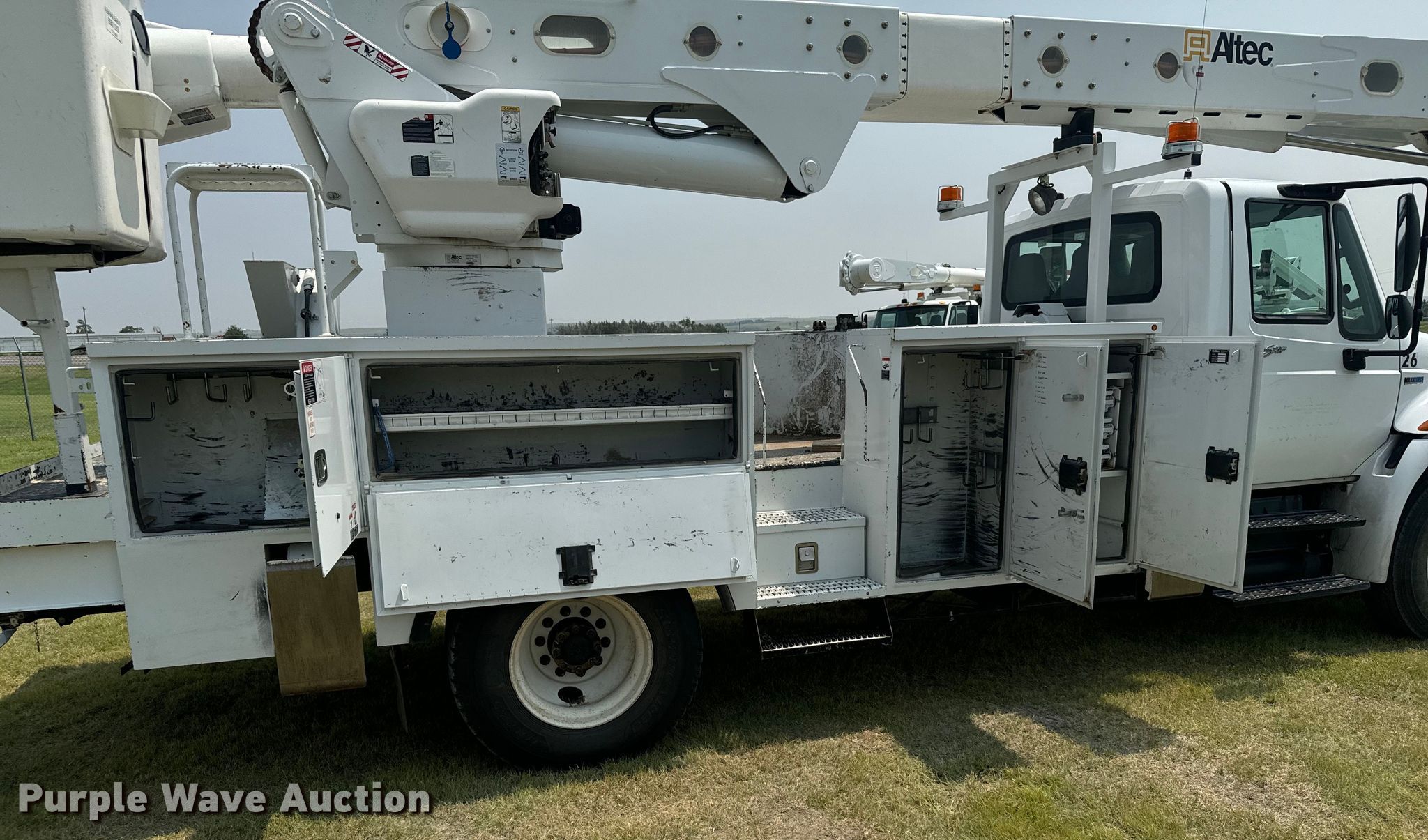 2014 International DuraStar 4300 bucket truck. Miles: 128,787 on odometer, Hours: 9,468 on meter, VIN: 3HAMMAAN7EL498211. Engine International MaxxForce DT, Displacement: 7.6L, Cylinders: 6, Fuel type: Diesel. Transmission Allison, Automatic. Chassis Axles: Single, Suspension: Spring, Brakes: Air, PTO, GVWR: 33,000 lbs. Interior AC, Heat, Cruise control, Auxiliary controls. Features Bed 16' 2" L x 96" W, Boom Altec AM55E, Serial: 0613DM4568, Mast height: 56', Maximum lift capacity: 750 lbs, Maximum lift height: 48', Boom type: Articulating, Insulated, Man basket, Boom controls Ground, Platform/ basket, Material handler. Tires Size: 11R22.5. Notes Dash warning indicator: Check engine. Kansas title. Title distribution may be delayed up to 14 days from verification of funds. Prairie Land Electric Coop Inc.. Norton, KS 67654