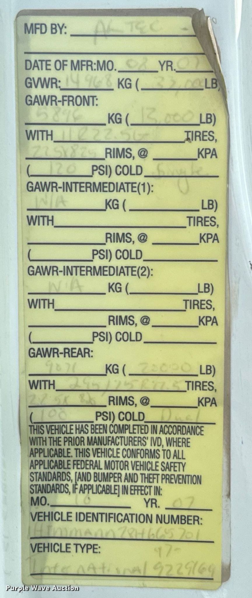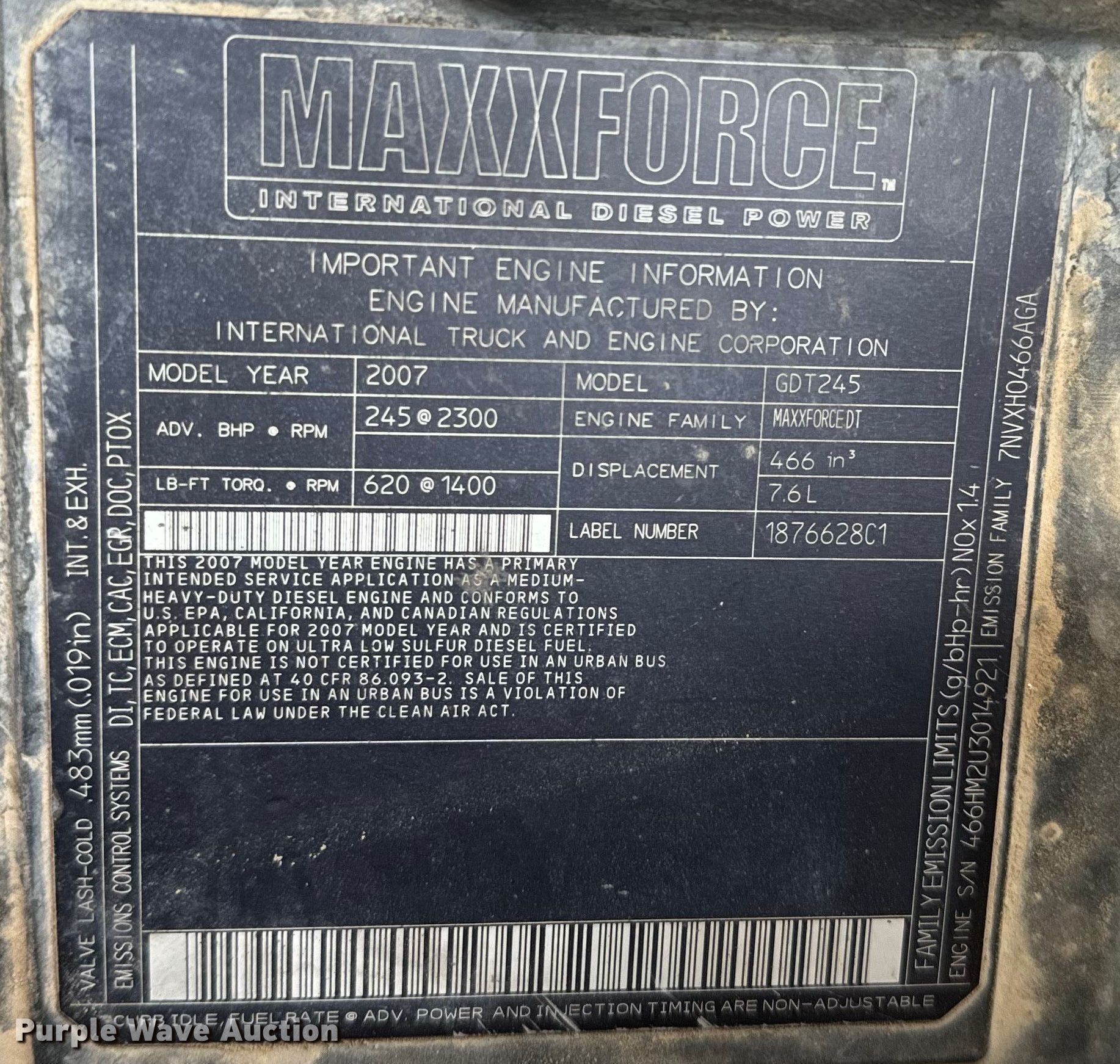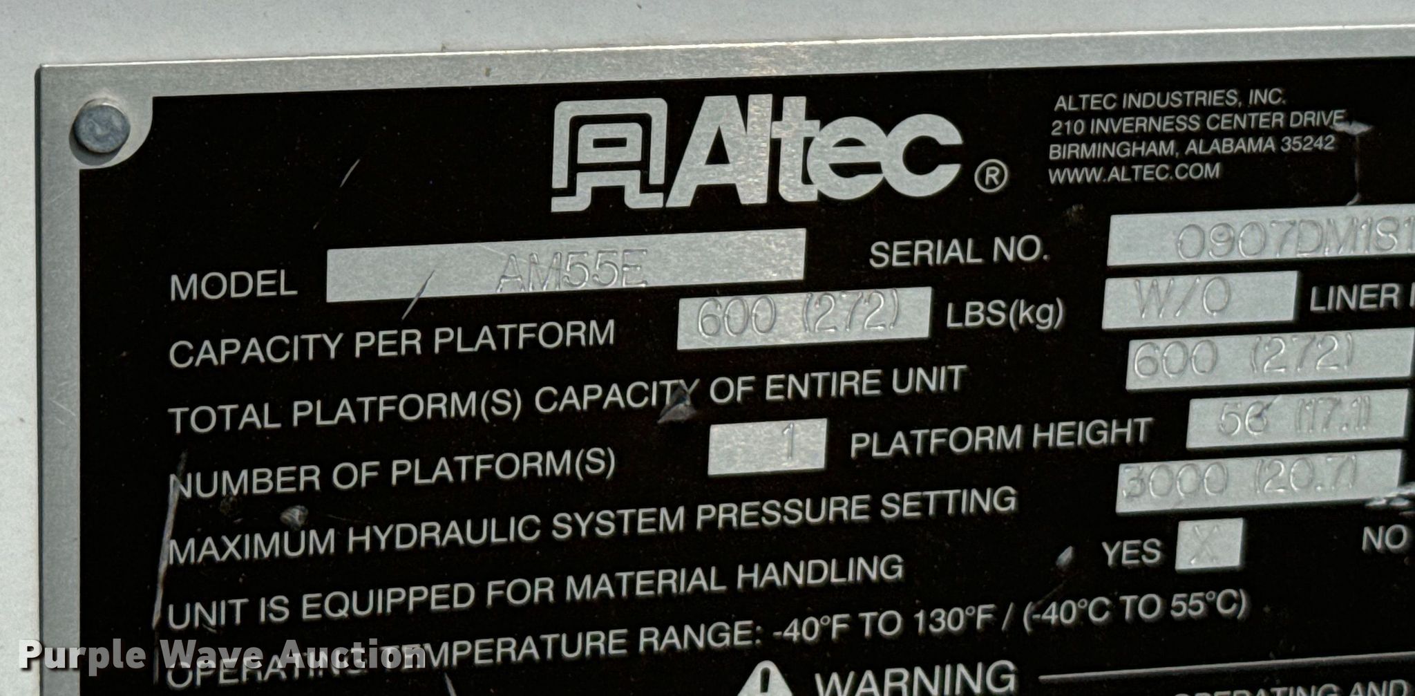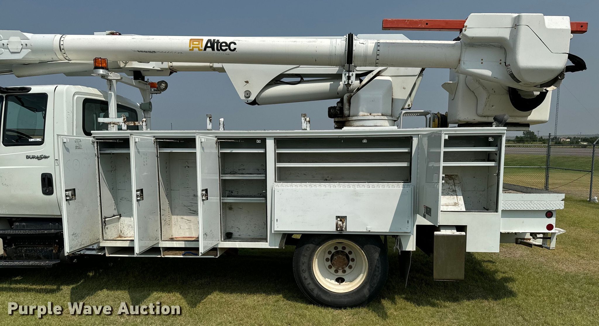 2008 International DuraStar 4300 bucket truck. Miles: 131,583 on odometer, Hours: 12,850 on meter, VIN: 1HTMMAAN28H665701. Engine International MaxxForce DT, Displacement: 7.6L, Cylinders: 6, Fuel type: Diesel. Transmission Allison, Automatic. Chassis Axles: Single, Suspension: Spring, Brakes: Air, PTO, GVWR: 33,000 lbs. Interior AC, Heat, Auxiliary controls. Features Bed 16' 2" L x 96" W, Boom Altec AM55E, Serial: 0907DM1813, Mast height: 56', Maximum lift capacity: 600 lbs, Maximum lift height: 48', Boom type: Articulating, Insulated, Man basket, Boom controls Ground, Platform/ basket, Material handler. Tires Size: 11R22.5. Kansas title. Title distribution may be delayed up to 14 days from verification of funds. Prairie Land Electric Coop Inc.. Norton, KS 67654