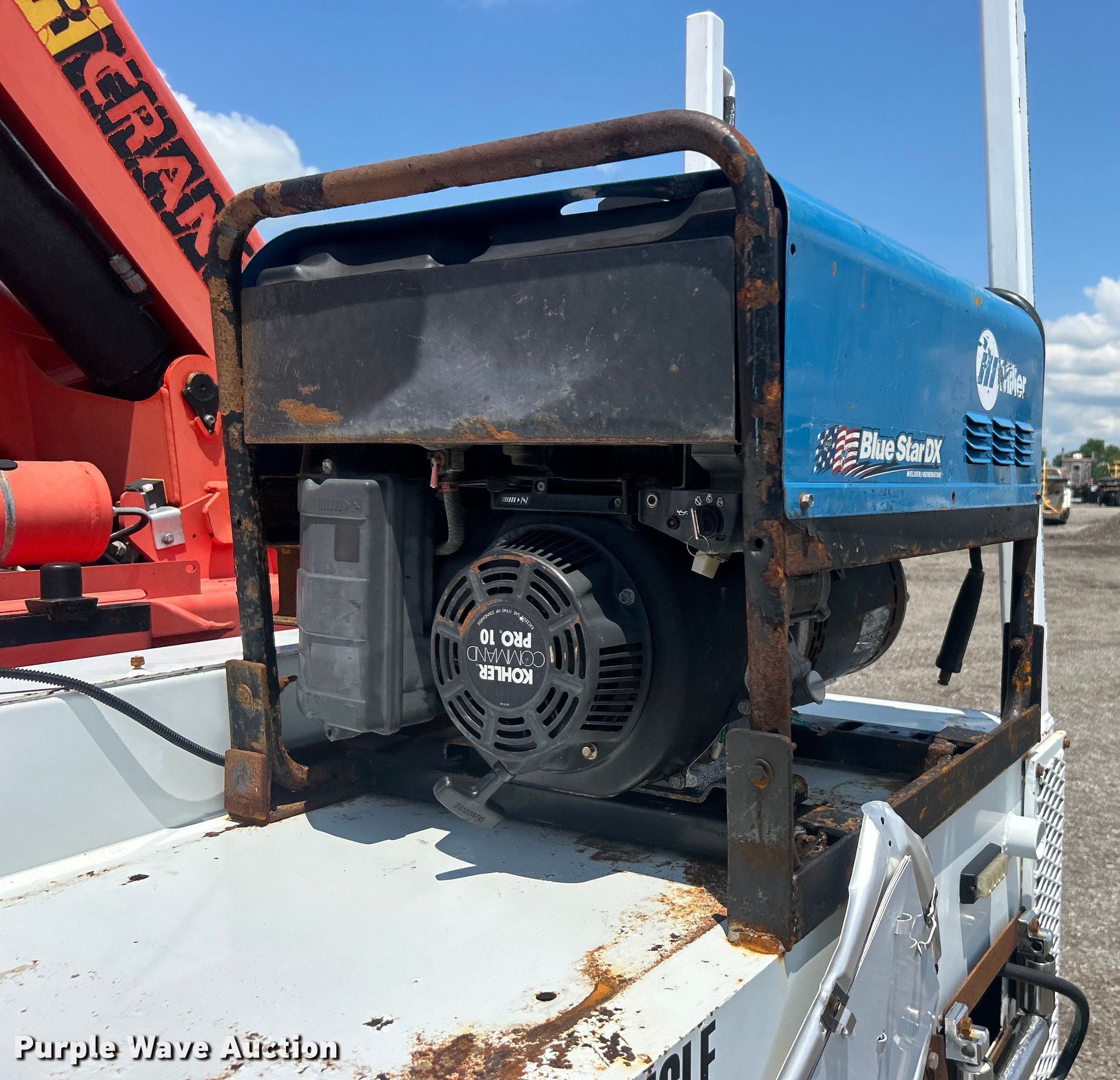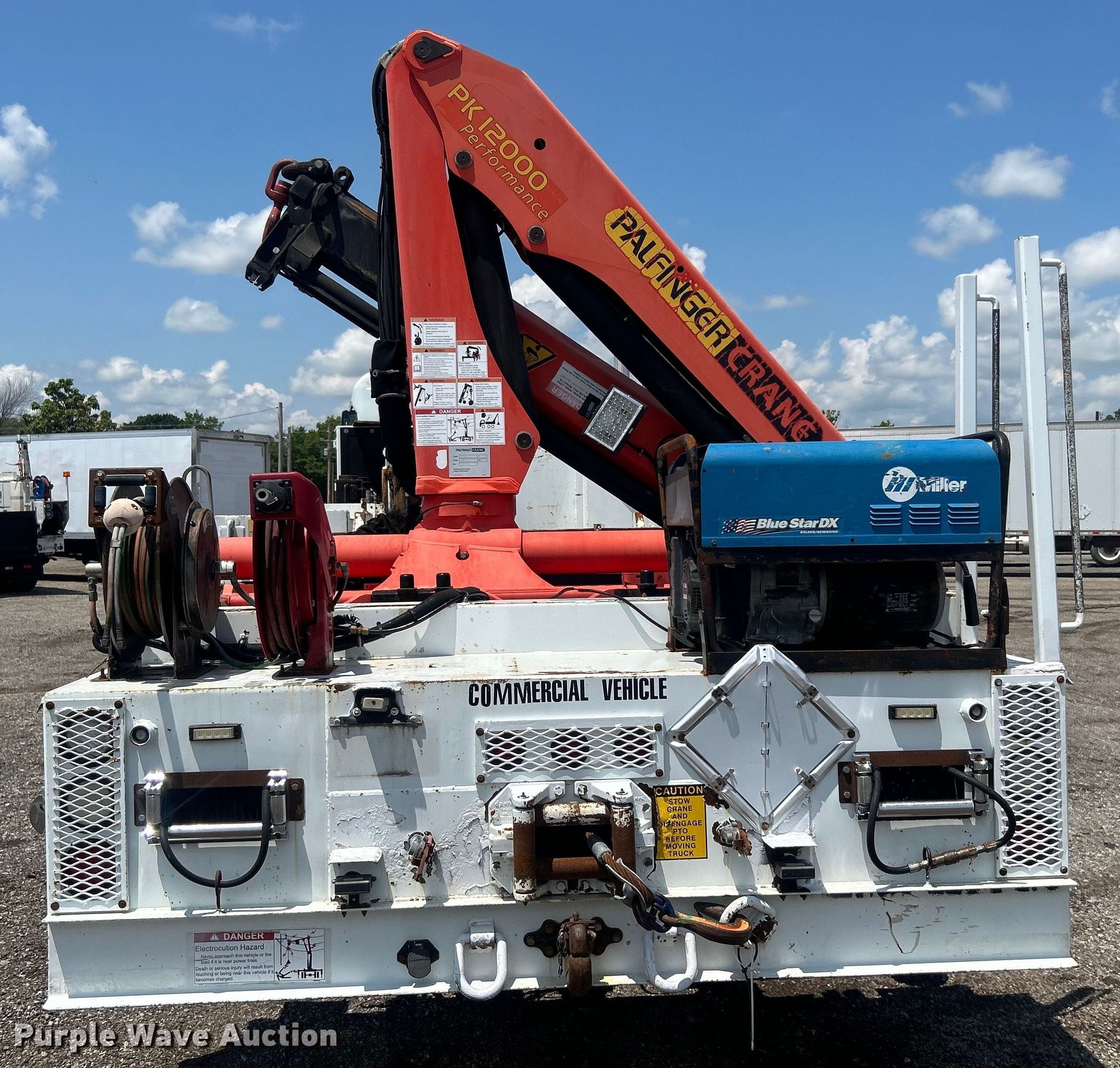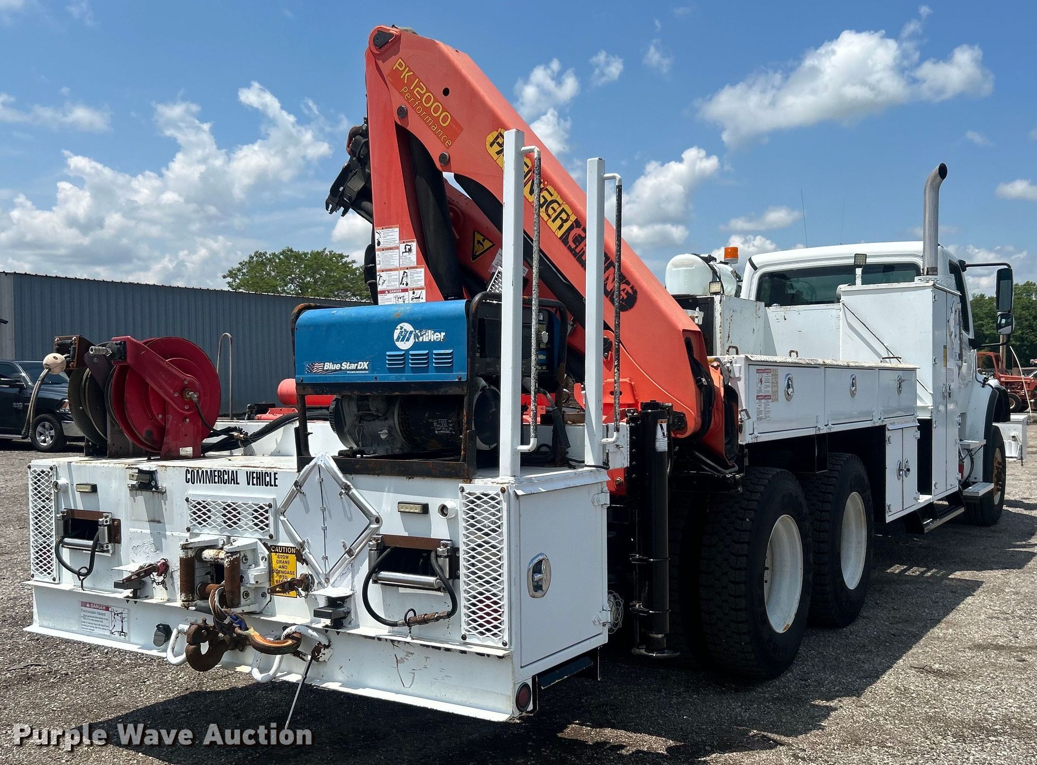2010 Freightliner Business Class M2 crane truck. Miles: 136,193 on odometer, VIN: 1FVHC7CV3ADAR2457. Engine Mercedes Benz OM460LA, Displacement: 12.8L, Cylinders: 6, Fuel type: Diesel, HP: 450, kW: 335, Engine brake. Transmission Automatic. Chassis Axles: Tandem, Suspension: Air, Brakes: Air, GVWR: 56,000 lbs. Interior AC, Heat, Heated mirrors, Cruise control, Auxiliary controls, Brake controller. Features Bed 16' 10" L x 96" W, Welder/generator Miller Blue Star 125, Hours: 64 on meter, Fuel type: Diesel, 240V outlets: 1, 120V outlets: 4, Watts: 4,500, Welder Welder type: Tig, Stick (AC/DC), Oil/lube system Hose reels, Crane Palfinger PK12000, Maximum boom length: 46' Maximum lift capacity: 14,970 lbs, Hi-rail system. Tires Front: 11R22.5, Rear: 316/80R22.5. Notes Windshield chipped or cracked, Unknown operating condition of welder/generator. Oklahoma title. Title distribution may be delayed up to 14 days from verification of funds. 15107 North 137th East Avenue. Collinsville, OK 74021