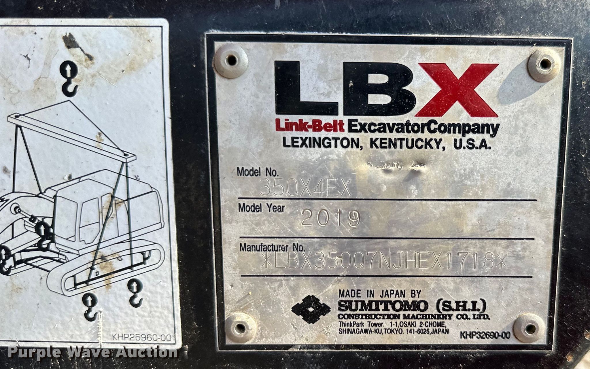 Purple Wave is selling a used Hydraulic Excavator in Kansas. This item is a 2019 Link-Belt 350X4 excavator with the following: Hours: 7,027 on meter, Serial: LBX35007NJHEX1718